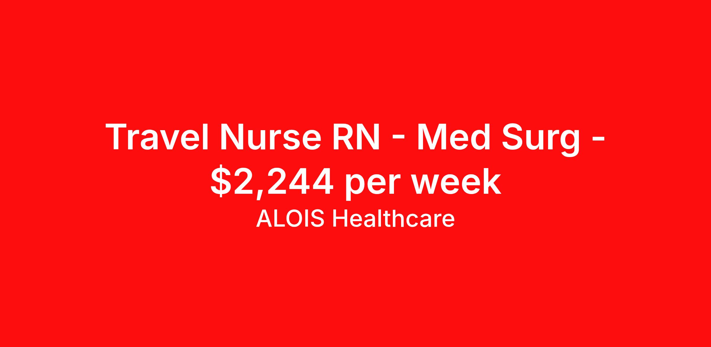 ALOIS Healthcare is seeking a travel nurse RN Med Surg for a travel nursing job in Kalamazoo, Michigan. Job Description & Requirements Specialty: Med Surg Discipline: RN Start Date: 04/20/2026 Duration: 13 weeks 36 hours per week Shift: 12 hours, nights Employment Type: Travel Assessing, planning, implementing, and evaluating patient care plans in consultation with healthcare professionals. Evaluating medical information, as well as providing direct and individualized bedside nursing care to pre and post-surgery patients. ALOIS Healthcare Job ID 17994674. Pay package is based on 12 hour shifts and 36.0 hours per week (subject to confirmation) with tax-free stipend amount to be determined. Posted job title: RN MS About ALOIS Healthcare Why ALOIS Healthcare? ALOIS means “brave warrior” and that’s what you are- Warrior in Scrubs! Just as you advocate for your patients, we will advocate for you. The pay you deserve. The support you need. We’re in your corner for every battle – because you shouldn’t settle for anything less when it comes to your career. We offer: · Industry-leading pay Generous cost of living and housing stipends · Opportunities for referral, sign-on, and extension bonuses · Weekly health insurance or health insurance Marketplace weekly bonus · Continuing education credits We’re proud to be recognized globally as a certified minority-owned staffing supplier. At ALOIS Healthcare: · Everyone Matters · We are Performance Driven · We are Open, Honest and Direct · We are Transparent · We are Inclusive · We Do the Right Thing We care about you - and your success is our success.