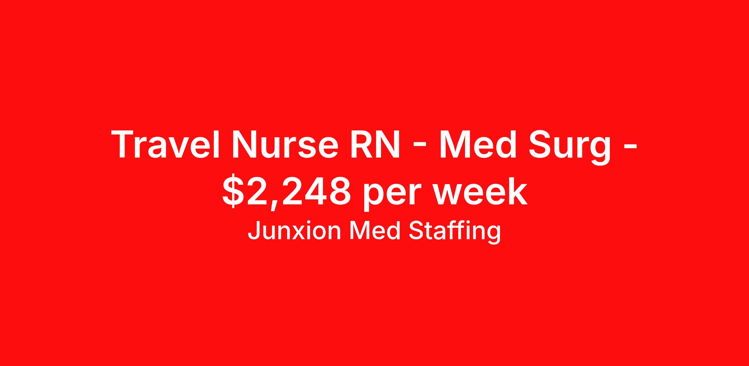 Junxion Med Staffing is seeking a travel nurse RN Med Surg for a travel nursing job in Neenah, Wisconsin. Job Description & Requirements Specialty: Med Surg Discipline: RN Start Date: 03/30/2026 Duration: 13 weeks 36 hours per week Shift: 12 hours, nights Employment Type: Travel Summary: Junxion Med Staffing is looking for a Med surg RN to take an assignment in Neenah, Wisconsin. This assignment lasts 12.86 WEEKS and is scheduled to start on March 30, 2026. If you don't like the start date, pay, or shift, then let’s talk. Give us a call opt 1 Job Details: Shift: 12H Nights Total Weekly Hours: 36 Certifications: BLS, WI RN License, AHA BLS Trauma Level: Benefits: Day 1 Insurance Additional bonus potential for every contract Additional vacation incentives Medical insurance with no more than $175 monthly premium for employee Employee Assistance Program (EAP) Referral bonus up to $1,000 401K and access to financial advisors for financial wellness and education A dedicated recruiter and support team that will help you every step of the way to sure you start on time and have an exceptional experience An agency ran by a traveler for travelers Click here for licensing requirements About the Company: Junxion Med Staffing is an award-winning healthcare staffing company with a mission to provide quality healthcare to our communities. Apply today to speak with a recruiter! Awards: RNVIP- Top 10 Travel Nursing Agencies of 2024 BluePipes – The Best Travel Nursing Companies 2023 *Estimated weekly pay includes projected hourly wages and weekly meal and lodging per diems for eligible clinicians based on nationally published GSA rates. Actual weekly pay and per diems may differ from the amount shown and may be subject to change during an assignment. For all employees and employee applicants, Junxion Med Staffing is an Equal Employment Opportunity ("EEO") Employer, including Disability/Vets, and welcomes all to apply. Junxion Med Staffing Job ID 1361077. Pay package is based on 12 hour shifts and 36 hours per week (subject to confirmation) with tax-free stipend amount to be determined. About Junxion Med Staffing Junxion Med Staffing was founded by a former healthcare traveler who understands the challenges healthcare professionals face - because we’ve been there. We specialize in placing travel nurses, allied health professionals, physicians, physician assistants, and nurse practitioners in both short-term and permanent roles across a wide range of specialties. Whether you're looking for a travel contract or a long-term fit, we work to ensure the right match between each healthcare professional and facility. At Junxion, we keep it simple: ● Transparent communication. No surprises, no hidden details, just honest conversations so you always know what to expect. ● Dedicated support. From job search to contract negotiations and throughout your assignment, you’ll have a recruiter who’s with you every step of the way. ● Competitive pay and benefits. We advocate for you to be fairly compensated and supported in your goals. ● A focus on your success. When healthcare professionals feel valued and empowered, patient care improves and that’s what it’s all about. You’re not just a number here. You’re part of a team that actually cares. Let’s find your next great opportunity together. Benefits Weekly pay Referral bonus Dental benefits Vision benefits 401k retirement plan Medical benefits Mileage reimbursement