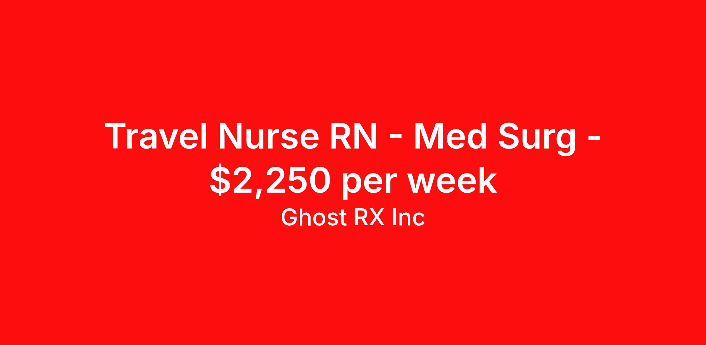 Ghost RX Inc is seeking a travel nurse RN Med Surg for a travel nursing job in Albuquerque, New Mexico. Job Description & Requirements Specialty: Med Surg Discipline: RN Duration: 13 weeks 36 hours per week Shift: 12 hours Employment Type: Travel Location: Veterans Affairs Medical Center (VAMC) – Albuquerque, NM Qualifications • Active, unrestricted license from any US state or territory. Any state license is accepted. • Proof of eligibility to work in the United States • BLS • At least 2 years of recent experience in specialty and a like setting. Ghost RX Benefits • Medical, dental, vision insurance • Paid time off • Paid sick leave • Paid holiday and federal holiday • Exclusive/direct contracts with no outside competition. Qualified candidates will be approved for the job they are submitted for in a timely manner. Ghost RX Inc Job ID 559. Pay package is based on 12 hour shifts and 36 hours per week (subject to confirmation) with tax-free stipend amount to be determined. About Ghost RX Inc Ghost RX provides Healthcare personnel to federal hospitals and healthcare facilities the country. Our exclusive contracts cut out the outside competition and the VMS black hole. Your profile is delivered directly to the hiring manager, allowing for immediate approvals and offers. Contracts vary in length from 6 months to 5 years. Ghost RX is a Service Disabled Veteran Owned Small Business.