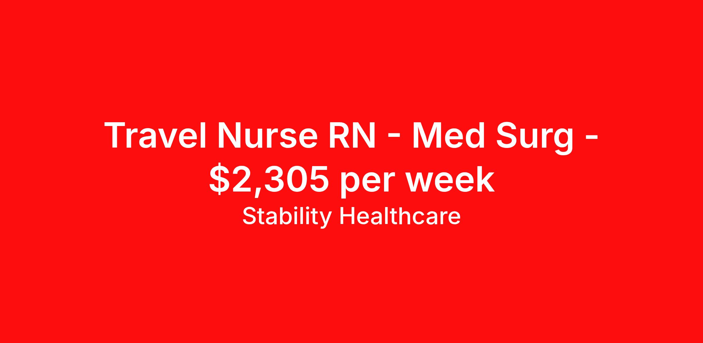Stability Healthcare is seeking a travel nurse RN Med Surg for a travel nursing job in Albany, New York. Job Description & Requirements Specialty: Med Surg Discipline: RN Duration: 13 weeks 36 hours per week Shift: 12 hours, nights Employment Type: Travel Stability Healthcare is looking for a Med-Surg RN contract position in Albany, NY. The majority of hospitalized patients are admitted to M/S either directly or after surgery. M/S is also where patients who have been in critical care (ICU) are transferred when they no longer need critical care but still require nursing care. *$600 travel bonus *Day 1 health insurance with United Healthcare *PTO plan start accruing on day 1, use during contract or cash out at the end! *Guaranteed stipend if facility calls you off *Extra hour bonus earn an additional hourly bonus for working over your weekly contracted hours Stability Job ID 820905. Pay package is based on 12 hour shifts and 36 hours per week (subject to confirmation) with tax-free stipend amount to be determined. Posted job title: Med-Surg About Stability Healthcare Stability Healthcare was founded in 2009, with the mission of becoming the best Travel Nursing Agency in California. We have been rated one of the top travel nursing agencies and offer our nurses the highest paying travel nursing jobs available. We have access to the best travel assignments from 1000’s of facilities. You can start the year off in sunny California, spend the Spring in the Colorado Rockies, enjoy the Summer in the Mid-West, experience the change of seasons in Boston and New York, and hit the beaches of Florida in the winter. Our Nurses work in the best hospitals and health systems in the country. Benefits Guaranteed Hours Benefits start day 1
