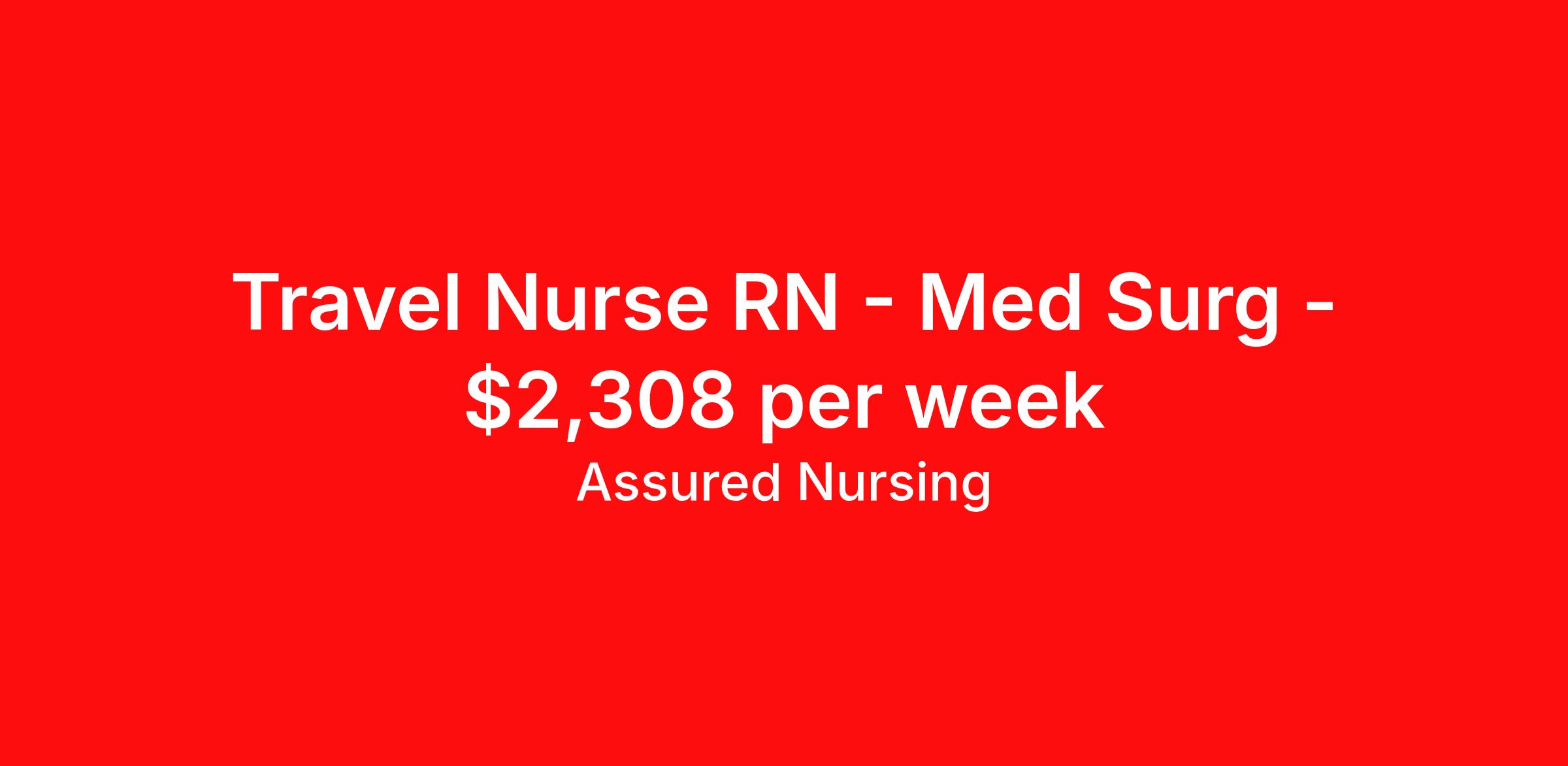 Assured Nursing is seeking a travel nurse RN Med Surg for a travel nursing job in Eagle River, Wisconsin. Job Description & Requirements Specialty: Med Surg Discipline: RN Start Date: 04/06/2026 Duration: 13 weeks 36 hours per week Shift: 12 hours, nights Employment Type: Travel Assured Nursing is currently seeking a RN for a contract position in Eagle River Wisconsin . This is a 7p-7:30a, 19:00:00-07:30:00, 12.00-3 position in the Med Surg RN . The ideal candidate will possess a current state license as a RN and have at least 2 years of recent experience as a Med Surg RN . Assured Nursing Job ID 35894928. Pay package is based on 12 hour shifts and 36.0 hours per week (subject to confirmation) with tax-free stipend amount to be determined. Posted job title: RN:Med Surg,19:00:00-07:30:00 Benefits Weekly pay Holiday Pay 401k retirement plan Referral bonus Medical benefits Dental benefits Vision benefits