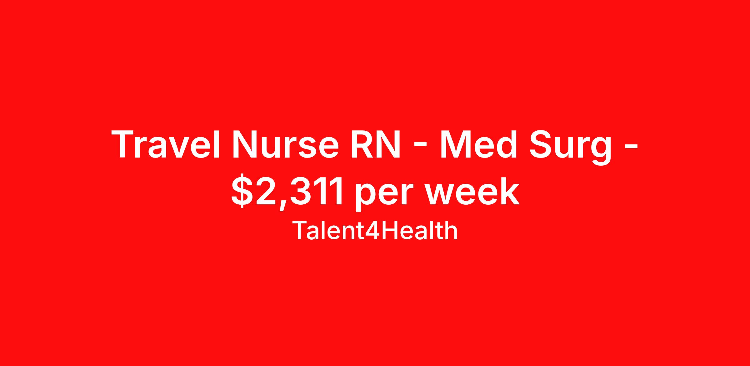 Talent4Health is seeking a travel nurse RN Med Surg for a travel nursing job in Great Barrington, Massachusetts. Job Description & Requirements Specialty: Med Surg Discipline: RN Start Date: 04/13/2026 Duration: 13 weeks 36 hours per week Shift: 12 hours, days Employment Type: Travel 2 years current Med Surg experience [Required] IV experience REQUIRED [Required] BSN [Preferred] PEARS - Pediatric Emergency Assessment and Stabilization [preferred] Traveler must have their own vehicle for this need Certification Requirements ACLS (AHA) BLS (AHA) PALS (AHA) About Talent4Health A leader and innovator, offering comprehensive talent solutions for the healthcare industry across the nation. Talent4Health, based in Wilmington, DE is a one stop solution that offers access to an inclusive network of excellent healthcare professionals through its state-of-the-art recruitment strategies and extensive career opportunities. We have successfully placed over 3000 plus clinicians with the topmost healthcare facilities across 50 states in the US. With countless prestigious clients under our umbrella, backed up by passionate and hard-working recruiters, we are a team you have been looking for! Why Choose us? When it comes to choosing a recruitment agency, it’s imperative to consider what all they have to offer. Proficiency : Our seasoned team of professionals has years of experience and we are dedicated to provide the highest quality service to our clients and candidates. Personalized service : We understand that every candidate is unique, and we work closely with each one to develop a customized plan that meets their specific needs. Consistency : We are devoted to offer dependable recruitment solutions for our candidates, and we are always a phone call away for all their questions or concerns. Comprehensive care : Our healthcare recruitment team works for different specialties, so there is a job for everyone. If this is all that excites you, do visit http://www.talent4health.com today!