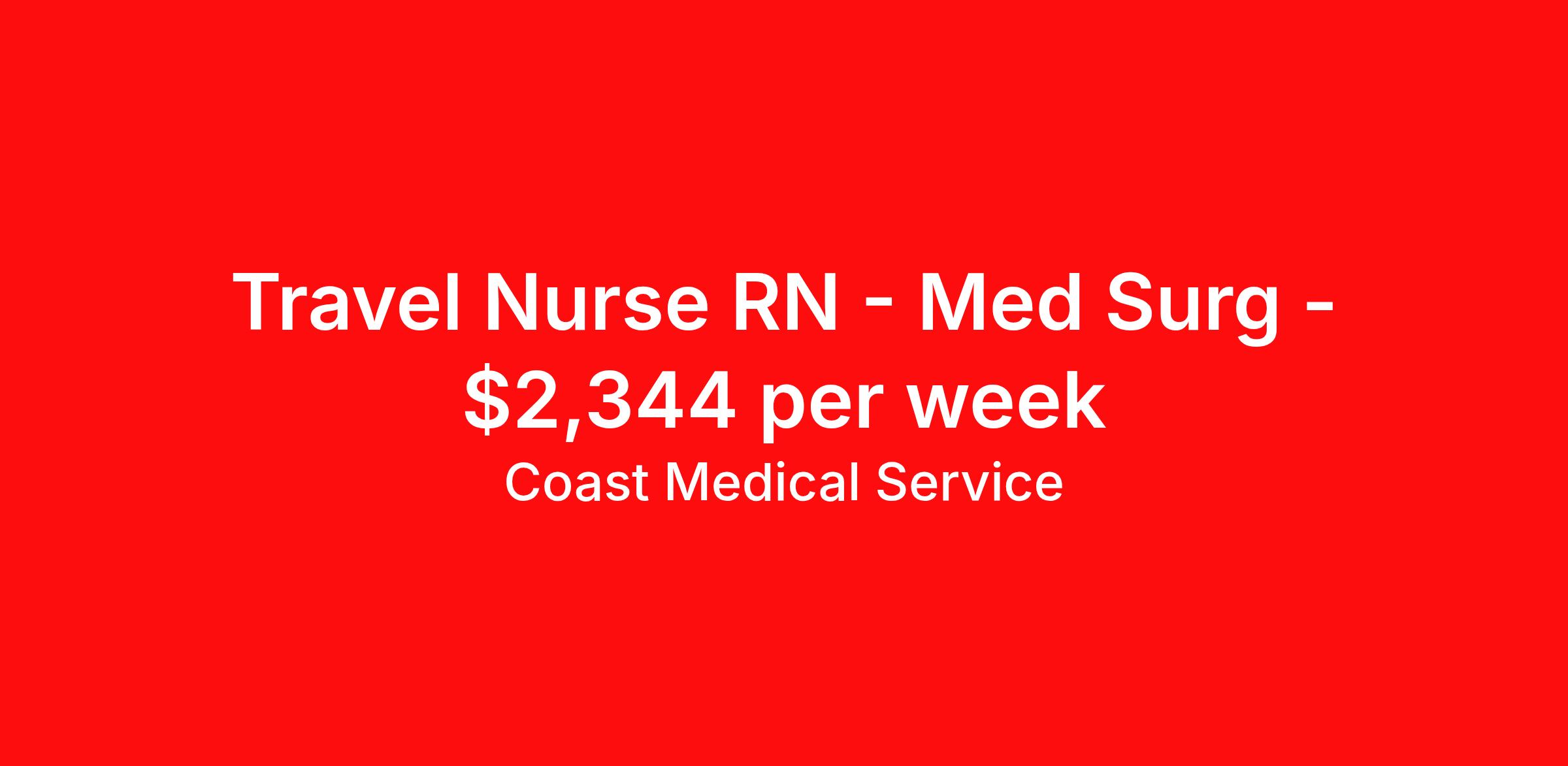 Coast Medical Service is seeking a travel nurse RN Med Surg for a travel nursing job in Eagle River, Wisconsin. Job Description & Requirements Specialty: Med Surg Discipline: RN Start Date: 04/06/2026 Duration: 13 weeks 36 hours per week Shift: 12 hours, nights Employment Type: Travel Coast Medical Service is a nationwide travel nursing & allied healthcare staffing agency dedicated to providing an elite traveler experience for the experienced or first-time traveler. Coast is featured on Blue Pipes' 2023 Best Travel Agencies and named a 2022 Top Rated Healthcare Staffing Firm & 2023 First Half Top Rated Healthcare Staffing Firm by Great Recruiters. Please note that pay rate may differ for locally based candidates. Please apply here or contact a recruiter directly to learn more about this position & the facility, and/or explore others that may be of interest to you. We look forward to speaking with you! Coast Medical Services Job ID 36157570. Pay package is based on 12 hour shifts and 36.0 hours per week (subject to confirmation) with tax-free stipend amount to be determined. Posted job title: RN:Medical-Surgical,19:00:00-07:30:00