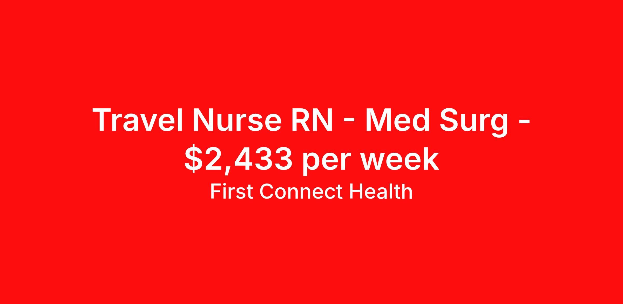 First Connect Health is seeking a travel nurse RN Med Surg for a travel nursing job in Peoria, Illinois. Job Description & Requirements Specialty: Med Surg Discipline: RN Start Date: 04/13/2026 Duration: 13 weeks 36 hours per week Shift: 12 hours, nights Employment Type: Travel Position: Med Surg RN Requirements: • 2 years of experience • Night Shift (7:00 PM – 7:30 AM) • 36 guaranteed hours per week • BLS • Active IL State RN License. About First Connect Health At First Connect Health , we take pride in being a Joint Commission–certified healthcare staffing agency , headquartered in Newark, New Jersey. This prestigious certification is more than just a seal — it's a reflection of our commitment to excellence, safety, and quality in everything we do. By meeting the rigorous standards set by The Joint Commission, one of the most respected accrediting bodies in healthcare, we've demonstrated that our processes, compliance, and patient care standards are aligned with the highest levels of quality in the industry. But our dedication goes beyond certifications. Nurses choose First Connect Health because: ✅ Trust and Transparency: We foster honest communication, timely updates, and full transparency throughout your placement journey. ✅ Best Pay & Benefits: We offer industry-leading compensation packages, along with benefits that support your career goals. ✅ Flexibility & Choice: Whether you're seeking short-term assignments, long-term contracts, or local opportunities, we provide the flexibility to suit your preferences. ✅ Personalized Support: Our recruiters take the time to understand your needs, guiding you with care, respect, and responsiveness at every step. When you work with First Connect Health, you're not just another number — you're a valued professional. Join a team that’s focused on your success, your well-being, and your future in healthcare. Benefits Medical benefits Sick pay 401k retirement plan Weekly pay Referral bonus