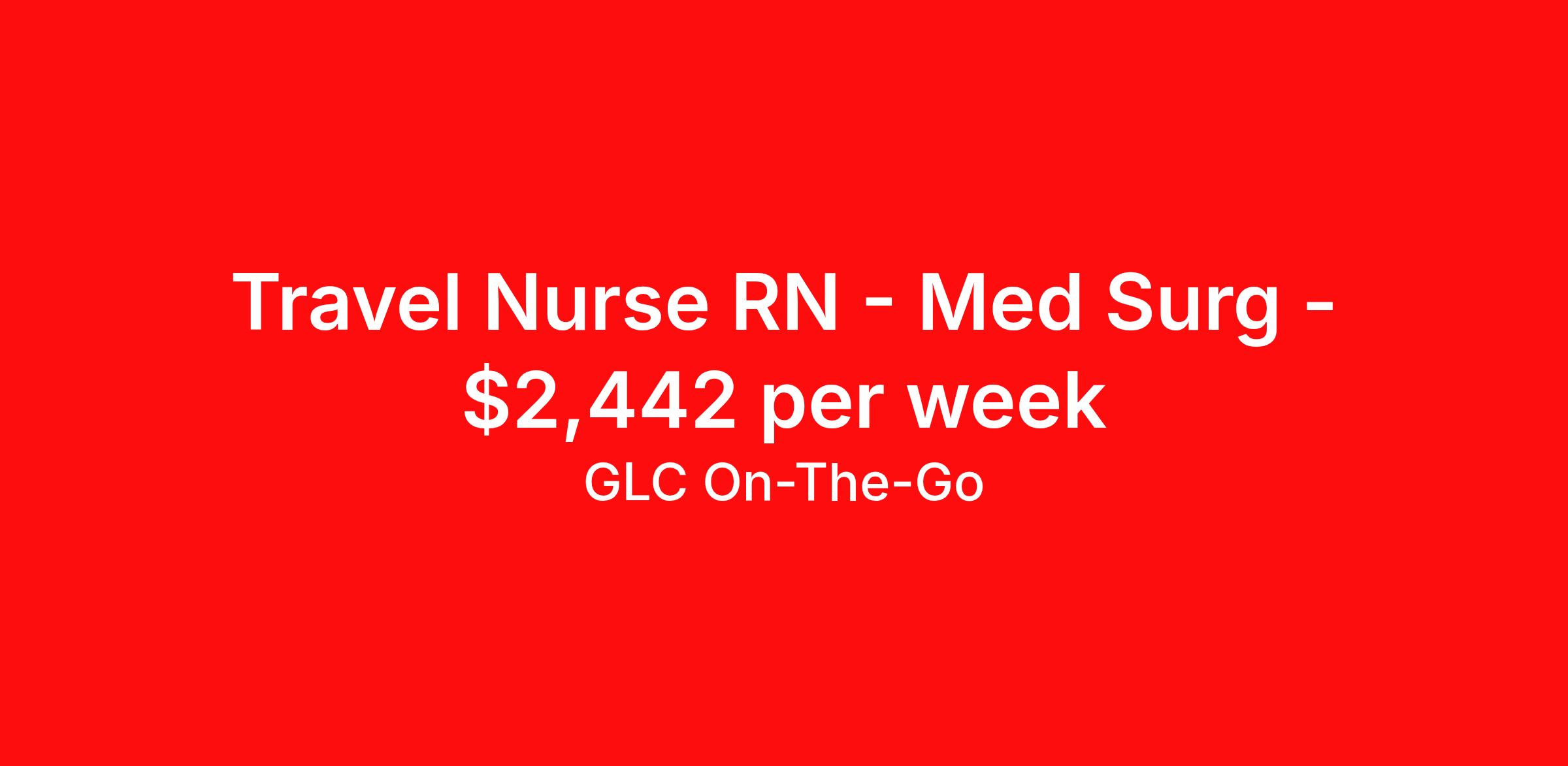 GLC On-The-Go is seeking a travel nurse RN Med Surg for a travel nursing job in Montgomery, Alabama. Job Description & Requirements Specialty: Med Surg Discipline: RN Start Date: 04/06/2026 Duration: 13 weeks 48 hours per week Shift: 12 hours, days Employment Type: Travel RN – Med/Surg Location: Montgomery, Alabama Contract Length: 13 weeks Shift: 12-hour days Hours: 36 or 48-hour option Patient Ratio: 1:5–6 Requirements: BLS NIHSS EMR: Cerner 48-Hour Option Breakdown Contract Duration: 13 weeks Guaranteed Regular Hours: 40/week Overtime Hours: 8/week Pay: Regular Rate: $23.00/hr Overtime Rate: $72.00/hr Weekly Pay: Taxable Wages: $1,496.00 Non-Taxable Wages: $1,246.00 Gross Weekly Pay: $2,742.00 About GLC On-The-Go GLC is more than just a staffing agency – we’re your trusted partner in finding travel, local, and PRN contracts that align with your career aspirations and lifestyle. We specialize in connecting travel nurses and allied healthcare professionals like you with opportunities in acute care, long-term care, behavioral health, and allied fields across the U.S. Our attentive and friendly recruiters are always just a call or text away, ready to guide you at every step, ensuring you feel valued and heard. We understand the unique needs of travel healthcare professionals, which is why we offer comprehensive benefits and 24/7 support. Join GLC, where our 20 years of experience mean we know how to help you find the assignments that turn your career goals into reality. With us, it's not just a placement – it's your dream career made possible