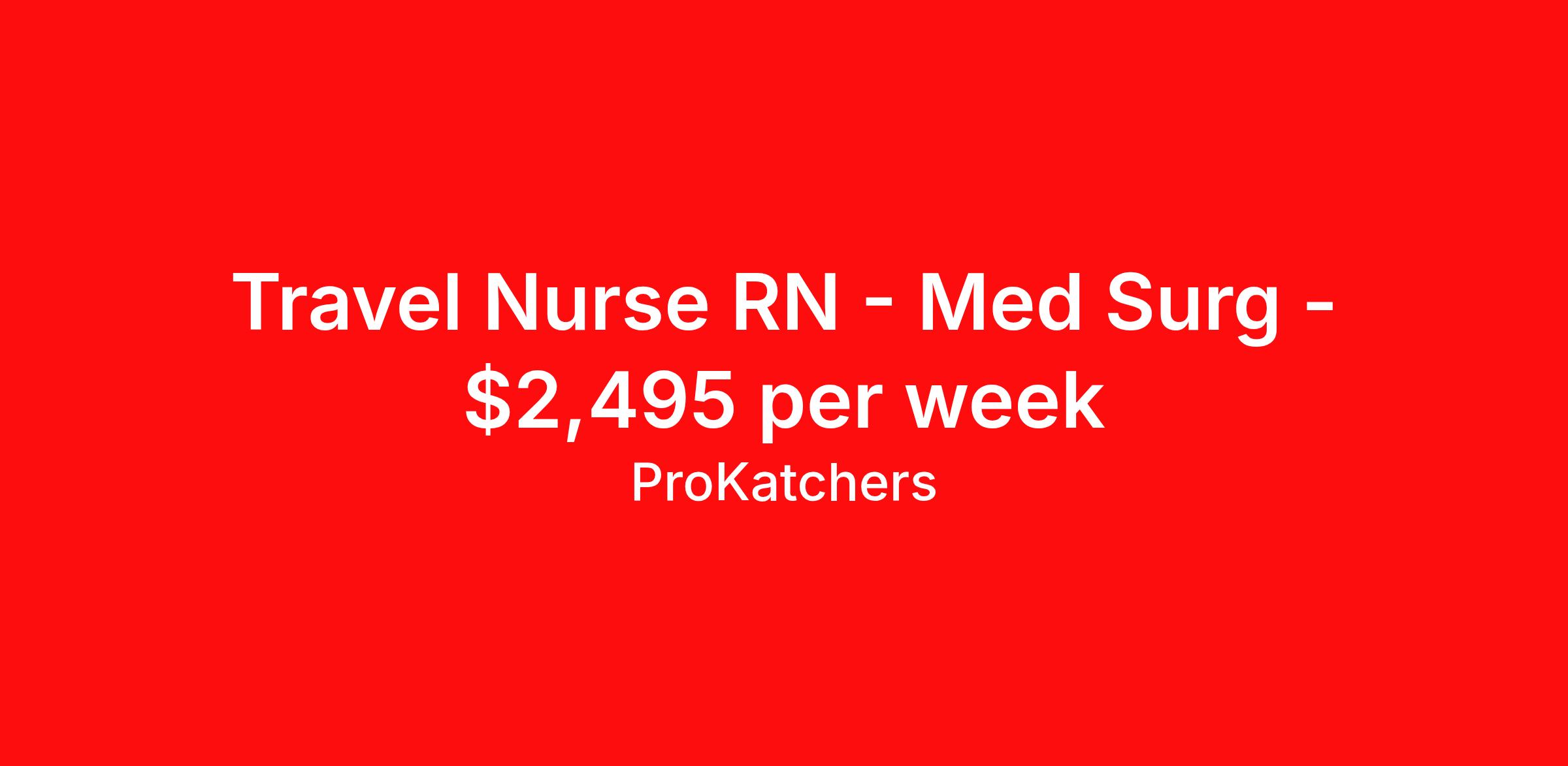 ProKatchers is seeking a travel nurse RN Med Surg for a travel nursing job in Willits, California. Job Description & Requirements Specialty: Med Surg Discipline: RN Start Date: ASAP Duration: 13 weeks 48 hours per week Shift: 12 hours, nights Employment Type: Travel Job Description: Shift Schedule: Nights, 07:00 PM - 07:30 AM; 36 or 48 hour contracts. LDRP model. No specific color for scrubs. Required Qualifications: Minimum 02 years of experience required. Graduate of an accredited nursing program. License, Certification, Registration Registered Nurse License (in the state where care is provided) BLS/ACLS/PALS (AHA) required. ProKatchers Job ID 26072. Pay package is based on 12 hour shifts and 48 hours per week (subject to confirmation) with tax-free stipend amount to be determined. Posted job title: RN, Med/Surg About ProKatchers Founded in 2016, ProKatchers Inc. is a JCC-certified organization and a recognized leader in healthcare staffing. Named one of the Fastest Growing Healthcare Staffing Firms by Staffing Industry Analysts (SIA) for 2023–2024, we are proud to be among the top-rated companies in our industry. At ProKatchers, we offer both short- and long-term contracts, as well as travel opportunities for licensed and experienced healthcare professionals across the United States. We are committed to providing industry-leading benefits and personalized career support. We understand that finding the right fit is about more than just a job—it’s about aligning your career with your lifestyle. That’s why our dedicated team of career specialists takes the time to get to know you and match you with assignments that meet your goals and aspirations. ProKatchers has also been recognized by SIA as one of the Best Staffing Firms to Work For—a testament to our employee-first approach. We specialize in placing clinical and allied health professionals in a wide range of healthcare settings, including acute care hospitals, skilled nursing facilities, long-term care centres, rehabilitation facilities, behavioural health canters, home and community health programs, urgent care clinics, and more.