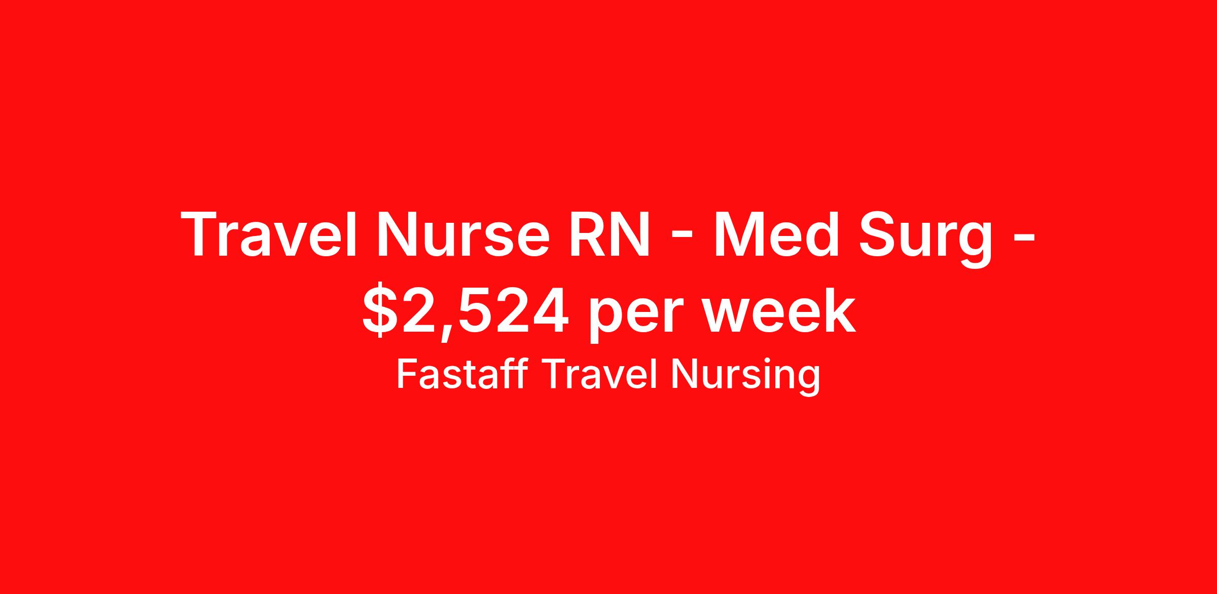 Fastaff Travel Nursing is seeking a travel nurse RN Med Surg for a travel nursing job in Peoria, Illinois. Job Description & Requirements Specialty: Med Surg Discipline: RN Start Date: ASAP Duration: 13 weeks 36 hours per week Shift: 12 hours, nights Employment Type: Travel About this Job Travel nurses work for a limited amount of time at a particular location, providing patient care and support before moving on to their next exciting adventure. Travel healthcare professionals are experienced caregivers who adapt quickly to change and enjoy learning new things. Take your skills on the road and explore somewhere new—all while earning a great living! Med Surgical RN requirements Travel nurses work for a limited amount of time at a particular location, providing patient care and support before moving on to their next exciting adventure. Travel healthcare professionals are experienced caregivers who adapt quickly to change and enjoy learning new things. Take your skills on the road and explore somewhere new—all while earning a great living! Basic travel nursing requirements include: 1-2 years recent experience in the job's primary area of care Active license or appropriate accreditation in one of the 50 US states Additional requirements & certifications as may be requested by the specificfacility/unit An enthusiastic, adventurous spirit with a desire to help Travel nursing in Peoria, IL Located in the heart of the Midwest, Illinois is home to both world-class hospitals and world-class things to see and do'starting with Chicago. Taking an assignment in Illinois ensures you'll be working among some of the best healthcare professionals in the country. Visit Lake Michigan, the Mississippi River, and explore the heartland of America all while making a great living. Why become a Fastaff Traveler? More than thirty years ago, Fastaff pioneered the practice of Rapid Response® travel nurse staffing. Since then, the company has grown to become the leading provider of urgent and crucial temporary registered nurses to help hospitals provide continuous, high-quality patient care, while offering premium pay to registered nurses. In partnering with many of the nation’s largest and most prestigious healthcare facilities as well as small community hospitals, Fastaff provides enriching employment opportunities to RNs while also providing the highest pay in the industry to meet acute staffing needs and provide unparalleled patient care. By applying for this job, you agree to receive calls, AI-generated calls, text messages, or emails from Ingenovis Health and its affiliates, and contracted partners. Frequency varies for text messages.Message and data rates may apply. Carriers are not liable for delayed or undelivered messages. You can reply STOP to cancel and HELP for help.You can access our privacy policy at Ingenovis uses AI technology to extract specific information to their systems. Fastaff Travel Nursing Job ID 452238. Pay package is based on 12 hour shifts and 36 hours per week (subject to confirmation) with tax-free stipend amount to be determined. Posted job title: Med Surgical RN About Fastaff Travel Nursing More than two decades ago, Fastaff pioneered the practice of Rapid Response ® travel nurse staffing. Since then, the company has grown to become the leading provider of urgent and crucial temporary registered nurses to help hospitals provide continuous, high-quality patient care, while offering premium pay to registered nurses. In partnering with many of the nation’s largest and most prestigious healthcare facilities as well as small community hospitals, Fastaff provides enriching employment opportunities to RNs while also providing the highest pay in the industry to meet acute staffing needs and provide unparalleled patient care. Fastaff® Travel Nursing is an equal opportunity employer.