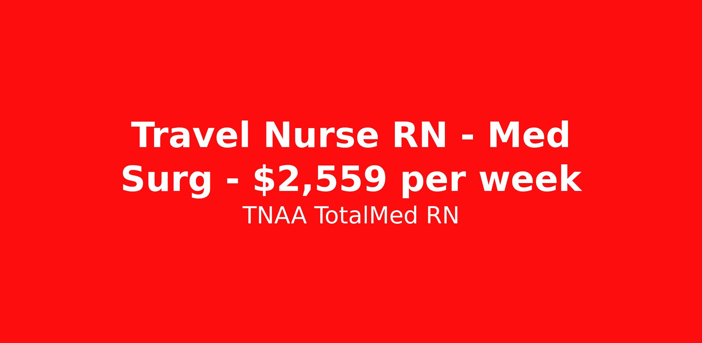 TNAA TotalMed RN is seeking a travel nurse RN Med Surg for a travel nursing job in Montgomery, Alabama. Job Description & Requirements Specialty: Med Surg Discipline: RN Start Date: 04/13/2026 Duration: 13 weeks 48 hours per week Shift: 12 hours, days Employment Type: Travel We're looking for Medical Surgical RNs for an immediate travel nurse opening in Montgomery, AL. The right RN should have 1-2 years recent acute care experience. Read below for more requirements. As a MedSurg RN, you will conduct patient assessments and prioritize data collection based on patients' immediate conditions or needs. MedSurg RNs perform ongoing assessments and appropriate treatments as ordered by a physician. Documenting patient findings and providing education and support to patients' families is essential to this travel nurse position. As a Medical Surgical Travel Nurse, you should be prepared to perform the following tasks: Provide bedside care for a variety of patients, including pre- and post-op patients. Prepare, administer and record prescribed medication, reporting any adverse reactions to treatment. Change dressings, insert catheters and start IVs. Prepares equipment and aids physician during examination and treatment of patient. Educates patients on surgical procedures. Participates in discharge planning and initiates patient education plan as prescribed by physician. Medical Surgical Travel Nurses should be able to stand and walk for long periods of time, as well as bend, lean and stoop without difficulty. RNs should be able to easily lift 20 pounds. Moving or lifting of patients may require lifting of up to 50 pounds at times. RNs will work in a fast-paced environment treating patients that may be confused, agitated, and/or uncooperative. Requirements*: BLS, NIH, 1.5 Years * Additional certifications may be required before beginning an assignment. TotalMed Travel Job ID 1394280. Pay package is based on 12 hour shifts and 48 hours per week (subject to confirmation) with tax-free stipend amount to be determined. Posted job title: Medical/Surgical - MedSurg RN - Travel Nurse About TNAA TotalMed RN TotalMed is a Top Ten, travel nursing and healthcare staffing agency with the mission of igniting purpose in healthcare. The organization staffs nurses, therapists, pharmacists, and other clinicians of all specialties in all 50 states. They offer local and travel jobs and match caregivers with the right organization to assist both facilities and patients. As an organization, they focus on putting highly-skilled staff into facilities to ensure adequate staffing for a better patient experience. TotalMed specializes in recruiting and placing healthcare professionals in travel, PRN, and permanent positions across the country in Nursing and Allied Health. Throughout 2020, the organization filled roles at even the most short-staffed facilities during the most challenging time in healthcare. By matching the right travel healthcare professional with the right organization, TotalMed continues to offer a lifeline to facilities and their patients. Benefits Weekly pay Guaranteed Hours Continuing Education 401k retirement plan Sick pay Wellness and fitness programs Referral bonus Employee assistance programs Medical benefits Dental benefits Vision benefits Benefits start day 1