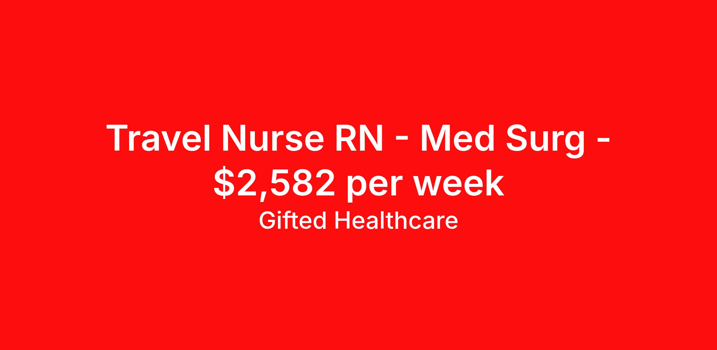 Gifted Healthcare is seeking a travel nurse RN Med Surg for a travel nursing job in Milwaukee, Wisconsin. Job Description & Requirements Specialty: Med Surg Discipline: RN Duration: 13 weeks 36 hours per week Shift: 12 hours, nights Employment Type: Travel Requirements: • 2 Yrs of Medsurg RN exp required • BLS required • Will float as needed • Night/Day rotating schedule Benefits: • Guaranteed Pay: No pay loss for canceled shifts due to low census • Premium Overtime: 2x your hourly rate for overtime on travel assignments (excluding local, PRN, CA, Govt) • Weekly Pay: Paid weekly Apply now for more details! Gifted Healthcare Job ID 7459e. Pay package is based on 12 hour shifts and 36 hours per week (subject to confirmation) with tax-free stipend amount to be determined. About Gifted Healthcare Gifted Healthcare is an award-winning staffing agency that offers career opportunities to clinicians, healthcare leaders, and school-based professionals. Gifted provides Travel, Local, Per Diem, Government, and School-Based assignments as well as Interim Leadership services at premier facilities across the United States. We strive to elevate human connection in the delivery of care, and our team is committed to supporting you every step of the way in order to help you succeed on your terms. Joining Gifted comes with benefits like schedule flexibility, competitive pay, and the opportunity to gain valuable clinical experience in top-notch facilities. As a Gifted clinician, you can trust that we will invest in your career, fight for your well-being, and put your needs first. Apply with Gifted Healthcare today for access to exceptional job opportunities, day-one benefits, and 24/7 support. Our vision is to elevate the human connection in the delivery of care we provide to our clinicians. We serve your evolving needs through innovation, community, compassion, and service. Gifted is here for you every step of the way to help you succeed on your terms. Working with Gifted comes with benefits like schedule flexibility, competitive pay, and the opportunity to gain valuable clinical experience in top-notch facilities. Benefits Weekly pay Guaranteed Hours Pet insurance Wellness and fitness programs Referral bonus Medical benefits Dental benefits Vision benefits Benefits start day 1