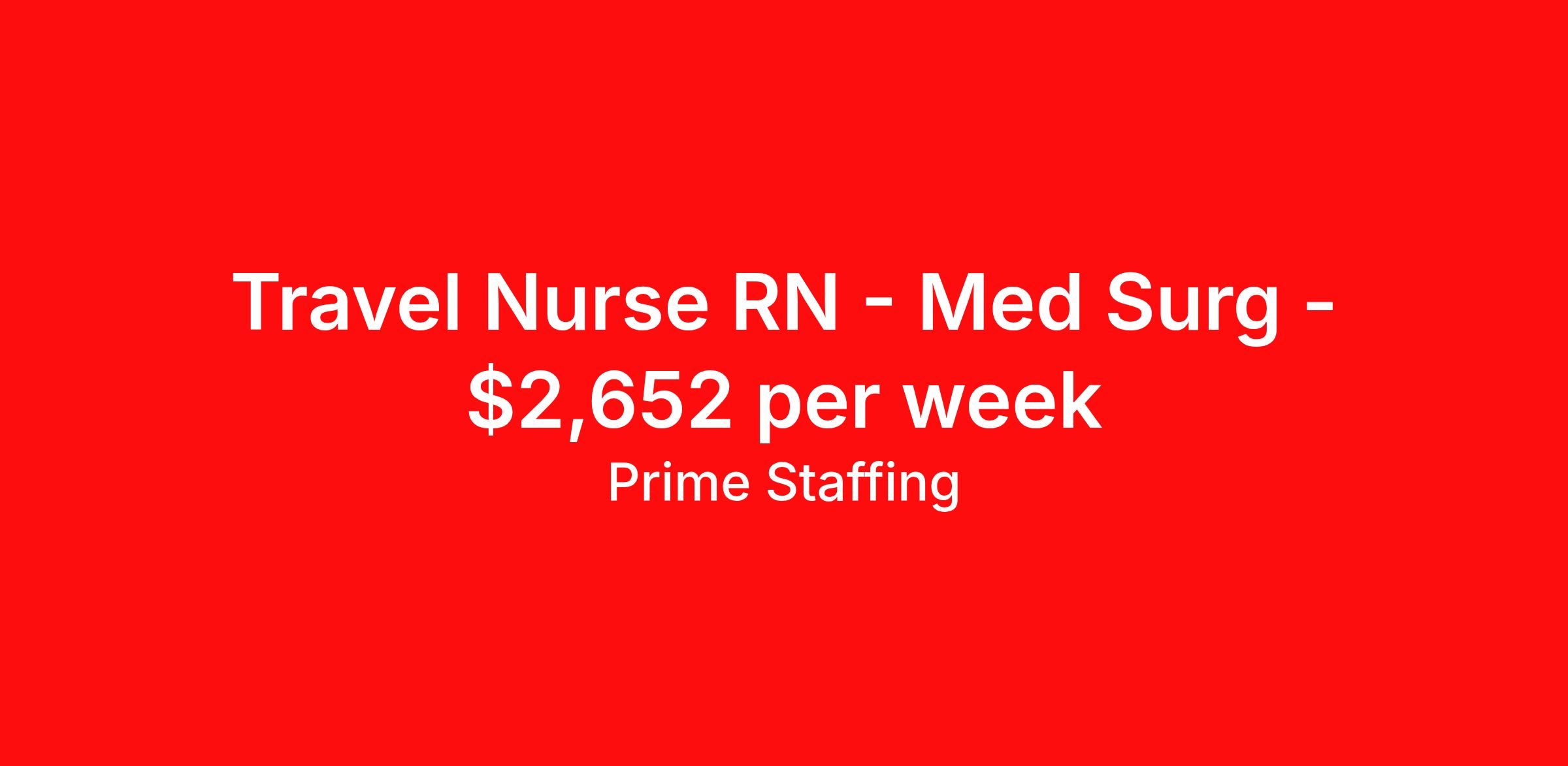 Prime Staffing is seeking a travel nurse RN Med Surg for a travel nursing job in Memphis, Tennessee. Job Description & Requirements Specialty: Med Surg Discipline: RN Start Date: 03/19/2026 Duration: 13 weeks 48 hours per week Shift: 12 hours, nights Employment Type: Travel Start date: ASAP Shift; NIGHTS Years of experience REQ: 2 years Ratio: team nursing ratios *please ask traveler to discuss this with manager during interview* About Prime Staffing At Prime Staffing, we understand the importance of finding the perfect fit for both our clients and candidates. Prime Staffing utilizes a unique matchmaking approach, providing the most qualified contingent staffing to our clients, and the most competitive contracts to our workforce. Our experienced team takes the time to get to know both our clients and candidates, their needs, and preferences, to ensure that each placement is a success. We offer a wide range of staffing services including temporary, temp-to-perm, and direct hire placements. Our extensive network of qualified candidates includes nurses, allied healthcare professionals, corporate support professionals and executives.