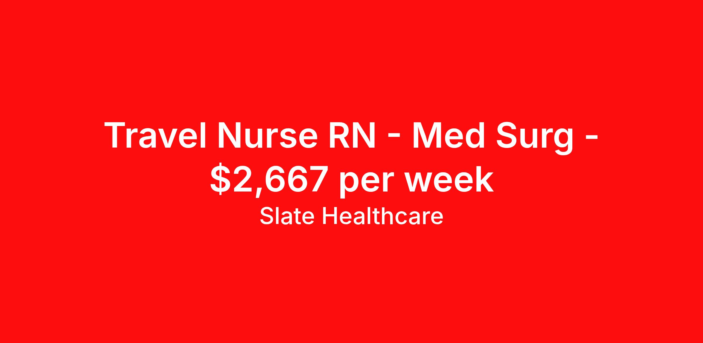 Slate Healthcare is seeking a travel nurse RN Med Surg for a travel nursing job in Hermiston, Oregon. Job Description & Requirements Specialty: Med Surg Discipline: RN Start Date: ASAP Duration: 13 weeks 36 hours per week Shift: 12 hours, days Employment Type: Travel Profession:RN, JobSpecialty:Staff Nurse, Shift:Days, Duration:13 weeks Slate Healthcare Job ID d363a647-07fe-498f-a7f3-0fc04562a2f6. Pay package is based on 12 hour shifts and 36 hours per week (subject to confirmation) with tax-free stipend amount to be determined. About Slate Healthcare Slate Healthcare is a premier travel healthcare staffing agency, connecting healthcare professionals with thousands of opportunities at top-tier hospitals and facilities across the country. We’re committed to supporting nurses and allied health professionals in building stable, fulfilling careers—while embracing the freedom and excitement that comes with travel. Our goal is simple: to offer flexibility, competitive pay, and personalized placements that align with each clinician’s lifestyle and career goals. At Slate, we empower our professionals to choose when and where they work, while ensuring they receive the highest compensation possible—because we believe that exceptional care starts with empowered caregivers.