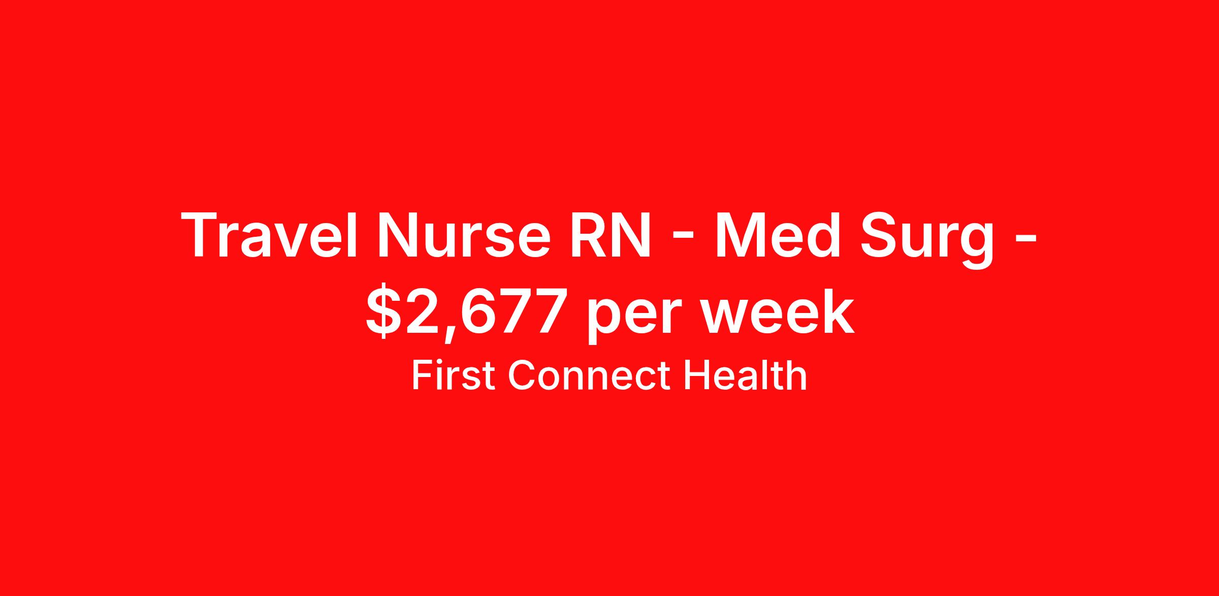 First Connect Health is seeking a travel nurse RN Med Surg for a travel nursing job in Johnson City, New York. Job Description & Requirements Specialty: Med Surg Discipline: RN Start Date: 04/07/2026 Duration: 13 weeks 36 hours per week Shift: 12 hours, nights Employment Type: Travel Requirements: 3 years of experience required. Associate degree required(BSN preferred) Current NYS RN License. BLS Certification (AHA, HSI, or American Red Cross). About First Connect Health At First Connect Health , we take pride in being a Joint Commission–certified healthcare staffing agency , headquartered in Newark, New Jersey. This prestigious certification is more than just a seal — it's a reflection of our commitment to excellence, safety, and quality in everything we do. By meeting the rigorous standards set by The Joint Commission, one of the most respected accrediting bodies in healthcare, we've demonstrated that our processes, compliance, and patient care standards are aligned with the highest levels of quality in the industry. But our dedication goes beyond certifications. Nurses choose First Connect Health because: ✅ Trust and Transparency: We foster honest communication, timely updates, and full transparency throughout your placement journey. ✅ Best Pay & Benefits: We offer industry-leading compensation packages, along with benefits that support your career goals. ✅ Flexibility & Choice: Whether you're seeking short-term assignments, long-term contracts, or local opportunities, we provide the flexibility to suit your preferences. ✅ Personalized Support: Our recruiters take the time to understand your needs, guiding you with care, respect, and responsiveness at every step. When you work with First Connect Health, you're not just another number — you're a valued professional. Join a team that’s focused on your success, your well-being, and your future in healthcare. Benefits Medical benefits Sick pay 401k retirement plan Weekly pay Referral bonus