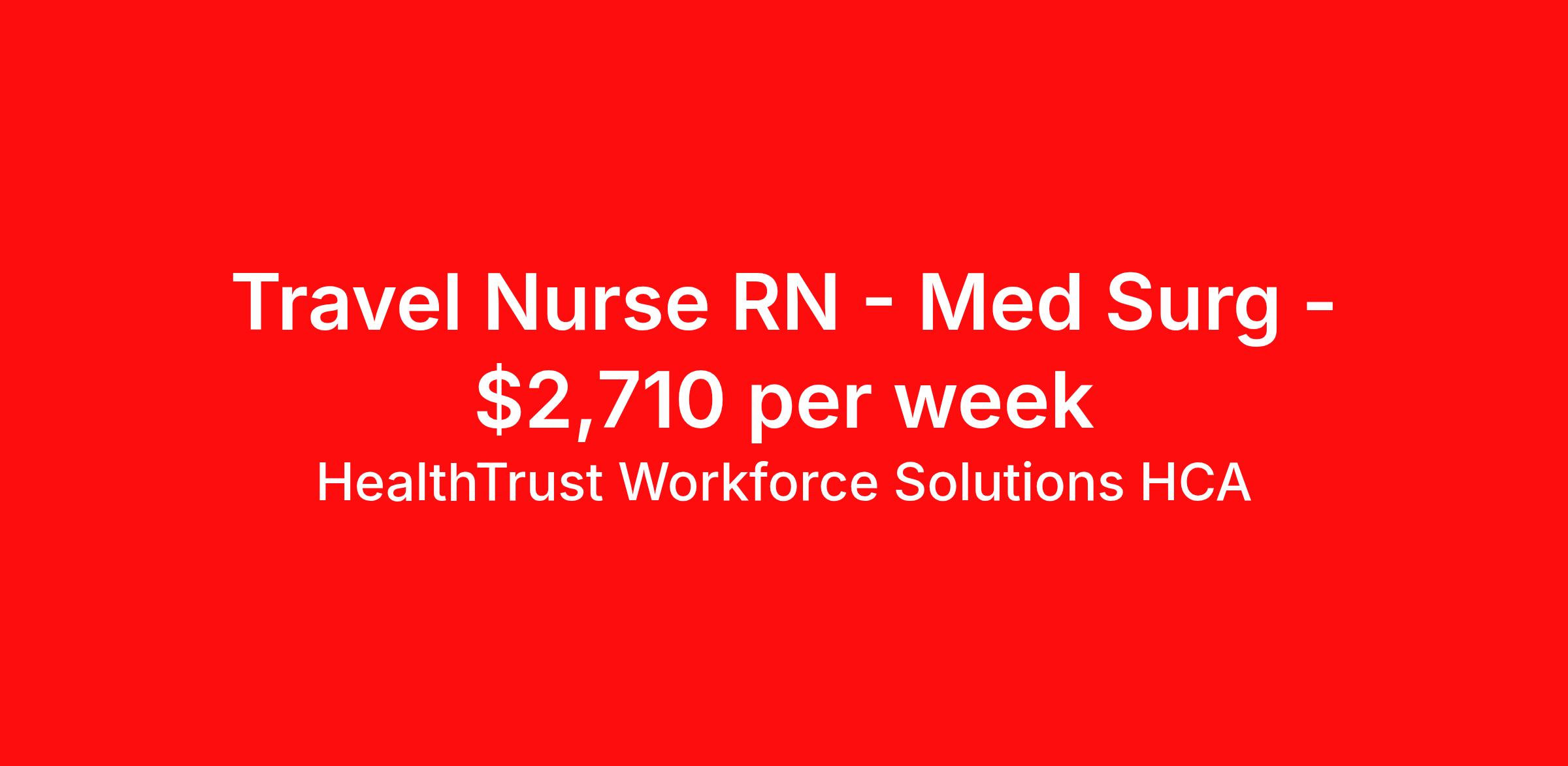 HealthTrust Workforce Solutions HCA is seeking a travel nurse RN Med Surg for a travel nursing job in Manchester, New Hampshire. Job Description & Requirements Specialty: Med Surg Discipline: RN Start Date: 03/23/2026 Duration: 13 weeks 36 hours per week Shift: 12 hours, days, evenings Employment Type: Travel About HealthTrust Workforce Solutions HCA At HealthTrust Workforce Solutions, healthcare is not just about the four walls of a facility but about the people who provide and receive care. Our focus is on empowering healthcare professionals to deliver exceptional patient experiences by providing them with the necessary skills, tools, and support. We partner with healthcare facilities nationwide to ensure that the right professionals are in the right roles. We prioritize our clinicians by giving them a voice and access to opportunities to fulfill their mission of improving lives by providing quality patient care. We are committed to our core values of Trust, Innovation, Adaptability, Courage, and Accountability. We are dedicated to positively impacting the healthcare industry by providing first-priority access to more than 200,000 jobs nationwide to our healthcare professionals. Join us and be part of the HealthTrust family, where you can make a difference every day. We embrace our changing environment, and we maintain a culture that has a rich tradition of transforming itself to meet the challenges of the future. MISSION STATEMENT While putting great people in the right roles is essential, our mission is far greater. We want our clinicians to be part of the HealthTrust family, where healthcare professionals have a voice and are empowered with the right tools and opportunities to fulfill their personal mission of improving lives. Plus, as a preferred partner to thousands of top-performing hospitals, we provide our healthcare professionals with first-priority access to more than 200,000 jobs nationwide. Benefits Dental benefits Vision benefits Referral bonus Continuing Education Life insurance