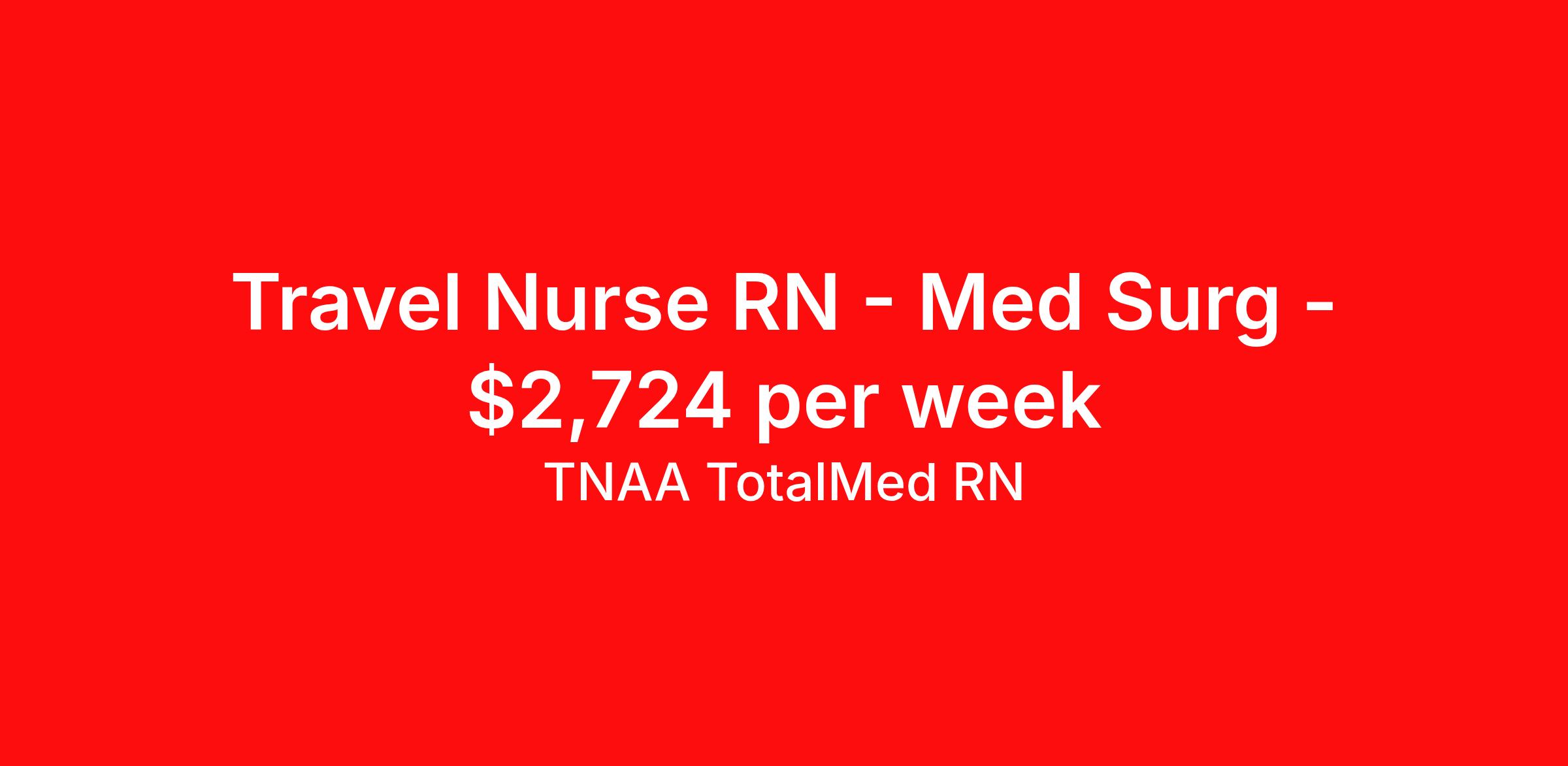 TNAA TotalMed RN is seeking a travel nurse RN Med Surg for a travel nursing job in Montgomery, Alabama. Job Description & Requirements Specialty: Med Surg Discipline: RN Duration: 13 weeks 48 hours per week Shift: 12 hours, nights Employment Type: Travel We're looking for Medical Surgical RNs for an immediate travel nurse opening in Montgomery, AL. The right RN should have 1-2 years recent acute care experience. Read below for more requirements. As a MedSurg RN, you will conduct patient assessments and prioritize data collection based on patients' immediate conditions or needs. MedSurg RNs perform ongoing assessments and appropriate treatments as ordered by a physician. Documenting patient findings and providing education and support to patients' families is essential to this travel nurse position. As a Medical Surgical Travel Nurse, you should be prepared to perform the following tasks: Provide bedside care for a variety of patients, including pre- and post-op patients. Prepare, administer and record prescribed medication, reporting any adverse reactions to treatment. Change dressings, insert catheters and start IVs. Prepares equipment and aids physician during examination and treatment of patient. Educates patients on surgical procedures. Participates in discharge planning and initiates patient education plan as prescribed by physician. Medical Surgical Travel Nurses should be able to stand and walk for long periods of time, as well as bend, lean and stoop without difficulty. RNs should be able to easily lift 20 pounds. Moving or lifting of patients may require lifting of up to 50 pounds at times. RNs will work in a fast-paced environment treating patients that may be confused, agitated, and/or uncooperative. Requirements*: BLS, NIH, 1.5 Years * Additional certifications may be required before beginning an assignment. TotalMed Travel Job ID 1394029. Pay package is based on 12 hour shifts and 48 hours per week (subject to confirmation) with tax-free stipend amount to be determined. Posted job title: Medical/Surgical - MedSurg RN - Travel Nurse About TNAA TotalMed RN TotalMed is a Top Ten, travel nursing and healthcare staffing agency with the mission of igniting purpose in healthcare. The organization staffs nurses, therapists, pharmacists, and other clinicians of all specialties in all 50 states. They offer local and travel jobs and match caregivers with the right organization to assist both facilities and patients. As an organization, they focus on putting highly-skilled staff into facilities to ensure adequate staffing for a better patient experience. TotalMed specializes in recruiting and placing healthcare professionals in travel, PRN, and permanent positions across the country in Nursing and Allied Health. Throughout 2020, the organization filled roles at even the most short-staffed facilities during the most challenging time in healthcare. By matching the right travel healthcare professional with the right organization, TotalMed continues to offer a lifeline to facilities and their patients. Benefits Weekly pay Guaranteed Hours Continuing Education 401k retirement plan Sick pay Wellness and fitness programs Referral bonus Employee assistance programs Medical benefits Dental benefits Vision benefits Benefits start day 1
