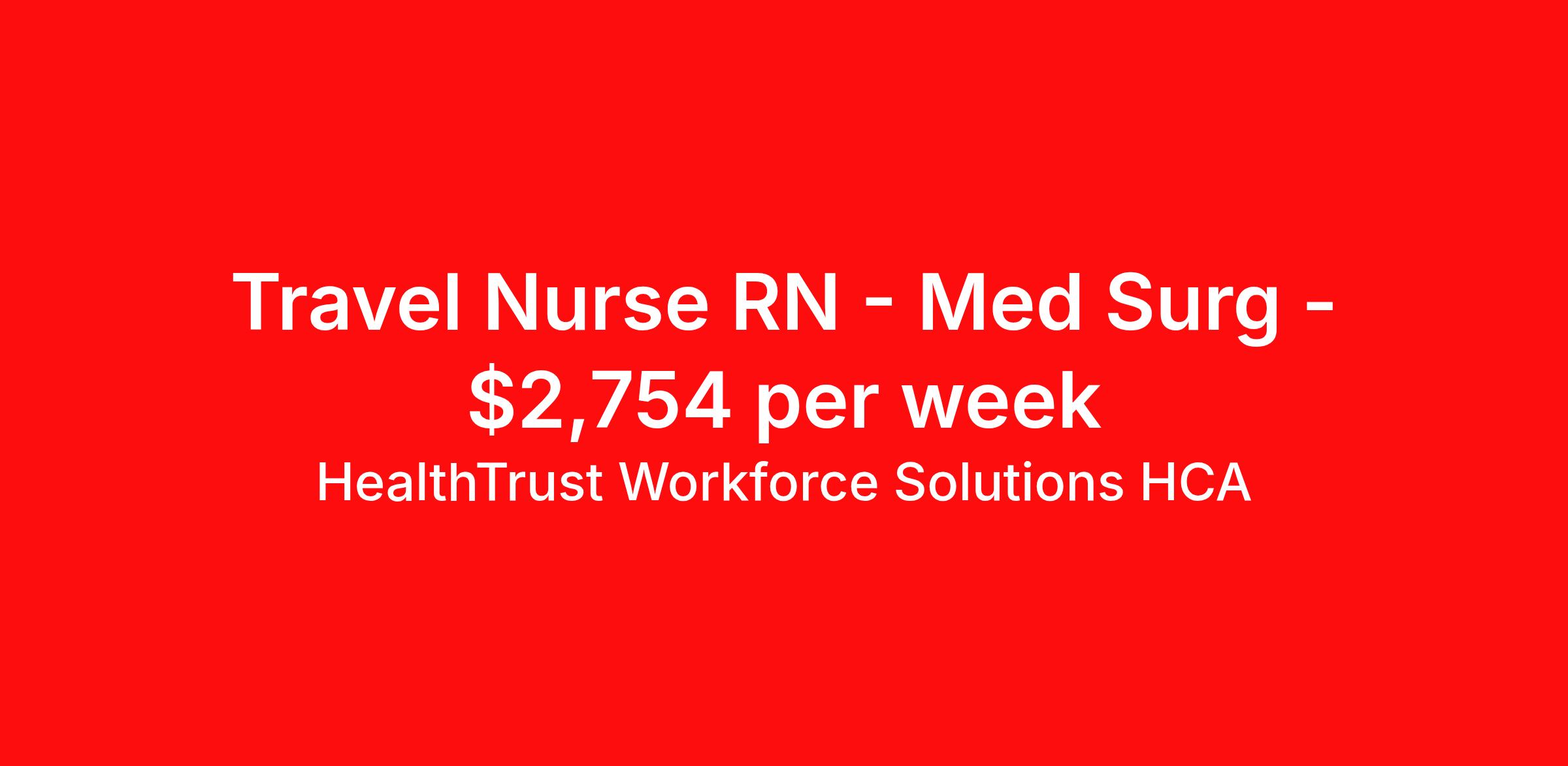 HealthTrust Workforce Solutions HCA is seeking a travel nurse RN Med Surg for a travel nursing job in Richmond, Virginia. Job Description & Requirements Specialty: Med Surg Discipline: RN Duration: 13 weeks 48 hours per week Shift: 12 hours, days, nights Employment Type: Travel About HealthTrust Workforce Solutions HCA At HealthTrust Workforce Solutions, healthcare is not just about the four walls of a facility but about the people who provide and receive care. Our focus is on empowering healthcare professionals to deliver exceptional patient experiences by providing them with the necessary skills, tools, and support. We partner with healthcare facilities nationwide to ensure that the right professionals are in the right roles. We prioritize our clinicians by giving them a voice and access to opportunities to fulfill their mission of improving lives by providing quality patient care. We are committed to our core values of Trust, Innovation, Adaptability, Courage, and Accountability. We are dedicated to positively impacting the healthcare industry by providing first-priority access to more than 200,000 jobs nationwide to our healthcare professionals. Join us and be part of the HealthTrust family, where you can make a difference every day. We embrace our changing environment, and we maintain a culture that has a rich tradition of transforming itself to meet the challenges of the future. MISSION STATEMENT While putting great people in the right roles is essential, our mission is far greater. We want our clinicians to be part of the HealthTrust family, where healthcare professionals have a voice and are empowered with the right tools and opportunities to fulfill their personal mission of improving lives. Plus, as a preferred partner to thousands of top-performing hospitals, we provide our healthcare professionals with first-priority access to more than 200,000 jobs nationwide. Benefits Dental benefits Vision benefits Referral bonus Continuing Education Life insurance