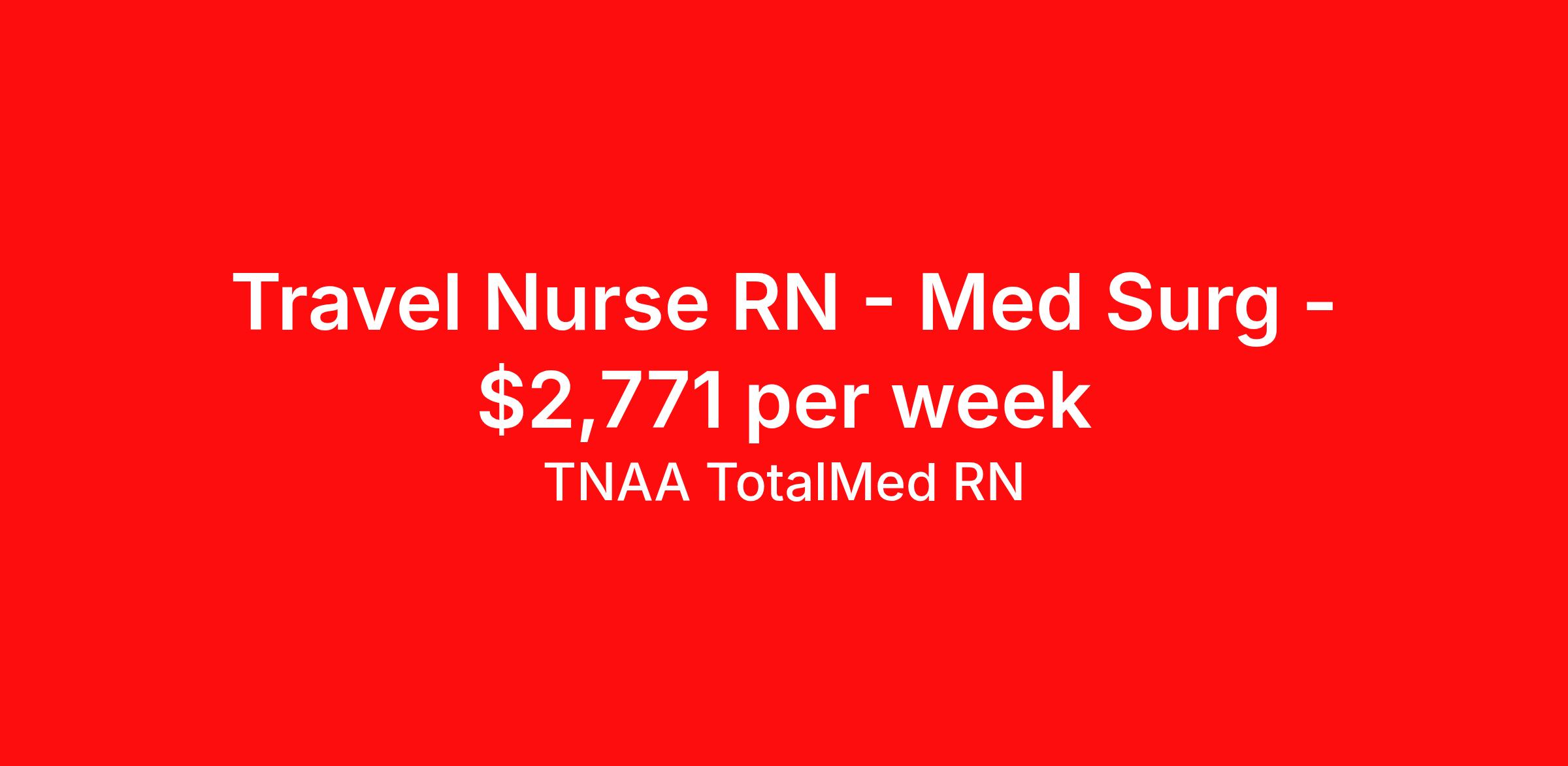 TNAA TotalMed RN is seeking a travel nurse RN Med Surg for a travel nursing job in Montgomery, Alabama. Job Description & Requirements Specialty: Med Surg Discipline: RN Duration: 13 weeks 48 hours per week Shift: 12 hours, nights Employment Type: Travel 36 or 48 available Medsurg/ED HOLD About TNAA TotalMed RN TotalMed is a Top Ten, travel nursing and healthcare staffing agency with the mission of igniting purpose in healthcare. The organization staffs nurses, therapists, pharmacists, and other clinicians of all specialties in all 50 states. They offer local and travel jobs and match caregivers with the right organization to assist both facilities and patients. As an organization, they focus on putting highly-skilled staff into facilities to ensure adequate staffing for a better patient experience. TotalMed specializes in recruiting and placing healthcare professionals in travel, PRN, and permanent positions across the country in Nursing and Allied Health. Throughout 2020, the organization filled roles at even the most short-staffed facilities during the most challenging time in healthcare. By matching the right travel healthcare professional with the right organization, TotalMed continues to offer a lifeline to facilities and their patients. Benefits Weekly pay Guaranteed Hours Continuing Education 401k retirement plan Sick pay Wellness and fitness programs Referral bonus Employee assistance programs Medical benefits Dental benefits Vision benefits Benefits start day 1