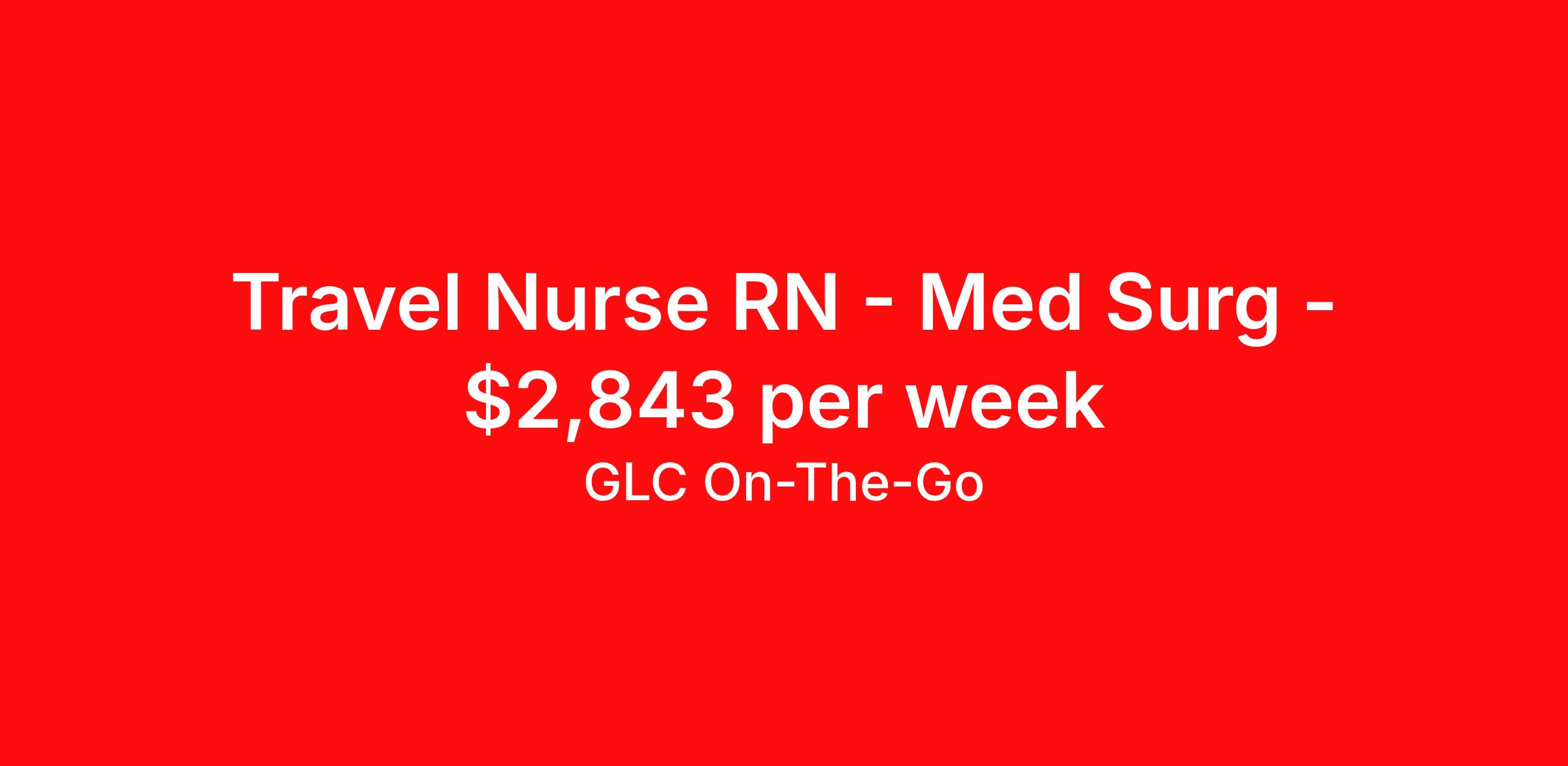 GLC On-The-Go is seeking a travel nurse RN Med Surg for a travel nursing job in Charleston, West Virginia. Job Description & Requirements Specialty: Med Surg Discipline: RN Start Date: ASAP Duration: 13 weeks 40 hours per week Shift: 8 hours Employment Type: Travel GLC is hiring: RN Cardiac Cath Lab - Charleston, WV - 13-week contract GLC – Named Best Nurse Agency 2024–2025 We connect nurses, nursing professionals, and allied health professionals like you to contracts that align with your skills, schedule, and career goals. About this Assignment Join the care team in Cardiac Cath Lab where you’ll provide patient-centered care in a collaborative environment. Typical responsibilities include direct patient care, timely documentation, and coordination with the care team. Specific duties will be confirmed during your interview with a recruiter. Assignment Details Location: South Charleston, WV Assignment Length: 13 weeks Start Date: 03/18/2026 End Date: 06/17/2026 Pay Range: $2,559 - $2,843 Minimum Requirements Active license in Cardiac Cath Lab 1 year full-time RN, Cardiac Cath Lab experience within the last 2 years What you can expect from GLC Weekly on-time pay with direct deposit Transparent communication, clear assignment details, and recruiter support from start to finish - or extension Referral bonus up to $500 Health, dental, and vision insurance 401(k) plan Completion and signing bonuses may also be available Ready to move forward? Apply now and start your rewarding journey with GLC - a recruiter will connect quickly to review pay , start date , and assignment details so you can make the best decision for your next contract. GLC On-The-Go Job ID 504736. Pay package is based on 8 hour shifts and 40 hours per week (subject to confirmation) with tax-free stipend amount to be determined. Posted job title: RN (Registered Nurse) About GLC On-The-Go GLC is more than just a staffing agency – we’re your trusted partner in finding travel, local, and PRN contracts that align with your career aspirations and lifestyle. We specialize in connecting travel nurses and allied healthcare professionals like you with opportunities in acute care, long-term care, behavioral health, and allied fields across the U.S. Our attentive and friendly recruiters are always just a call or text away, ready to guide you at every step, ensuring you feel valued and heard. We understand the unique needs of travel healthcare professionals, which is why we offer comprehensive benefits and 24/7 support. Join GLC, where our 20 years of experience mean we know how to help you find the assignments that turn your career goals into reality. With us, it's not just a placement – it's your dream career made possible