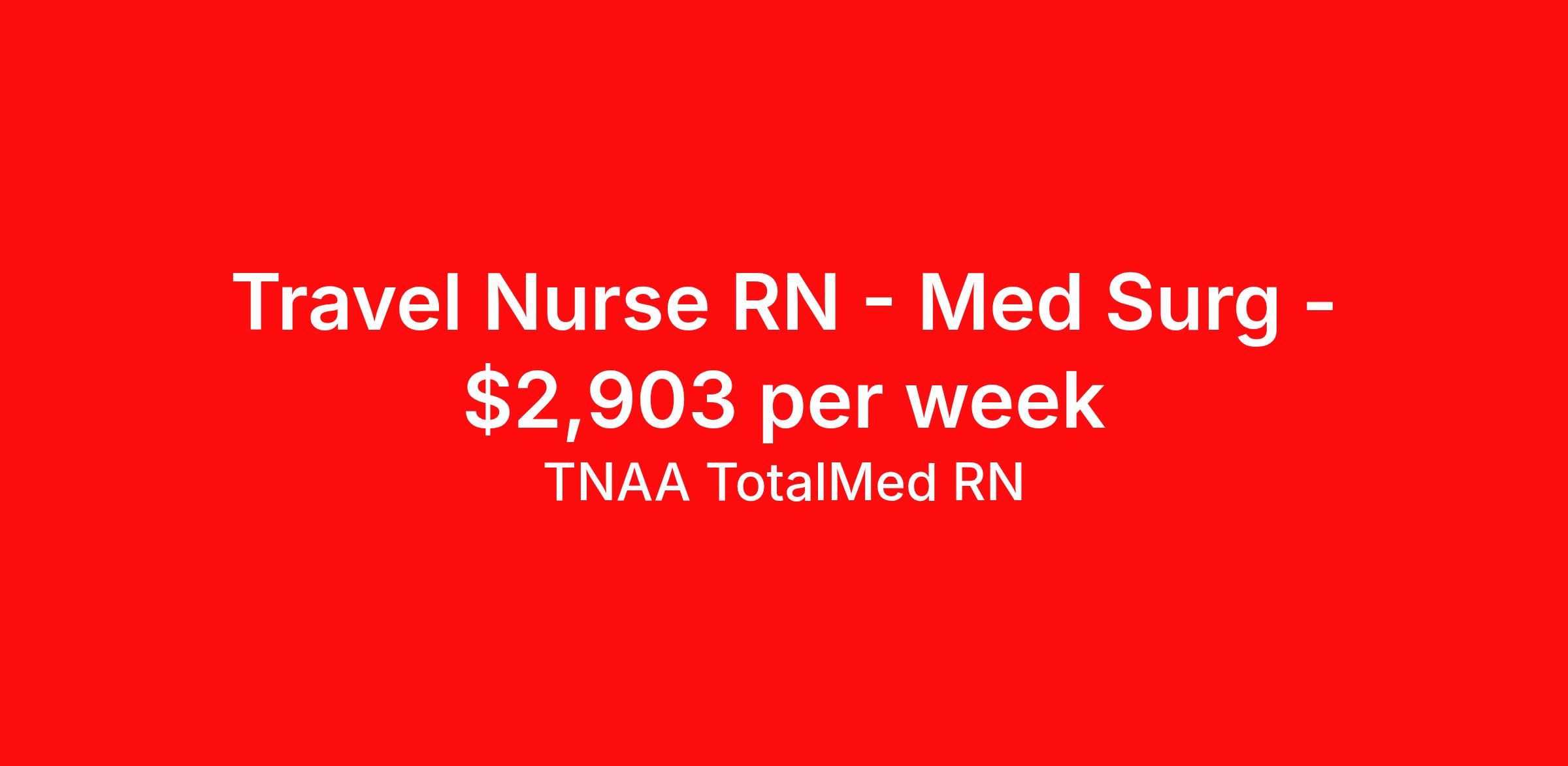 TNAA TotalMed RN is seeking a travel nurse RN Med Surg for a travel nursing job in Newburgh, Indiana. Job Description & Requirements Specialty: Med Surg Discipline: RN Start Date: 03/29/2026 Duration: 13 weeks 48 hours per week Shift: 12 hours, nights Employment Type: Travel About TNAA TotalMed RN TotalMed is a Top Ten, travel nursing and healthcare staffing agency with the mission of igniting purpose in healthcare. The organization staffs nurses, therapists, pharmacists, and other clinicians of all specialties in all 50 states. They offer local and travel jobs and match caregivers with the right organization to assist both facilities and patients. As an organization, they focus on putting highly-skilled staff into facilities to ensure adequate staffing for a better patient experience. TotalMed specializes in recruiting and placing healthcare professionals in travel, PRN, and permanent positions across the country in Nursing and Allied Health. Throughout 2020, the organization filled roles at even the most short-staffed facilities during the most challenging time in healthcare. By matching the right travel healthcare professional with the right organization, TotalMed continues to offer a lifeline to facilities and their patients. Benefits Weekly pay Guaranteed Hours Continuing Education 401k retirement plan Sick pay Wellness and fitness programs Referral bonus Employee assistance programs Medical benefits Dental benefits Vision benefits Benefits start day 1