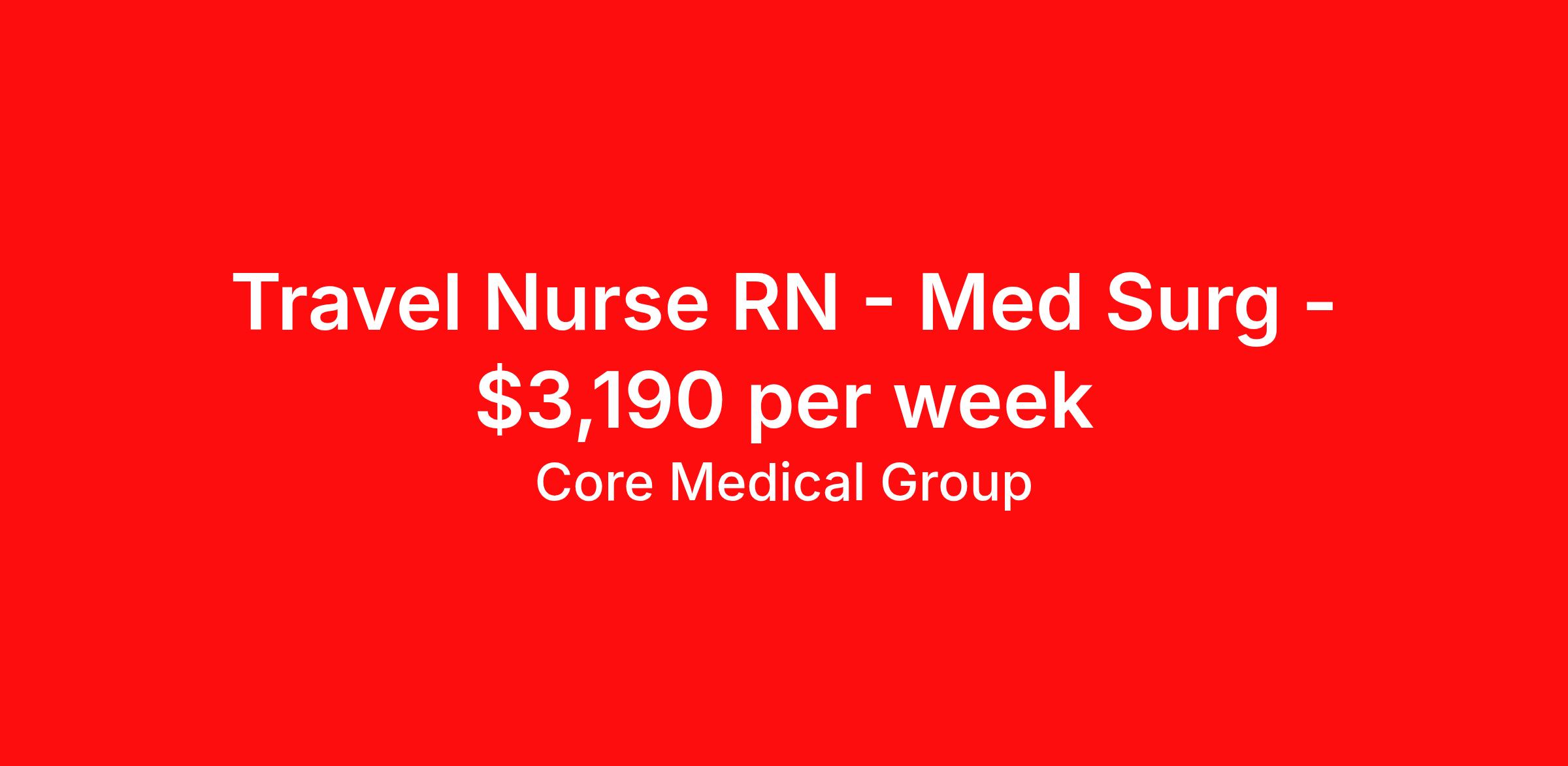 Core Medical Group is seeking a travel nurse RN Med Surg for a travel nursing job in Sandwich, Massachusetts. Job Description & Requirements Specialty: Med Surg Discipline: RN Start Date: 04/20/2026 Duration: 13 weeks 40 hours per week Shift: 8 hours Employment Type: Travel Client in MA seeking Registered Nurse for the following shift(s): Days We are looking for a healthcare professional who is ready to provide exceptional patient care in this contract/travel role. Contract/travel assignments are typically 13 weeks, with potential to extend. Help us continue our mission to connect people, improve lives, and give back to the community by joining the CoreMedical Group team. When you work with CoreMedical Group, we put you first and treat you like family, supporting you every step of the way. CoreMedical Group is one of the largest healthcare staffing agencies in the country, with travel and contract positions located across the United States. Our recruiters will help you find the perfect job, whether it's across the country or across the street. In addition to dedicated, personalized support from your recruiter, when you work with CoreMedical Group you'll receive: Access to an extensive benefits package, including day 1 health, dental, and vision insurance, employer paid life insurance, a health reimbursement account, and more! Weekly paychecks with competitive pay packages Matching 401(k) benefits to help you save for retirement Licensure assistance and reimbursement to set you up for success on your contract Travel reimbursement and dedicated housing support while on assignment Referral cash bonuses when you connect us with other clinicians CoreMedical Group also offers you a free, all-inclusive vacation each year as our way of saying "thank you" for your hard work. Join other healthcare professionals on the annual Club CoreMed retreat and you'll see why our contract and travel professionals come back to us year after year! Your career is too valuable to tackle on your own. Let CoreMedical Group help you with your healthcare journey! *Estimate of weekly payments is intended for informational purposes and includes hourly wages, as well as reimbursements for meal & incidental expenses, and housing expenses incurred on behalf of the Company. Any benefits (medical/dental/vision) are in addition to the weekly pay. Please speak with your Recruiter for additional details. Estimated payments are subject to change until formal offer of assignment is made and accepted. Core Medical Group Job ID 1365968. Pay package is based on 8 hour shifts and 40 hours per week (subject to confirmation) with tax-free stipend amount to be determined. Posted job title: RN About Core Medical Group CoreMedical Group is one of the largest healthcare staffing agencies in the country. We have jobs nationwide in travel nursing, travel allied health, interim, locum tenens, and permanent placements! Join the staffing agency with Club CoreMed, the best perk in the industry - an all inclusive paid trip to a tropical resort! Benefits Weekly pay Holiday Pay Guaranteed Hours Continuing Education 401k retirement plan Pet insurance Company provided housing options Sick pay Wellness and fitness programs Mileage reimbursement Referral bonus Employee assistance programs Medical benefits Dental benefits Vision benefits Benefits start day 1 License and certification reimbursement Life insurance Discount program