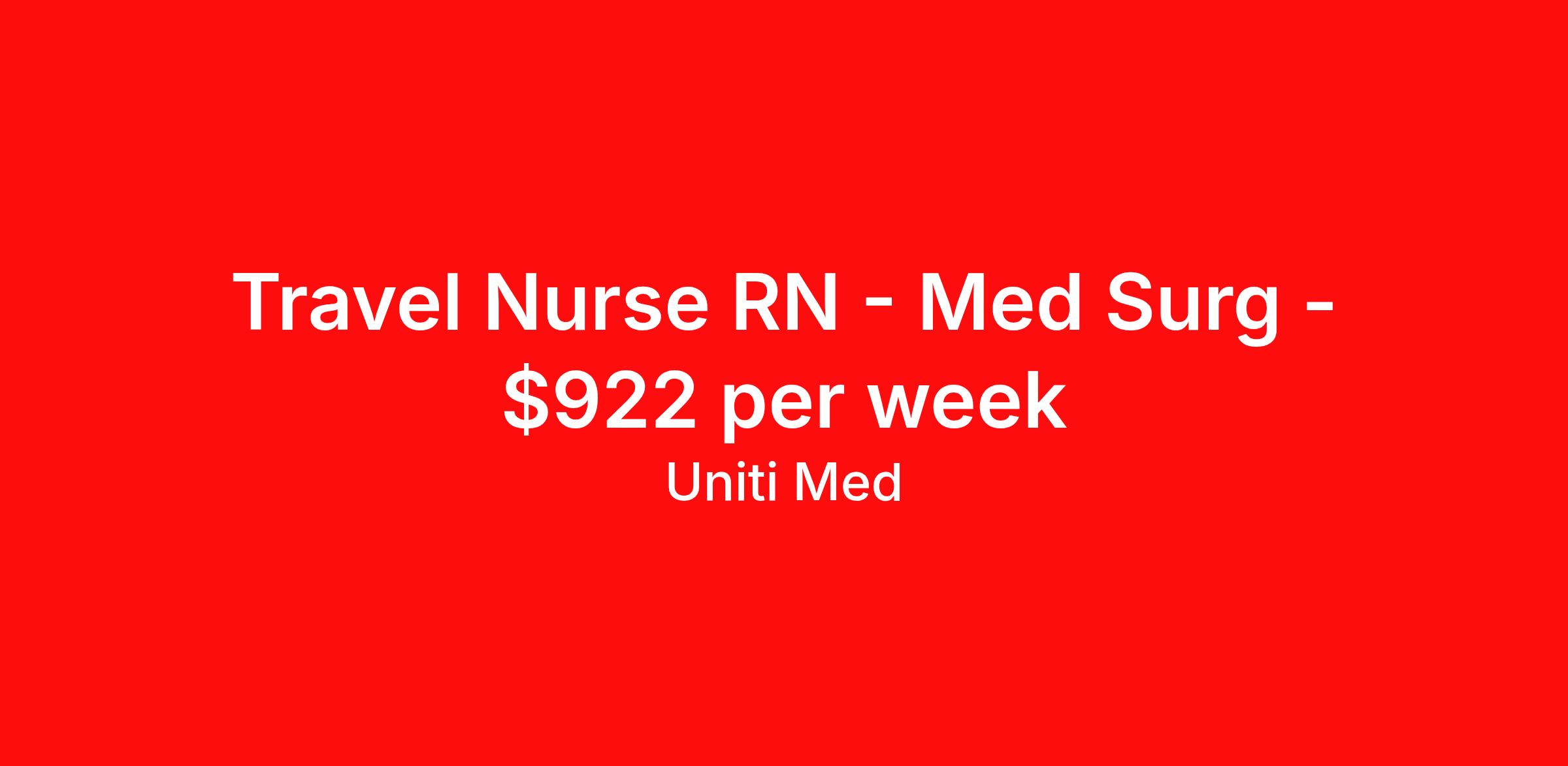 Uniti Med is seeking a travel nurse RN Med Surg for a travel nursing job in Gallup, New Mexico. Job Description & Requirements Specialty: Med Surg Discipline: RN Start Date: ASAP Duration: 7 weeks 36 hours per week Shift: 12 hours, days Employment Type: Travel Benefits: Day 1 Insurance Cigna medical, MetLife dental and vision insurance License reimbursement for new licenses needed for each assignment Discounts with hotels and rental cars A dedicated recruiter and support team that will help you every step of the way to sure you start on time and have an exceptional experience Referral bonus up to $700 About the Company: Finding the right role is about more than just matching skills to a job—it’s about aligning with your goals, values, and the way you want to work. As an award-winning talent partner, we support healthcare professionals through every step of that process, offering meaningful opportunities, clear guidance, and long-term partnership. From our first conversation to your first day on the job (and beyond!), we’re here to help you move forward with confidence. UnitiMed Job ID 783931. Pay package is based on 12 hour shifts and 36 hours per week (subject to confirmation) with tax-free stipend amount to be determined. Posted job title: Registered Nurse (RN) About Uniti Med Uniti Med meticulously matches your talents to our open needs to ensure the ultimate travel experience. Tell us where you want to go and let our experienced staff lead the way! Benefits Referral bonus Benefits start day 1 Employee assistance programs