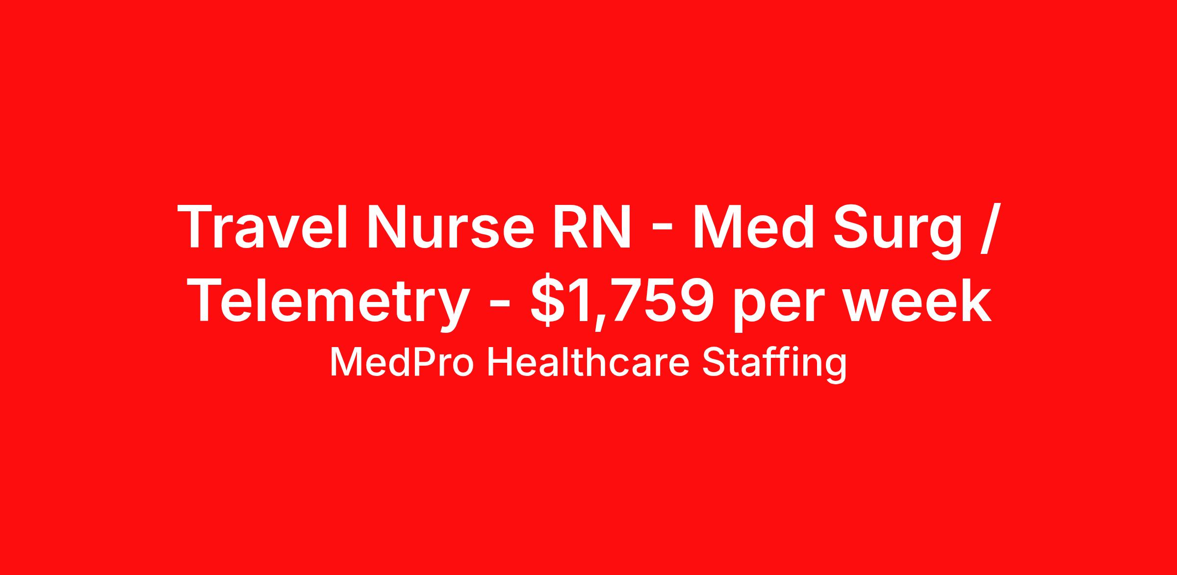 MedPro Healthcare Staffing is seeking a travel nurse RN Med Surg / Telemetry for a travel nursing job in Charlotte, North Carolina. Job Description & Requirements Specialty: Med Surg / Telemetry Discipline: RN Start Date: 04/13/2026 Duration: 13 weeks 36 hours per week Shift: 12 hours, days Employment Type: Travel MedPro Healthcare Staffing , a Joint Commission-certified staffing agency, is seeking a quality Med-Surg registered nurse (RN) for a travel assignment with one of our top healthcare clients. Requirements Active RN License Degree from accredited nursing program BLS Certifications Eighteen months of recent experience in an Acute Care Med/Surg setting Other requirements to be determined by our client facility Benefits Weekly pay and direct deposit Full coverage of all credentialing fees Private housing or housing allowance Group Health insurance for you and your family Company-paid life and disability insurance Travel reimbursement 401(k) matching Unlimited Referral Bonuses up to $1,000 Duties Responsibilities Med-Surg Nurses (RN) provide care for primarily adult patients before and after surgical procedures; they also attend to those who are being treated with pharmaceuticals to manage illness. Due to the broad range of medical conditions Med/Surg Nurses will encounter, they must be well-versed in a large variety of health conditions. Complete assignments made by physicians. Provide routine treatment and post-surgical care. Assess changes in patient's health status and perform various treatments. Administer medication. Meticulous documentation as to medication and treatment administration to ensure continuity of care between nursing staff, physicians and other treatment team members. About Agency MedPro Healthcare Staffing is a Joint Commission certified provider of contract staffing services. Since 1983, we have placed nursing and allied travelers in top healthcare facilities nationwide. Join us today for your very own MedPro Experience®. If qualified and interested, please call for immediate consideration. MedPro Staffing is an Equal Opportunity Employer. All applicants will be considered for employment without attention to race, color, religion, national origin, age, sex, disability, marital status or veteran status. Key Words: Registered Nurse, RN, Medical-Surgical, Travel Nurse, Contract Nurse, Agency Nurse, Agency RN, RN-MS, RN- Medical Surgical, Travel RN, Contract, Nursing, RN Med-Surg, Travel Nursing *Weekly payment estimates are intended for informational purposes only and include a gross estimate of hourly wages and reimbursements for meal, incidental, and housing expenses. Your recruiter will confirm your eligibility and provide additional details. MedPro Job ID a0Fcx00000HihkDEAR. Pay package is based on 12 hour shifts and 36 hours per week (subject to confirmation) with tax-free stipend amount to be determined. Posted job title: Med-Surg/Telemetry Registered Nurse Nursing: Med Surg/Tele. About MedPro Healthcare Staffing At MedPro Healthcare Staffing , we believe no one cares more for caregivers than we do. Our mission is simple: you focus on your patients, and we’ll take care of the rest. As a Joint Commission-certified leader in temporary and contract healthcare staffing since 1983, MedPro has proudly connected nursing and allied travelers with top healthcare facilities across the nation. With thousands of job opportunities available nationwide, we make it easy to find assignments that align with your goals and lifestyle. Our on-staff clinical support team—alongside a compassionate group of experienced recruiters—provides hands-on guidance every step of the way. From Day 1 medical benefits and a 401(k) plan to personalized career support, we’re committed to ensuring every professional we serve feels valued, cared for, and empowered to succeed. Guided by a CEO who is a Registered Nurse, MedPro is built on a foundation of clinical insight and genuine compassion for the caregiving community. Through The MedPro Experience® , we deliver travel assignments that are rewarding, memorable, and designed to help you DREAM big, EXPLORE often, and ACHIEVE greatness. Benefits Day 1 medical, dental, and vision benefits for you and your family Weekly pay and direct deposit Unlimited Referral Bonuses starting at $500 On Staff Clinical Support Team Access to nationwide travel assignments MPX Mobile app -24/7 real-time access to jobs, credentials, assignment details, and more Full coverage of all credentialing fees Private housing or housing allowance Tax Free Per Diems, Housing Stipends and Travel Reimbursements Company-paid life and disability insurance Travel reimbursement 401(k) matching Benefits Weekly pay Referral bonus Employee assistance programs