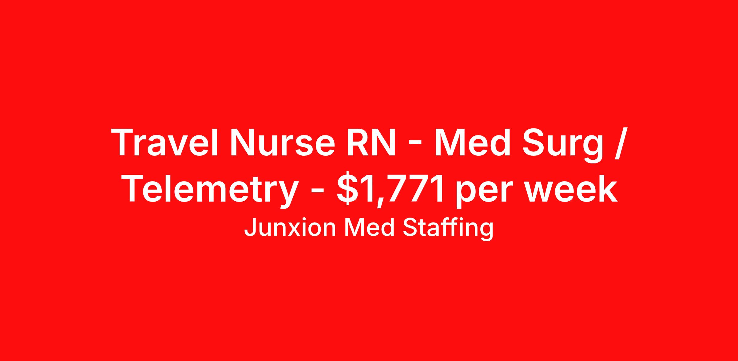 Junxion Med Staffing is seeking a travel nurse RN Med Surg / Telemetry for a travel nursing job in Tucson, Arizona. Job Description & Requirements Specialty: Med Surg / Telemetry Discipline: RN Start Date: ASAP Duration: 13 weeks 36 hours per week Shift: 12 hours, nights Employment Type: Travel Summary: Junxion Med Staffing is looking for a MS/Tele RN to take an assignment in Tucson, Arizona. This assignment lasts 13.14 WEEKS and is scheduled to start on February 16, 2026. If you don't like the start date, pay, or shift, then let’s talk. Give us a call opt 1 Job Details: Shift: 12H Nights Total Weekly Hours: 36 Certifications: BLS, BLS, ACLS Trauma Level: Benefits: Day 1 Insurance Additional bonus potential for every contract Additional vacation incentives Medical insurance with no more than $175 monthly premium for employee Employee Assistance Program (EAP) Referral bonus up to $1,000 401K and access to financial advisors for financial wellness and education A dedicated recruiter and support team that will help you every step of the way to sure you start on time and have an exceptional experience An agency ran by a traveler for travelers Click here for licensing requirements About the Company: Junxion Med Staffing is an award-winning healthcare staffing company with a mission to provide quality healthcare to our communities. Apply today to speak with a recruiter! Awards: RNVIP- Top 10 Travel Nursing Agencies of 2024 BluePipes – The Best Travel Nursing Companies 2023 *Estimated weekly pay includes projected hourly wages and weekly meal and lodging per diems for eligible clinicians based on nationally published GSA rates. Actual weekly pay and per diems may differ from the amount shown and may be subject to change during an assignment. For all employees and employee applicants, Junxion Med Staffing is an Equal Employment Opportunity ("EEO") Employer, including Disability/Vets, and welcomes all to apply. Junxion Med Staffing Job ID 1357564. Pay package is based on 12 hour shifts and 36 hours per week (subject to confirmation) with tax-free stipend amount to be determined. About Junxion Med Staffing Junxion Med Staffing was founded by a former healthcare traveler who understands the challenges healthcare professionals face - because we’ve been there. We specialize in placing travel nurses, allied health professionals, physicians, physician assistants, and nurse practitioners in both short-term and permanent roles across a wide range of specialties. Whether you're looking for a travel contract or a long-term fit, we work to ensure the right match between each healthcare professional and facility. At Junxion, we keep it simple: ● Transparent communication. No surprises, no hidden details, just honest conversations so you always know what to expect. ● Dedicated support. From job search to contract negotiations and throughout your assignment, you’ll have a recruiter who’s with you every step of the way. ● Competitive pay and benefits. We advocate for you to be fairly compensated and supported in your goals. ● A focus on your success. When healthcare professionals feel valued and empowered, patient care improves and that’s what it’s all about. You’re not just a number here. You’re part of a team that actually cares. Let’s find your next great opportunity together. Benefits Weekly pay Referral bonus Dental benefits Vision benefits 401k retirement plan Medical benefits Mileage reimbursement