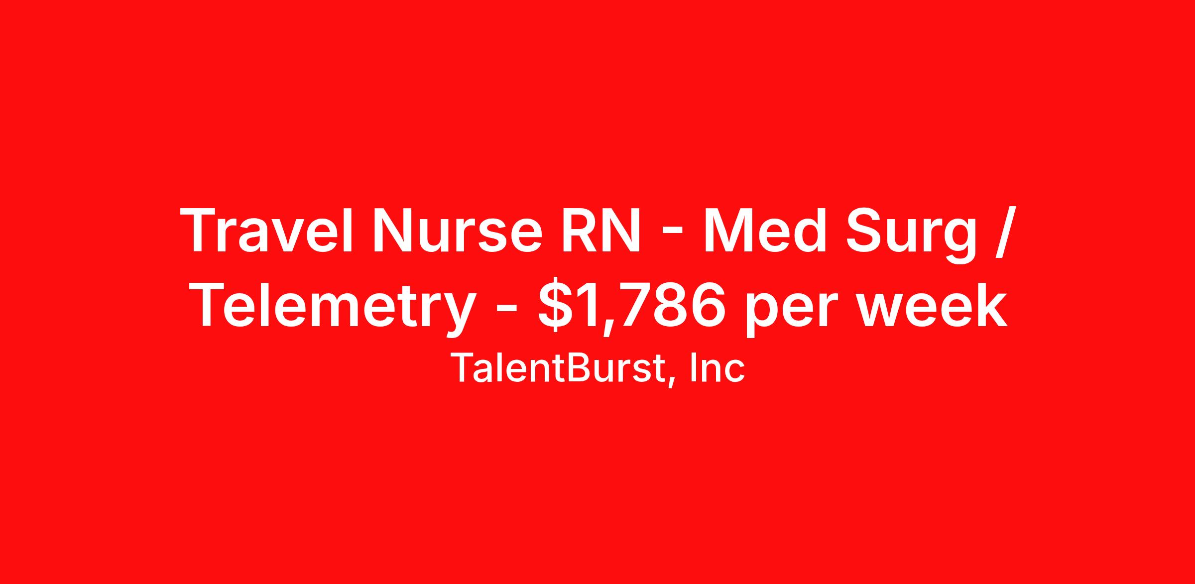 TalentBurst, Inc is seeking a travel nurse RN Med Surg / Telemetry for a travel nursing job in Shelby, North Carolina. Job Description & Requirements Specialty: Med Surg / Telemetry Discipline: RN Start Date: 04/20/2026 Duration: 12 weeks 36 hours per week Shift: 12 hours, nights Employment Type: Travel JOB DESCRIPTION RN - MedSurg/Tele JOB DESCRIPTION RN - MedSurg/Tele ● About Facility: o 241 licensed beds o Level 3 Trauma o Teaching Hospital? No o Certified Chest Pain Center o Stroke Center ● Unit Information: o Beds: 32 ▪ Average Census: 28 o Minimum Years of Experience required? 18 months Med/Tele RN exp o Will you accept a first-time traveler? Yes ● Patient Types/Common Diagnoses: o Total Joint Replacements, Colon resection, gallbladder, appendectomy, amputations, medical overflow, hip fractures, SBO, NG tubes ● Patient Ratios: o RN: Days 1:4-6; Nights 1:5-6 o LPN (if applicable): Days 1:4-6; Nights 1:5-6 o CNA: 1:10-11, or 1: 16 (depends on staffing) ● Required Licensure & Certifications: o RN: BLS, ACLS, NIHSS ● Skills required: o Basic Med/Tele skillset: Cardiac rhythm interpretation, experience with non-titrating Cardiac drips (Cardizem/Amiodarone), wound care, drain/tube management, PIV starts, Central line management, etc. ● Support within the Department: o CNA - Vital signs, baths, mobility, turning, blood sugars o Receptionist/HUC: Rounds and secretary duties o Charge nurse – Resource to assist with all nursing care o Phlebotomy? Yes, other than nurse draws o IV/VAT Team o RT, 24/7 o Hospitalist, 24/7 o Intensivist, 24/7 o Telemetry monitoring/tech? Yes ● Technology/Equipment: o EMR: EPIC o IV Pump: Alaris o Med dispensing: Omnicell o Monitors: Phillips ● Floating: o Within region and scope of practice o Will be required to float per region needs – will require floating to all facilities listed below, as needed, within scope of practice – DECLINE if not agreeable ▪ Region 3 - Cleveland, Kings Mtn, Lincoln, Central Division (CMC Main Mercy LCH) ▪ If floating mid-shift, Traveler will be paid for the time traveling between facilities (will remain on the clock) ● Orientation (facility and unit): o NEO o 2 days departmental ● Scheduling: o Weekend rotation: every other o No call o Holiday Expectations: Travelers will work 75% of holidays yes o RTO: Can approve up to 6 days off, excluding holidays – must add time to the end of the contract if unable to meet contracted hours o Shift times: 0645-1900, 1845-0700 o Schedule cycle: every 6 weeks ● Other notes: o Scrub Color: Navy o Parking: Free TB_RN ZRHC Talent Burst Job ID 26-07167. Pay package is based on 12 hour shifts and 36 hours per week (subject to confirmation) with tax-free stipend amount to be determined. Posted job title: RN - MedSurg/Tele About TalentBurst, Inc TalentBurst Health & Life Sciences is an established provider of healthcare workforce solutions, servicing healthcare facilities across the United States for over 15 years. As a Joint Commission Certified Agency, our commitment to quality, integrity, and exceptional service has made us a trusted name in the healthcare staffing landscape. Our mission is to bridge the gap between healthcare professionals seeking fulfilling opportunities and healthcare organizations striving to maintain their high standards of care. We are committed to providing top-notch healthcare professionals with access to facilities where they can focus on delivering exceptional patient care and thrive. Whether you're a nurse, allied health professional, or administrative personnel, we have the expertise to match your skills and aspirations with the perfect placement.