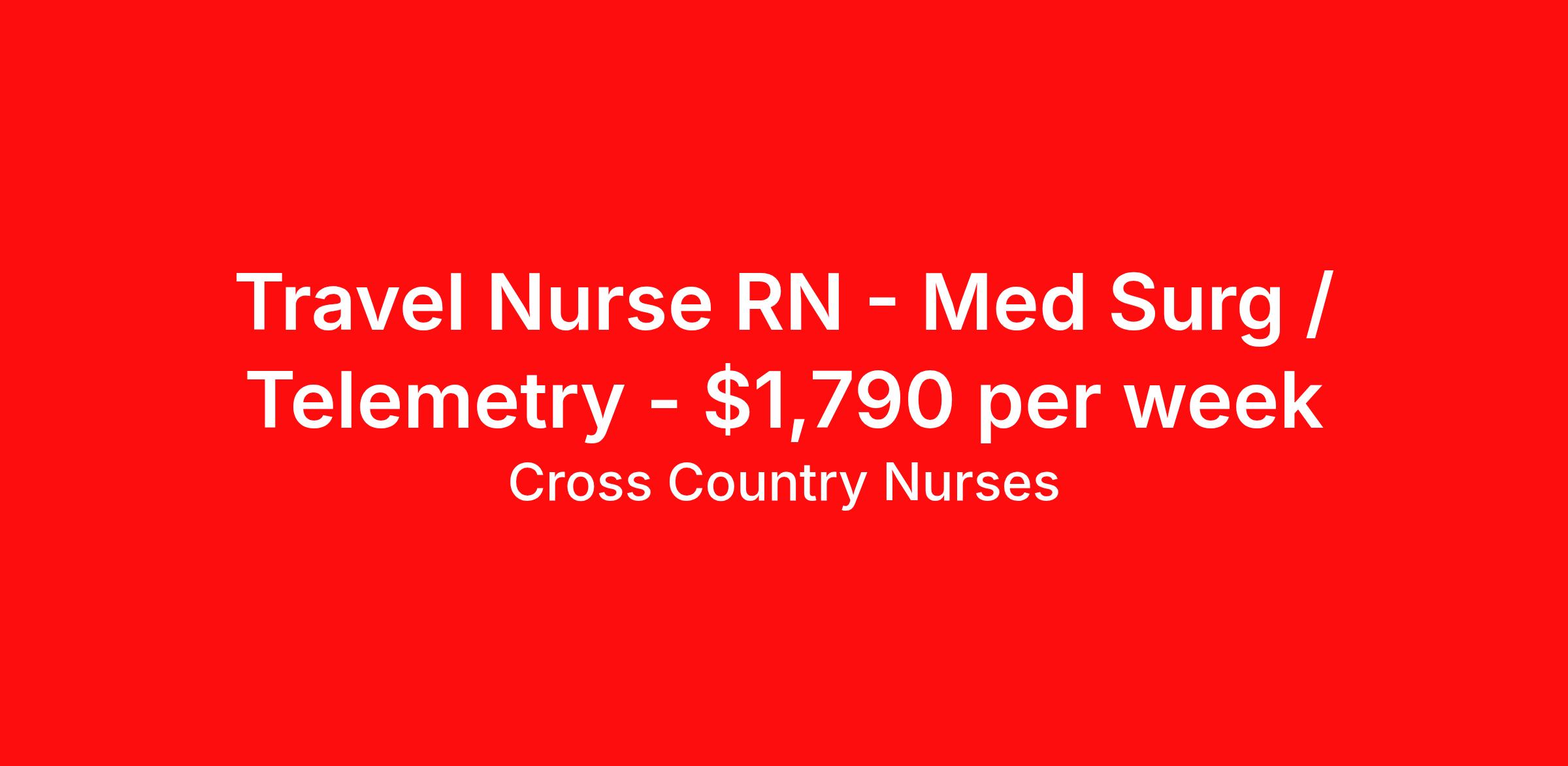 Cross Country Nurses is seeking a travel nurse RN Med Surg / Telemetry for a travel nursing job in Macon, Georgia. Job Description & Requirements Specialty: Med Surg / Telemetry Discipline: RN Start Date: 04/06/2026 Duration: 13 weeks 36 hours per week Shift: 12 hours, nights Employment Type: Travel Job Description As a medical/surgical telemetry nurse (RN M/S-T), you will extend care to patients who are coping with illness, injury or other medical or surgical circumstances. This includes assessing their condition, using telemetry to monitor blood pressure, heart rhythm, respiration and oxygen saturation, administering medication, changing dressings and documenting information in patient charts. You'll also provide continued support and education to patients, promoting their overall health and ensuring that they have the tools to adequately recuperate and prevent further health issues. Minimum Requirements At least 1 year of recent acute care experience in specialty Active RN license Benefits The benefits of taking a travel nursing job with Cross Country include: Private housing or generous housing allowance Comprehensive health insurance with prescription coverage Dependent health insurance with prescription coverage Competitive salaries Referral bonuses Travel reimbursement 401(k) retirement plan Direct deposit/free checking Unlimited free CE credits Posted Date: 2026-03-04 Cross Country Job ID 1208827. Pay package is based on 12 hour shifts and 36 hours per week (subject to confirmation) with tax-free stipend amount to be determined. Posted job title: Registered Nurse / Medical Surgical With Telemetry About Cross Country Nurses You care for others — we’re here to care for you. At Cross Country, we know travel nursing is about more than just the job. It’s about building a career that supports your lifestyle, your values, and your impact. We offer competitive pay, full benefits, and 24/7 support from a team that truly understands what it means to be on the front lines. Wherever your journey takes you, we’re with you every step of the way. Let’s build your best life — one assignment at a time. Benefits 401k retirement plan Referral bonus