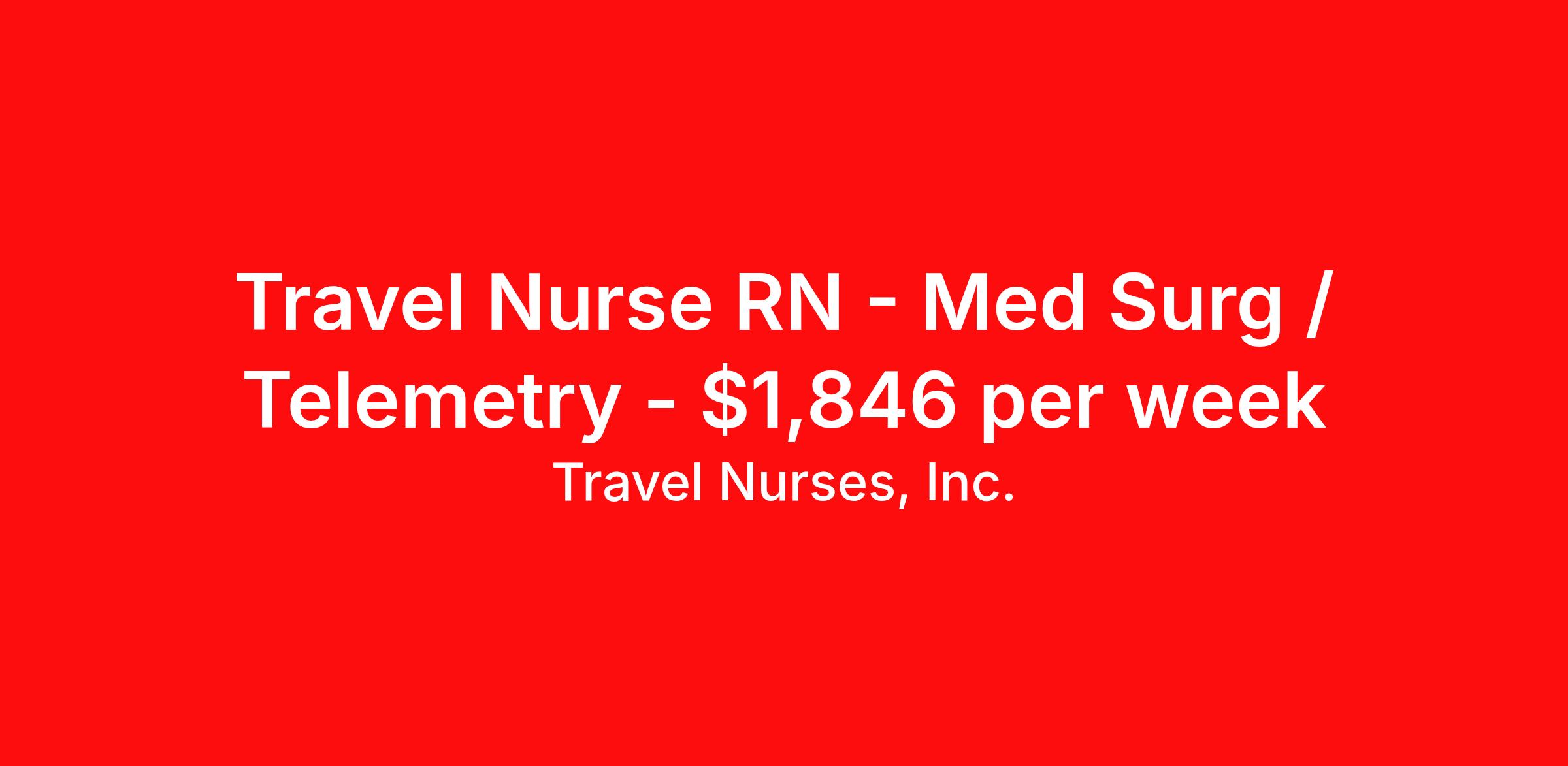 Travel Nurses, Inc. is seeking a travel nurse RN Med Surg / Telemetry for a travel nursing job in Winston-Salem, North Carolina. Job Description & Requirements Specialty: Med Surg / Telemetry Discipline: RN Start Date: 04/13/2026 Duration: 13 weeks 36 hours per week Shift: 12 hours Employment Type: Travel Travel Nurses, Inc. Job ID 309075. Pay package is based on 12 hour shifts and 36 hours per week (subject to confirmation) with tax-free stipend amount to be determined. Posted job title: MS/Tele Registered Nurse About Travel Nurses, Inc. Travel Nurses, Inc. is a leading healthcare staffing agency that provides healthcare professionals with opportunities to work across the country. Founded by nurses in 1988, TNI has more than 30 years of experience in the industry. The agency initially focused on staffing operating room settings in the MidSouth. However, this quickly evolved to encompass all nursing specialties and allied health fields nationwide. At the heart of our mission is a profound respect for nurses, whom we consider the cornerstone of healthcare. This acknowledgment extends beyond the nursing profession alone. Travel Nurses, Inc. now proudly embraces a wide array of healthcare professionals, recognizing their crucial roles in our collective mission. Travel Nurses, Inc. is dedicated to providing comprehensive support and opportunities that will help facilitate complete career mobility in the healthcare field. Our commitment to transparency ensures that all professionals, not just nurses, can confidently accept any assignment without financial uncertainties. We prioritize our professionals’ well-being with comprehensive benefits packages, including day-one healthcare coverage, competitive salaries, bonuses and incentives. This underscores our unwavering commitment to offering the best possible rewards and support for all the professionals we serve. Benefits Weekly pay Continuing Education 401k retirement plan Wellness and fitness programs Mileage reimbursement Referral bonus Employee assistance programs Medical benefits Dental benefits Vision benefits Benefits start day 1 License and certification reimbursement Life insurance Retention bonus