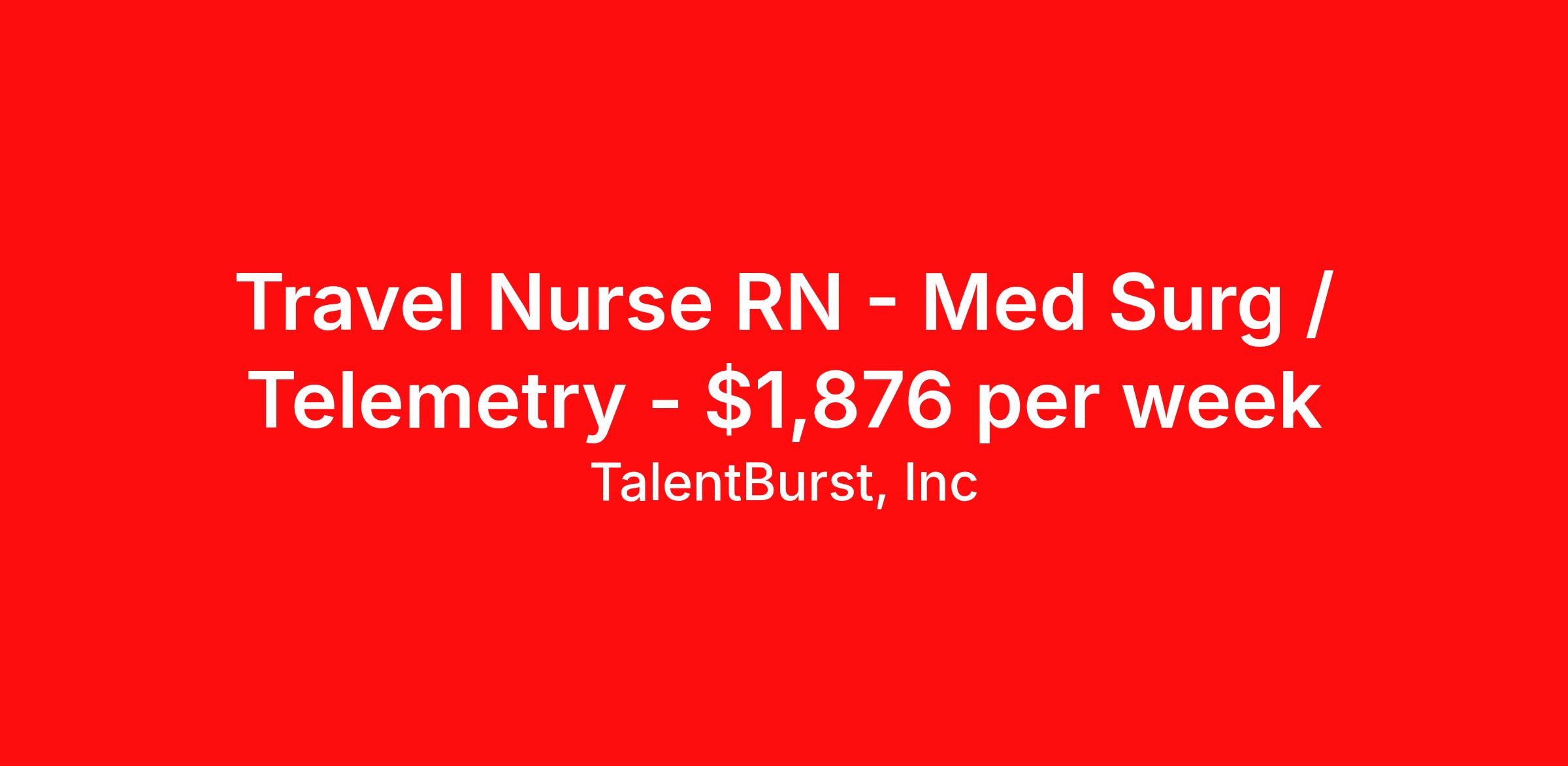 TalentBurst, Inc is seeking a travel nurse RN Med Surg / Telemetry for a travel nursing job in Winston-Salem, North Carolina. Job Description & Requirements Specialty: Med Surg / Telemetry Discipline: RN Start Date: 03/23/2026 Duration: 12 weeks 36 hours per week Shift: 12 hours Employment Type: Travel Primary Purpose The Registered Nurse – Resource Team provides comprehensive nursing care through skillful assessment, diagnosis, outcomes identification, planning, implementation, and evaluation in accordance with facility or department policies, procedures, and/or protocols under the supervision of the nursing leader. The RN Clinical Nurse/RT assists in maintaining a safe work environment and performs all related job responsibilities in a safe manner. The Registered Nurse – Resource Team maintains clinical and professional competency as appropriate to the population of patients served. Must be available to provide nursing services in all patient care areas of expertise and knowledge, at all elected facilities. A registered nurse's practice is guided by the ANA Code of Ethics for Nurses with Interpretive Statements. Major Responsibilities Collects pertinent data and information relative to the healthcare consumer's health or the situation. Analyzes the assessment data to determine the actual or potential diagnoses, problem, and issues. Identifies expected outcomes for a plan individualized to the healthcare consumer or the situation. Develops a plan that prescribes strategies to attain expected, measurable outcomes. Implements the identified plan, coordinates care delivery, and employs strategies to promote health and a safe environment. Delegates elements of care to appropriate healthcare workers in accordance with any applicable legal or policy parameters or principles. Evaluates progress toward attainment of goals and outcomes. Practices ethically. Practices in a manner that is congruent with cultural diversity and inclusion principles. Communicates effectively in all areas of practice. Collaborates with healthcare consumers and other key stakeholders in the conduct of nursing practice. Leads within the professional practice setting and the profession. Seeks knowledge and competence that reflects current nursing practice and promotes futuristic thinking. Integrates evidence and research findings into practice. Contributes to quality nursing practice. Evaluates one's own and others' nursing practice in relation to professional practice standards and guidelines, relevant statutes, rules and regulations. Utilizes appropriate resources to plan, provide, and sustain evidence-based nursing services that are safe, effective, and fiscally responsible. Practices in an environmentally safe and healthy manner. Participate in committees, shared governance, or facility decision making activities, developing and nurturing research to positively affect clinical outcomes and promotion. Models the Atrium Health mission, vision, and value. Supports and contributes to the Patient Centered Care Philosophy by understanding that every teammate is a Caregiver whose role is to meet the needs of the patient. Page 1 Date Printed: 1/28/2025 Job Title: Registered Nurse – Resource Team Job Code: 910CCS Minimum Job Requirements Education Graduate from an accredited School of Professional Nursing. Certification / License Valid, active unencumbered Nursing license approved by the Georgia Licensing Board for GA locations and Alabama Licensing Board for AL locations. BLS required. ACLS required. Work Experience years of nursing experience in specialty area required. Knowledge / Skills / Abilities Patient Population Served Demonstrates knowledge of the principles of growth and development and demonstrates the skills and competency appropriate to the ages, culture, developmental stages, and special needs of the patient population served. Protected Health Information Will limit access to protected health information (PHI) to the information reasonably necessary to do the job. Will share information only on a need-to-know basis for work purposes. Access to verbal, written and electronic PHI for this job has been determined based on job level and job responsibility within the organization. Computerized access to PHI for this job has been determined as described above and is controlled via user ID and password. Machines, Tools, and Equipment All related medical equipment and supplies . Physical Requirements and Working Conditions Work requires walking, standing, sitting, lifting, reaching, stooping, bending, pushing, and pulling. Must be able to lift and support the weight of 35 pounds in handling patients, medical equipment, and supplies. Must speak English in good, understandable terms. Intact sense of sight, hearing, smell, touch. Finger dexterity. Critical thinking and ability to concentrate. Must be able to respond quickly to changes in patient and/or unit conditions. Physical Abilities Testing required. Page 2 Date Printed: 1/28/2025 Job Title: Registered Nurse – Resource Team Job Code: 910CCS Preferred Job Requirements Education BSN preferred Certification / License Experience Knowledge / Skills / Abilities Additional education, training, certifications, or experience may be required within the department by the nurse leader. JOB DESCRIPTION RN - MedSurg/Tele About Facility: 1 Medical Center Blvd. Winston-Salem, NC 27103 885 licensed beds Level 1 Trauma Designation Teaching Hospital: Yes, Academic Medical Center Chest Pain Center Stroke Center Unit Information: Beds: 20 beds total, 10 in 5A and 10 in 5B Minimum Years of Experience required? 2 years of MedSurg experience Will you accept a first-time traveler? No Patient Types/Common Diagnoses: Transitional Care Unit General MedSurg: CHF, COPD, kidney/liver/GI/respiratory issues, CIWA patients, infections, wounds, etc. Mostly medical patients seen on this unit, but any service line can admit, so could see some general surgeries and other patients Patient Ratios: 