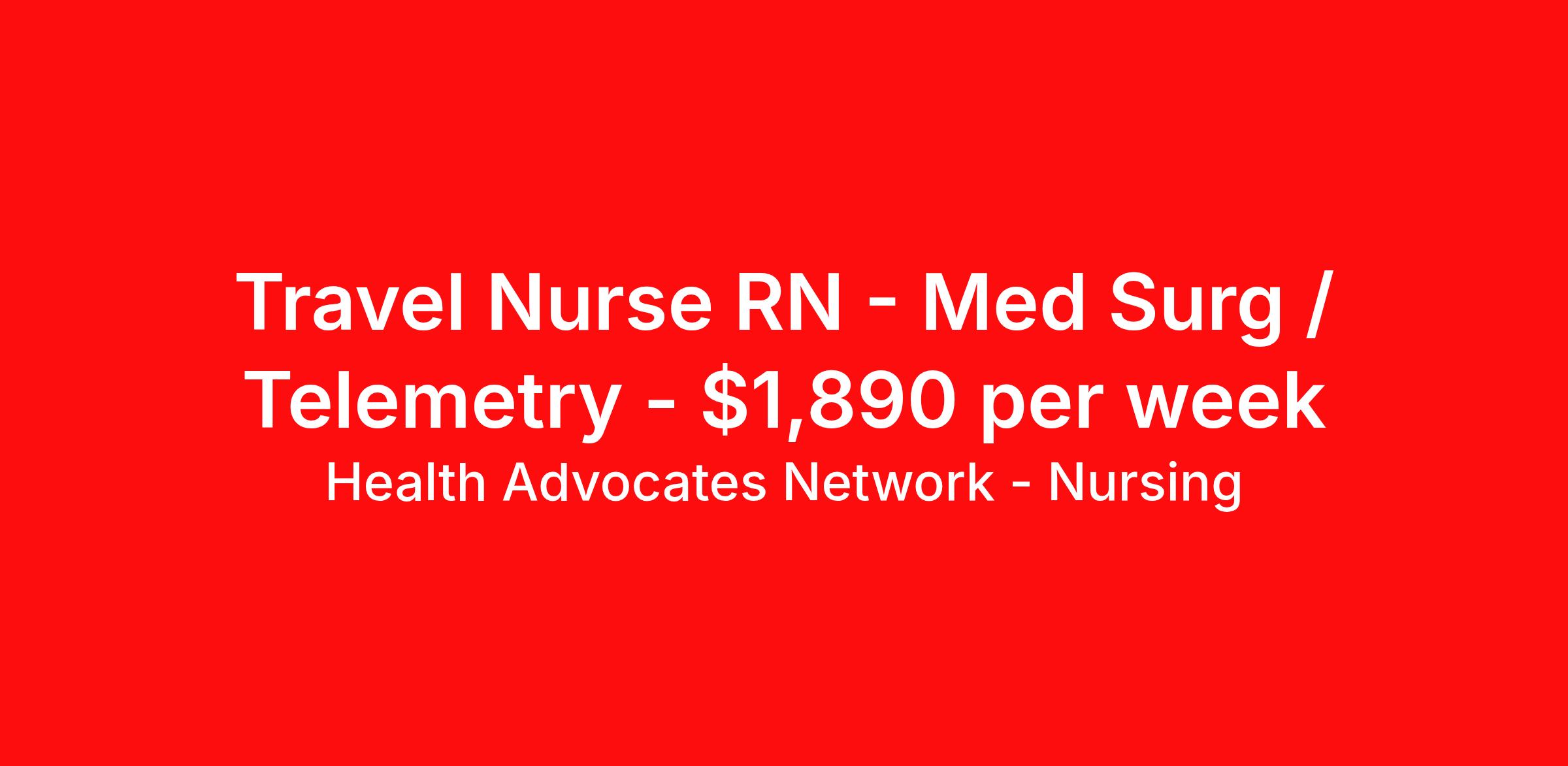 Health Advocates Network - Nursing is seeking a travel nurse RN Med Surg / Telemetry for a travel nursing job in Orangeburg, South Carolina. Job Description & Requirements Specialty: Med Surg / Telemetry Discipline: RN Start Date: 04/07/2026 Duration: 13 weeks 36 hours per week Shift: 12 hours, nights Employment Type: Travel RN – MS/Tele Registered Nurse - Health Advocates Network is urgently hiring MS/Tele RNs with at least 2 years of recent experience! IMMEDIATE STARTS! Travel packages up to $1,890 weekly 12hr NIGHT shifts available 13 week contracts available Specialty: MS/Tele Registered Nurse (RN) Requirements: Active SC State or Compact Registered Nurse License if applicable Certs REQ: BLS Required; ACLS Required, and NIH preferred Graduate of an Accredited School of Nursing Additional certifications may be required Benefits We Offer: Competitive pay rates, Referral Bonus, Medical, Dental and Vision. Travel reimbursement and per diem allowances, Employee discounts, educational opportunities, and more! To apply for this job now or to find out more about other opportunities with Health Advocates Network, Inc. reply to this posting, contact us at or call/text . We can provide you unparalleled access to exciting career opportunities. Health Advocates Network, Inc . is an equal opportunity employer. All qualified applicants shall receive consideration for employment without regard to any legally protected basis protected by applicable federal or state law except where a bona fide occupational qualification applies. Refer a Registered Nurse for a $1,000.00 bonus opportunity! HANStaff Job ID 515491. Pay package is based on 12 hour shifts and 36 hours per week (subject to confirmation) with tax-free stipend amount to be determined. Posted job title: RN - M/S Tele About Health Advocates Network - Nursing Health Advocates Network was founded on the basis of a shared aspiration, to improve the way healthcare staffing is done. We are a company established and led by nurses. Our flexible approach enables us to develop solutions customized to your specific needs. From short- and long-term travel contracts to local and per diem assignments and more, we are here to get you to your next adventure! By solving challenges, providing the best placements, and advocating for you, we stand to help you thrive and pave the path forward in your career. Click on the videos below to learn more about our values!