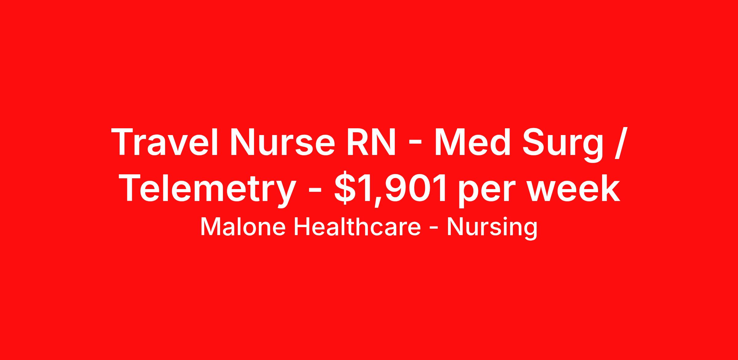 Malone Healthcare - Nursing is seeking a travel nurse RN Med Surg / Telemetry for a travel nursing job in Greensboro, North Carolina. Job Description & Requirements Specialty: Med Surg / Telemetry Discipline: RN Start Date: 04/13/2026 Duration: 13 weeks 36 hours per week Shift: 12 hours, nights Employment Type: Travel Let's connect to know more. About Malone Healthcare - Nursing With a commitment to providing a higher standard of service and experience in patient care, Malone Healthcare places expert nurses and allied health professionals in rewarding careers throughout the United States. As a leading healthcare staffing agency, Malone’s focus on compliance and integrity translates to a seamless experience for our team members and partner facilities. When you work with Malone Healthcare, you can rely on over 50 years of proven experience placing exceptional professionals in quality healthcare settings. Benefits Weekly pay Holiday Pay Guaranteed Hours Continuing Education 401k retirement plan Pet insurance Referral bonus Medical benefits Dental benefits Vision benefits License and certification reimbursement Life insurance