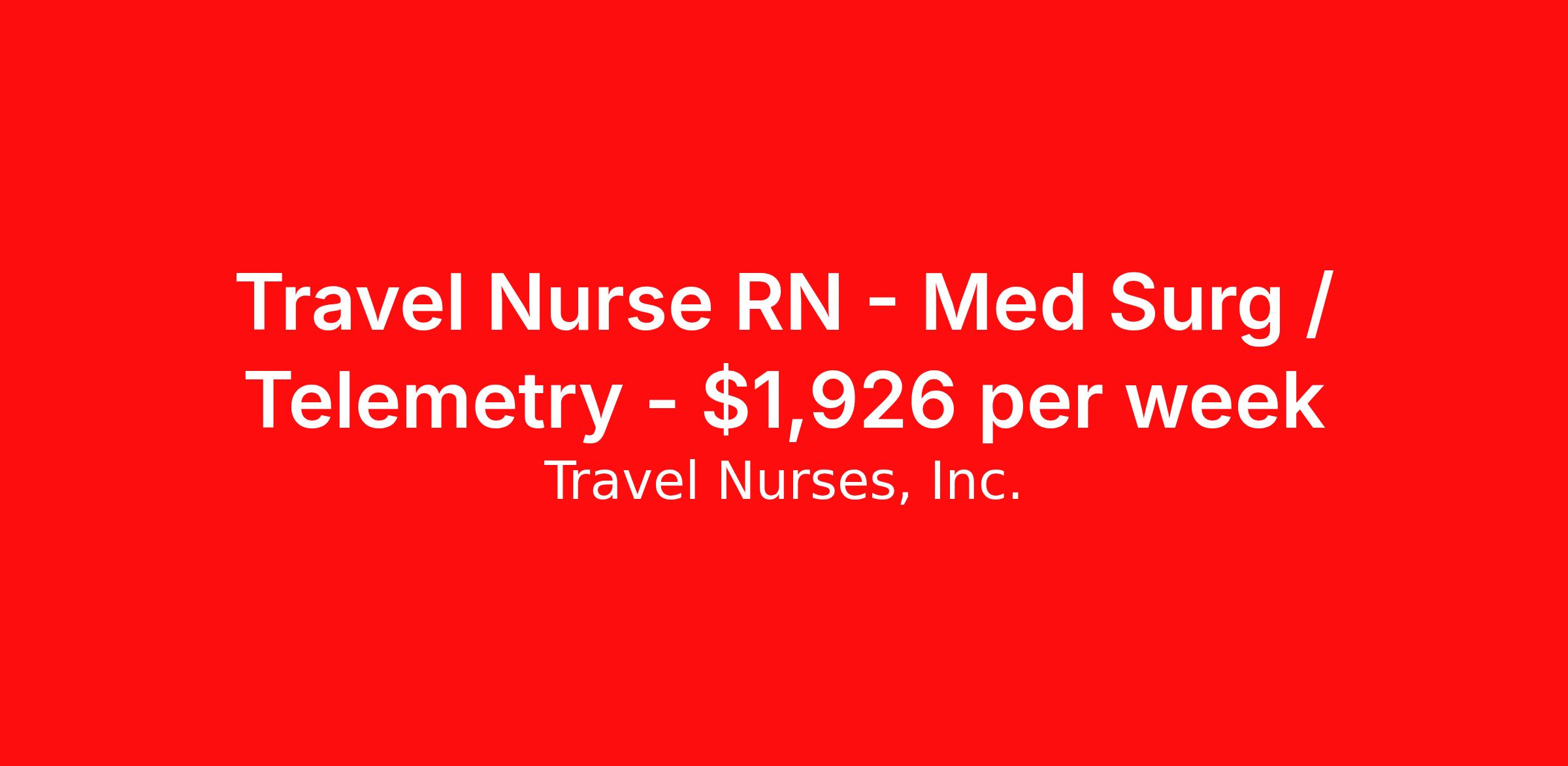 Travel Nurses, Inc. is seeking a travel nurse RN Med Surg / Telemetry for a travel nursing job in Tucson, Arizona. Job Description & Requirements Specialty: Med Surg / Telemetry Discipline: RN Start Date: ASAP Duration: 13 weeks 40 hours per week Shift: 8 hours Employment Type: Travel Travel Nurses, Inc. Job ID 301497. Pay package is based on 8 hour shifts and 40 hours per week (subject to confirmation) with tax-free stipend amount to be determined. Posted job title: *CHS Travel: FP - Registered Nurse (RN) / MS / Telemetry (Tele) - Nights About Travel Nurses, Inc. Travel Nurses, Inc. is a leading healthcare staffing agency that provides healthcare professionals with opportunities to work across the country. Founded by nurses in 1988, TNI has more than 30 years of experience in the industry. The agency initially focused on staffing operating room settings in the MidSouth. However, this quickly evolved to encompass all nursing specialties and allied health fields nationwide. At the heart of our mission is a profound respect for nurses, whom we consider the cornerstone of healthcare. This acknowledgment extends beyond the nursing profession alone. Travel Nurses, Inc. now proudly embraces a wide array of healthcare professionals, recognizing their crucial roles in our collective mission. Travel Nurses, Inc. is dedicated to providing comprehensive support and opportunities that will help facilitate complete career mobility in the healthcare field. Our commitment to transparency ensures that all professionals, not just nurses, can confidently accept any assignment without financial uncertainties. We prioritize our professionals’ well-being with comprehensive benefits packages, including day-one healthcare coverage, competitive salaries, bonuses and incentives. This underscores our unwavering commitment to offering the best possible rewards and support for all the professionals we serve. Benefits Weekly pay Continuing Education 401k retirement plan Wellness and fitness programs Mileage reimbursement Referral bonus Employee assistance programs Medical benefits Dental benefits Vision benefits Benefits start day 1 License and certification reimbursement Life insurance Retention bonus