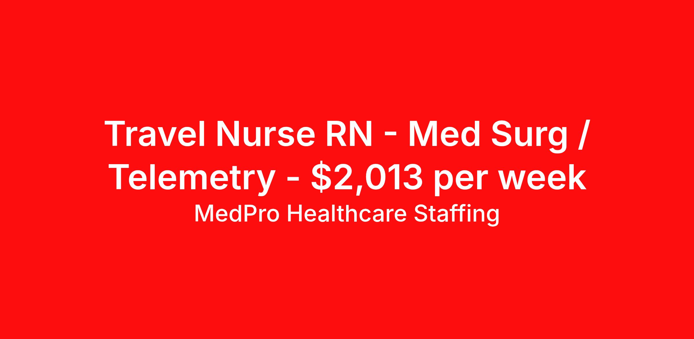 MedPro Healthcare Staffing is seeking a travel nurse RN Med Surg / Telemetry for a travel nursing job in Northport, Alabama. Job Description & Requirements Specialty: Med Surg / Telemetry Discipline: RN Start Date: 04/13/2026 Duration: 13 weeks 36 hours per week Shift: 12 hours Employment Type: Travel MedPro Healthcare Staffing , a Joint Commission-certified staffing agency, is seeking a quality Med-Surg registered nurse (RN) for a travel assignment with one of our top healthcare clients. Requirements Active RN License Degree from accredited nursing program BLS Certifications Eighteen months of recent experience in an Acute Care Med/Surg setting Other requirements to be determined by our client facility Benefits Weekly pay and direct deposit Full coverage of all credentialing fees Private housing or housing allowance Group Health insurance for you and your family Company-paid life and disability insurance Travel reimbursement 401(k) matching Unlimited Referral Bonuses up to $1,000 Duties Responsibilities Med-Surg Nurses (RN) provide care for primarily adult patients before and after surgical procedures; they also attend to those who are being treated with pharmaceuticals to manage illness. Due to the broad range of medical conditions Med/Surg Nurses will encounter, they must be well-versed in a large variety of health conditions. Complete assignments made by physicians. Provide routine treatment and post-surgical care. Assess changes in patient's health status and perform various treatments. Administer medication. Meticulous documentation as to medication and treatment administration to ensure continuity of care between nursing staff, physicians and other treatment team members. About Agency MedPro Healthcare Staffing is a Joint Commission certified provider of contract staffing services. Since 1983, we have placed nursing and allied travelers in top healthcare facilities nationwide. Join us today for your very own MedPro Experience®. If qualified and interested, please call for immediate consideration. MedPro Staffing is an Equal Opportunity Employer. All applicants will be considered for employment without attention to race, color, religion, national origin, age, sex, disability, marital status or veteran status. Key Words: Registered Nurse, RN, Medical-Surgical, Travel Nurse, Contract Nurse, Agency Nurse, Agency RN, RN-MS, RN- Medical Surgical, Travel RN, Contract, Nursing, RN Med-Surg, Travel Nursing *Weekly payment estimates are intended for informational purposes only and include a gross estimate of hourly wages and reimbursements for meal, incidental, and housing expenses. Your recruiter will confirm your eligibility and provide additional details. MedPro Job ID a0Fcx00000HsHJpEAN. Pay package is based on 12 hour shifts and 36 hours per week (subject to confirmation) with tax-free stipend amount to be determined. Posted job title: Med-Surg/Telemetry Registered Nurse Nursing: Med Surg/Tele. About MedPro Healthcare Staffing At MedPro Healthcare Staffing , we believe no one cares more for caregivers than we do. Our mission is simple: you focus on your patients, and we’ll take care of the rest. As a Joint Commission-certified leader in temporary and contract healthcare staffing since 1983, MedPro has proudly connected nursing and allied travelers with top healthcare facilities across the nation. With thousands of job opportunities available nationwide, we make it easy to find assignments that align with your goals and lifestyle. Our on-staff clinical support team—alongside a compassionate group of experienced recruiters—provides hands-on guidance every step of the way. From Day 1 medical benefits and a 401(k) plan to personalized career support, we’re committed to ensuring every professional we serve feels valued, cared for, and empowered to succeed. Guided by a CEO who is a Registered Nurse, MedPro is built on a foundation of clinical insight and genuine compassion for the caregiving community. Through The MedPro Experience® , we deliver travel assignments that are rewarding, memorable, and designed to help you DREAM big, EXPLORE often, and ACHIEVE greatness. Benefits Day 1 medical, dental, and vision benefits for you and your family Weekly pay and direct deposit Unlimited Referral Bonuses starting at $500 On Staff Clinical Support Team Access to nationwide travel assignments MPX Mobile app -24/7 real-time access to jobs, credentials, assignment details, and more Full coverage of all credentialing fees Private housing or housing allowance Tax Free Per Diems, Housing Stipends and Travel Reimbursements Company-paid life and disability insurance Travel reimbursement 401(k) matching Benefits Weekly pay Referral bonus Employee assistance programs