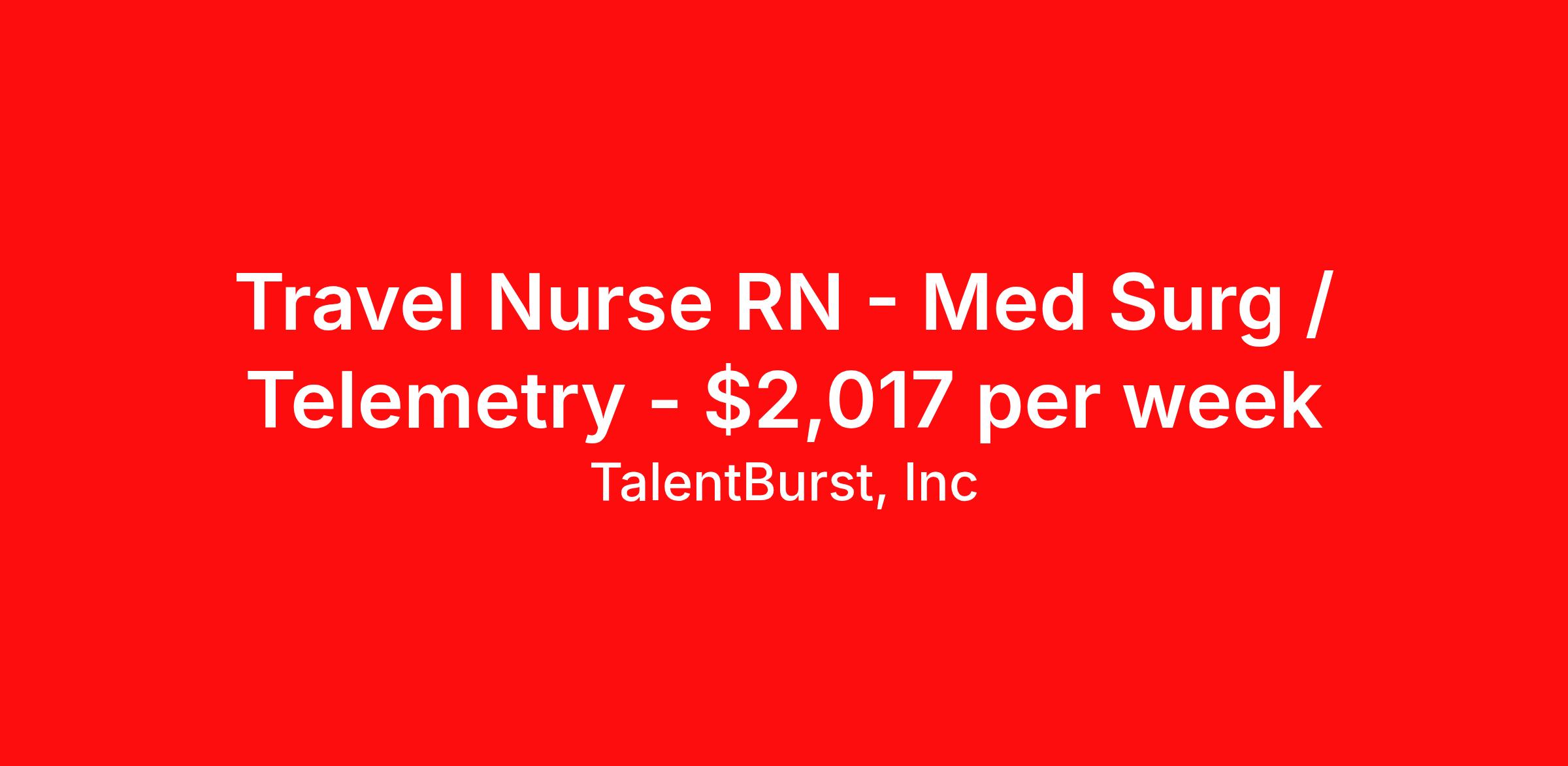 TalentBurst, Inc is seeking a travel nurse RN Med Surg / Telemetry for a travel nursing job in Charlotte, North Carolina. Job Description & Requirements Specialty: Med Surg / Telemetry Discipline: RN Start Date: 04/20/2026 Duration: 13 weeks 36 hours per week Shift: 12 hours, nights Employment Type: Travel JOB DESCRIPTION RN - MedSurg/Tele ● About Facility: · 207 licensed beds · No Trauma Designation · Not a Teaching Hospital · Chest Pain Center · Stroke Center · Radius rule: Traveler's permanent address must be 50 miles outside of home unit ● Unit Information: · Beds: Will vary based on unit · Minimum Years of Experience required: 18 months Med/Tele RN (Resource Team requirement) · Will you accept a first-time traveler: Not preferred but will consider ● Patient Types/Common Diagnoses: o Will be assigned a home unit on the first day of orientation 3N Medical Telemetry · 31 Beds · Patient Types: End Stage Renal; PD; Fluid overload; Sickle cell; DM; Altered mental status; Cellulitis; Diabetic ulcers; Pancreatitis; Behavioral health ● Patient Ratios: · RN: 1:5-6 (critical surge 1:7-8) · CNA: 1:6-12 ● Required Licensure & Certifications: · BLS, ACLS, NIHSS (Resource Team requirement) ● Skills required: · General Med/Tele skillset: Stroke experience, cardiac rhythm interpretation, trach care, PIV starts, chest tube management, NGT placement, drain/tube management (Dobhoff, PEG tubes, Hemovac, JP drains, flexiseals, foley insertion/management, etc), PCA pumps · Medication gtt management to include: Cardiac drips, Heparin, blood products, IVF ● Support within the Department: · CNA · Receptionist/HUC · Charge nurse – may or may not have patients · Phlebotomy – peripheral blood draws · IV/VAT Team: 11a-7p, 11p-7a · Resource Nurse – as staffing allows · RT, 24/7 · Hospitalist, 24/7 · Intensivist - ICU provider in house until 11p M-F, till 7p Sat/Sun, VCC coverage and on call Intensivist · Telemetry monitoring/tech? no ● Technology/Equipment: · EMR: Epic · IV Pump: Alaris · Med dispensing: Omnicell · Monitors: Phillips ● Floating: If yes, where? · All units within scope at Mercy · Within region and scope of practice · Will be required to float per region needs – will require floating to all facilities listed below, as needed, within scope of practice – DECLINE if not agreeable · Please see job posting for dedicated region and discuss the region that applies (will change per requisition) ▪ Region 1 - Cabarrus, University City, Stanly, Lake Norman, Central Division (CMC Main Mercy LCH (peds only) could float to any of the facilities within region if the need arises ▪ Region 2 - Pineville, Anson, Union, Union West, Central Division (CMC Main CMC Mercy Levine Children's Hospital) ▪ Region 3 - Cleveland, Kings Mtn, Lincoln, Central Division (CMC Main Mercy LCH) ▪ If floating mid-shift, Traveler will be paid for the time traveling between facilities (will remain on the clock) ● Orientation (facility and unit): · NEO · 2 days departmental ● Scheduling: · Weekend rotation: every other · No call · Holiday Expectations: Travelers will work 75% of holidays · RTO: Can approve up to 6 days off, excluding holidays – must add time to the end of the contract if unable to meet contracted hours · Schedule cycle: every 6 weeks ● Other notes: · Scrub Color: Navy · Parking: Free JobDiva 26-07027 (M) About TalentBurst, Inc TalentBurst Health & Life Sciences is an established provider of healthcare workforce solutions, servicing healthcare facilities across the United States for over 15 years. As a Joint Commission Certified Agency, our commitment to quality, integrity, and exceptional service has made us a trusted name in the healthcare staffing landscape. Our mission is to bridge the gap between healthcare professionals seeking fulfilling opportunities and healthcare organizations striving to maintain their high standards of care. We are committed to providing top-notch healthcare professionals with access to facilities where they can focus on delivering exceptional patient care and thrive. Whether you're a nurse, allied health professional, or administrative personnel, we have the expertise to match your skills and aspirations with the perfect placement.