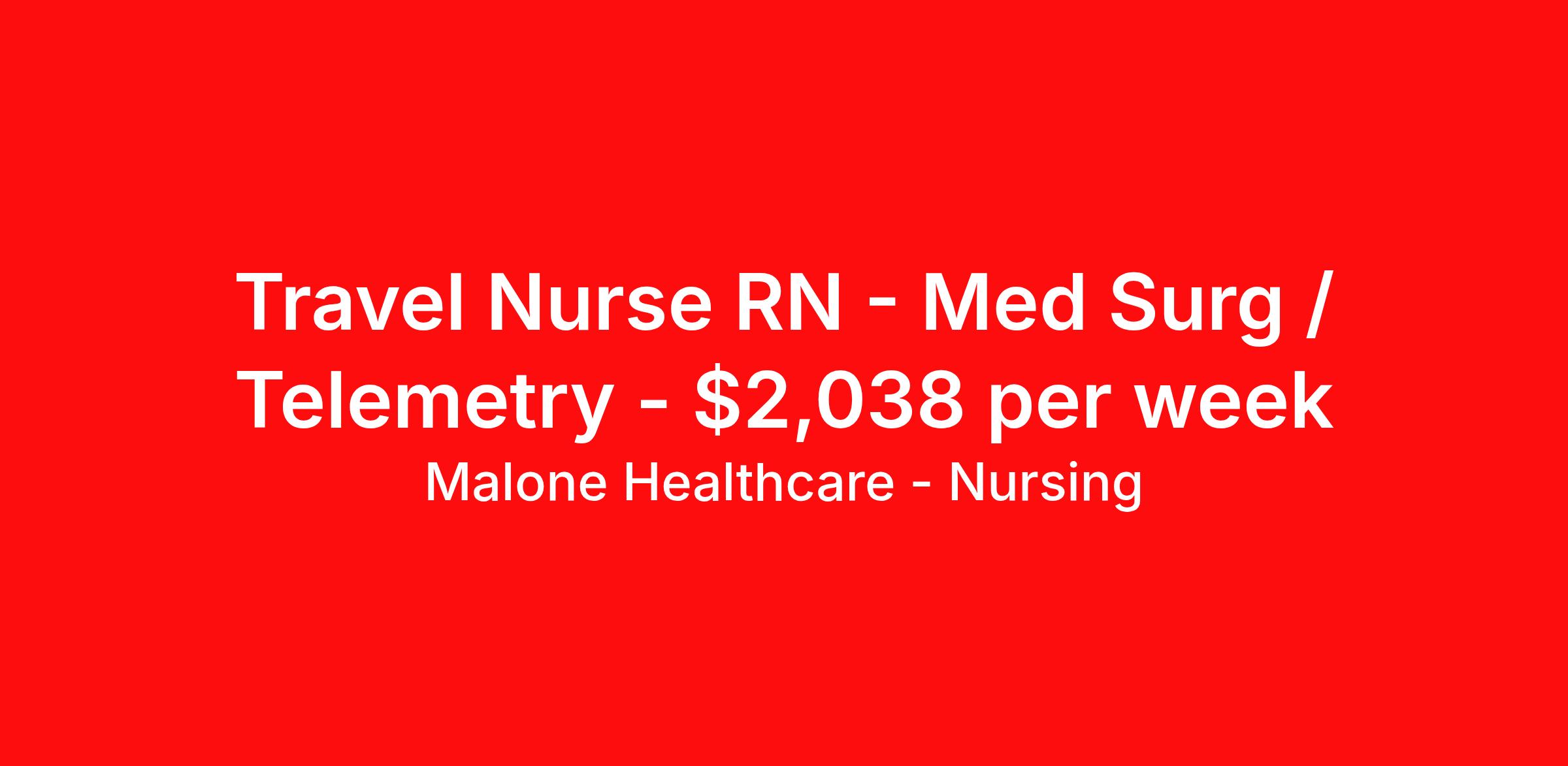Malone Healthcare - Nursing is seeking a travel nurse RN Med Surg / Telemetry for a travel nursing job in Elizabethtown, Kentucky. Job Description & Requirements Specialty: Med Surg / Telemetry Discipline: RN Start Date: 04/06/2026 Duration: 13 weeks 36 hours per week Shift: 12 hours, nights Employment Type: Travel About Malone Healthcare - Nursing With a commitment to providing a higher standard of service and experience in patient care, Malone Healthcare places expert nurses and allied health professionals in rewarding careers throughout the United States. As a leading healthcare staffing agency, Malone’s focus on compliance and integrity translates to a seamless experience for our team members and partner facilities. When you work with Malone Healthcare, you can rely on over 50 years of proven experience placing exceptional professionals in quality healthcare settings. Benefits Weekly pay Holiday Pay Guaranteed Hours Continuing Education 401k retirement plan Pet insurance Referral bonus Medical benefits Dental benefits Vision benefits License and certification reimbursement Life insurance