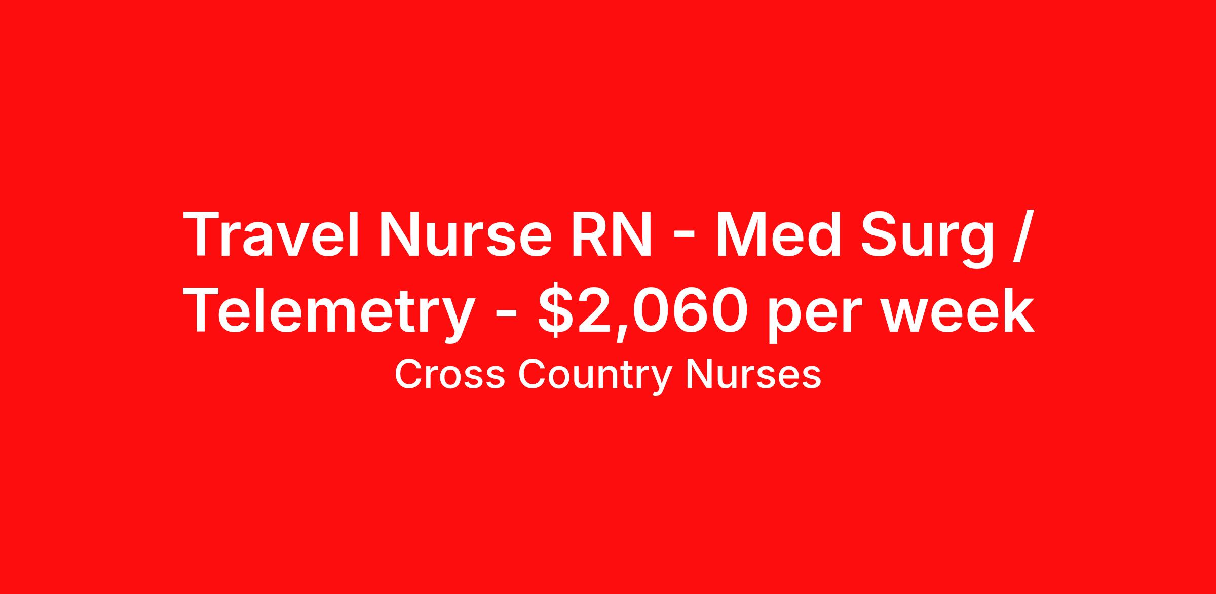 Cross Country Nurses is seeking a travel nurse RN Med Surg / Telemetry for a travel nursing job in Fort Smith, Arkansas. Job Description & Requirements Specialty: Med Surg / Telemetry Discipline: RN Start Date: 03/30/2026 Duration: 13 weeks 36 hours per week Shift: 12 hours, nights Employment Type: Travel Job Description As a medical/surgical telemetry nurse (RN M/S-T), you will extend care to patients who are coping with illness, injury or other medical or surgical circumstances. This includes assessing their condition, using telemetry to monitor blood pressure, heart rhythm, respiration and oxygen saturation, administering medication, changing dressings and documenting information in patient charts. You'll also provide continued support and education to patients, promoting their overall health and ensuring that they have the tools to adequately recuperate and prevent further health issues. Minimum Requirements At least 1 year of recent acute care experience in specialty Active RN license Benefits The benefits of taking a travel nursing job with Cross Country include: Private housing or generous housing allowance Comprehensive health insurance with prescription coverage Dependent health insurance with prescription coverage Competitive salaries Referral bonuses Travel reimbursement 401(k) retirement plan Direct deposit/free checking Unlimited free CE credits Cross Country Job ID 1230184. Pay package is based on 12 hour shifts and 36 hours per week (subject to confirmation) with tax-free stipend amount to be determined. Posted job title: Registered Nurse / Medical Surgical With Telemetry About Cross Country Nurses You care for others — we’re here to care for you. At Cross Country, we know travel nursing is about more than just the job. It’s about building a career that supports your lifestyle, your values, and your impact. We offer competitive pay, full benefits, and 24/7 support from a team that truly understands what it means to be on the front lines. Wherever your journey takes you, we’re with you every step of the way. Let’s build your best life — one assignment at a time. Benefits 401k retirement plan Referral bonus