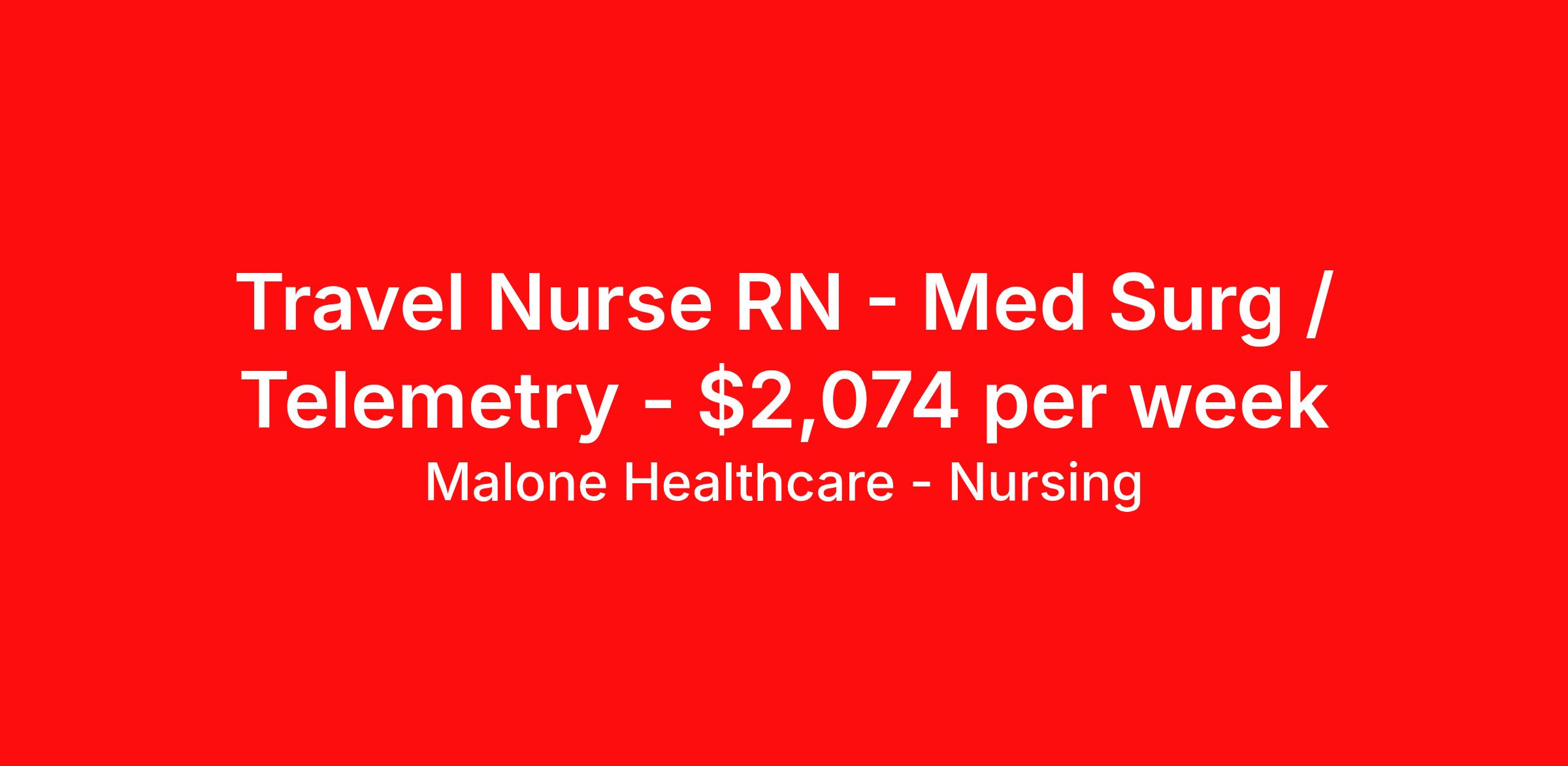 Malone Healthcare - Nursing is seeking a travel nurse RN Med Surg / Telemetry for a travel nursing job in Elizabethtown, Kentucky. Job Description & Requirements Specialty: Med Surg / Telemetry Discipline: RN Start Date: 04/25/2026 Duration: 13 weeks 36 hours per week Shift: 12 hours, nights Employment Type: Travel Night shift: 3x12 hours (7:00 PM – 7:00 AM) Patient ratio: 1:4–6 Requirement: BLS certification Skills: O2 protocol & non-invasive airway management Care: Peripheral line management & isolation/PPE protocols Experience: Minimum 1 year recent experience EPIC required Responsibilities: Computerized documentation & rapid response activation About Malone Healthcare - Nursing With a commitment to providing a higher standard of service and experience in patient care, Malone Healthcare places expert nurses and allied health professionals in rewarding careers throughout the United States. As a leading healthcare staffing agency, Malone’s focus on compliance and integrity translates to a seamless experience for our team members and partner facilities. When you work with Malone Healthcare, you can rely on over 50 years of proven experience placing exceptional professionals in quality healthcare settings. Benefits Weekly pay Holiday Pay Guaranteed Hours Continuing Education 401k retirement plan Pet insurance Referral bonus Medical benefits Dental benefits Vision benefits License and certification reimbursement Life insurance
