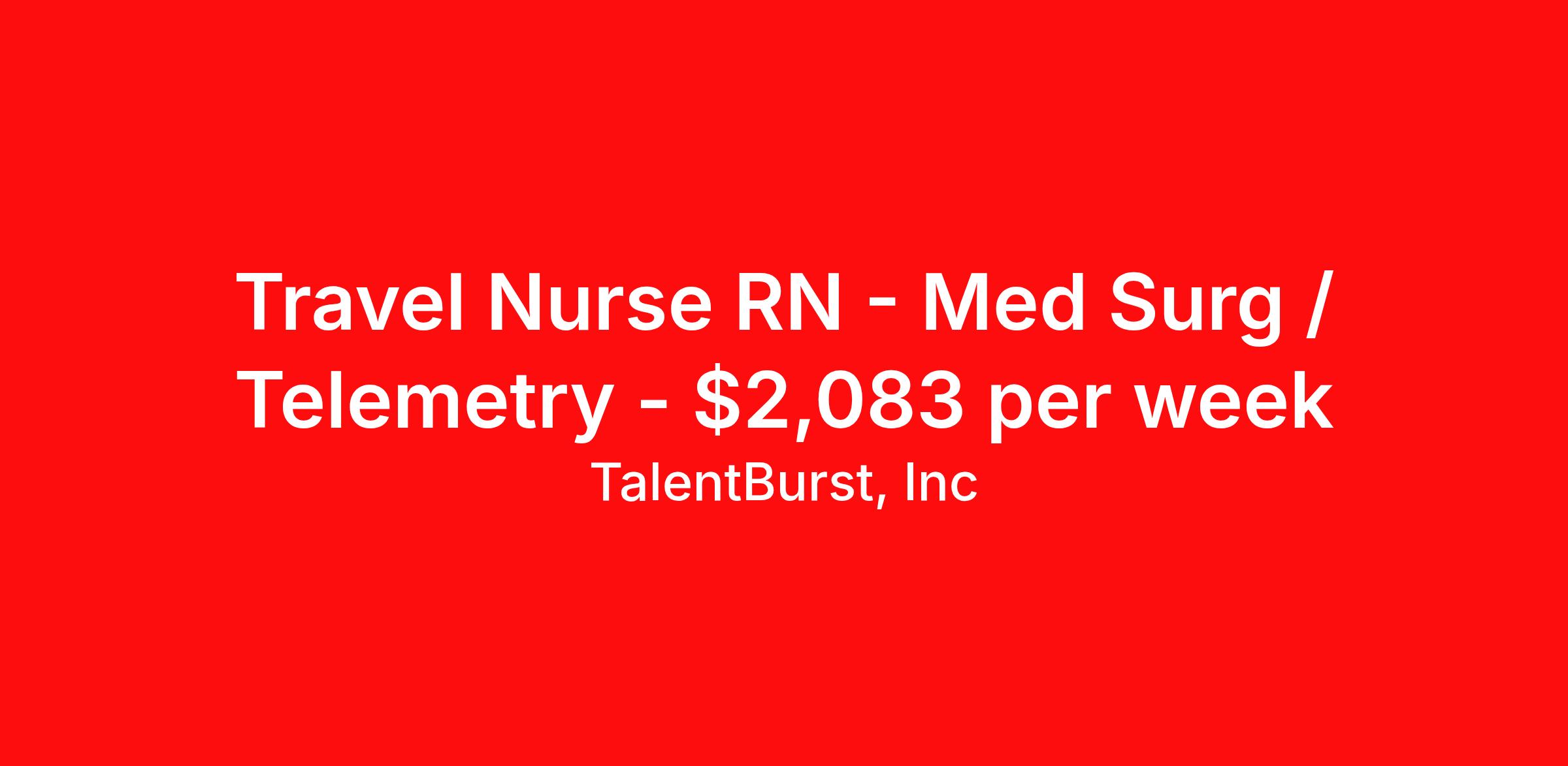 TalentBurst, Inc is seeking a travel nurse RN Med Surg / Telemetry for a travel nursing job in Slidell, Louisiana. Job Description & Requirements Specialty: Med Surg / Telemetry Discipline: RN Start Date: 04/20/2026 Duration: 8 weeks 36 hours per week Shift: 12 hours, nights Employment Type: Travel Departments : Medical Surgical Tele Stepdown Job Title : RN - PCU Specialty : Progressive Intermediate Step Down PCU Location : Slidell, LA 70460 Shift : Night Shift 12 Hour, 645p - 715a Duration : 8 Weeks Supplier Notes: med surg tele stepdown RN BLS/ACLS required, please upload both at submission Job Description This job acts as a leader in the provision of patient care using the nursing process within the framework of the Nurse Practice Act, ANA Code for Nurses and Scope & Standards of Practice. Effectively delegates, directs and assists licensed and ancillary team members; assumes accountability for quality patient outcomes; exhibits sensitivity to cultural, ethnic and religious diversity in all interactions; maintains involvement in activities aimed toward the achievement of unit and the department’s strategic goals and objectives and demonstrates professional responsibility and accountability for his/her own practice and supports the company's philosophy of nursing. Education Required - Registered nurse diploma. Preferred - Associate or bachelor's degree in nursing. Experience Required - 2 years Certifications Required - Current registered nurse (RN) license in state of practice. Current Basic Life Support (BLS) certification from the American Heart Association. Current Advanced Cardiac Life Support (ACLS) certification from the American Heart Association. Preferred - Certification in clinical specialty area. KSAs Proficiency in using computers, software, and web-based applications. Effective verbal and written communication skills and ability to present information clearly and professionally. Strong interpersonal skills. Good organizational and time management skills and ability to be self-directed. Ability to demonstrate good judgement. Job Duties Effectively uses the nursing process in the delivery of patient care. Assesses learning needs and implements teaching strategies appropriate for the diverse needs of the patient, family and other groups or disciplines. Communicates, delegates, and manages nursing team resources (human and fiscal) properly and serves as a leader and partner on the interdisciplinary team. Uses data, information, and knowledge to evaluate and promote change in order to achieve optimal outcomes. Embraces concepts and behaviors that enhance customer satisfaction and employee morale and improvement in the profession of nursing. Adapts behavior to the specific patient population, including but not limited to respect for privacy, method of introduction to the patient, adapting explanation of services or procedures to be performed, requesting permissions and communication style. Performs other related duties as required. The above statements describe the general nature and level of work only. They are not an exhaustive list of all required responsibilities, duties, and skills. Other duties may be added, or this description amended at any time. This employer maintains and complies with its Compliance & Privacy Program and Standards of Conduct, including the immediate reporting of any known or suspected unethical or questionable behaviors or conduct; patient/employee safety, patient privacy, and/or other compliance-related concerns. The employer is an Equal Opportunity Employer. All qualified applicants will receive consideration for employment without regard to race, color, religion, sex, sexual orientation, gender identity, national origin, protected veteran status, or disability status. Physical and Environmental Demands The physical essential functions of this job include (but are not limited to) the following: Frequently exerting 10 to 20 pounds of force to move objects; occasionally exerting up to 100 pounds of force. Physical demand requirements are in excess of those for sedentary work. Reasonable accommodations may be made to enable individuals with disabilities to perform the essential functions. Duties performed routinely require exposure to blood, body fluid and tissue. The incumbent works in a patient care area; works in an area where patients enter; works directly with patients; and/or works with specimens that could contain communicable diseases. There may be an occupational risk for exposure to communicable diseases. Because the incumbent works within a healthcare setting, there may be occupational risk for exposure to hazardous medications or hazardous waste within the environment through receipt, transport, storage, preparation, dispensing, administration, cleaning and/or disposal of contaminated waste. The risk level of exposure may increase depending on the essential job duties of the role. JobDiva 26-07548 (M) About TalentBurst, Inc TalentBurst Health & Life Sciences is an established provider of healthcare workforce solutions, servicing healthcare facilities across the United States for over 15 years. As a Joint Commission Certified Agency, our commitment to quality, integrity, and exceptional service has made us a trusted name in the healthcare staffing landscape. Our mission is to bridge the gap between healthcare professionals seeking fulfilling opportunities and healthcare organizations striving to maintain their high standards of care. We are committed to providing top-notch healthcare professionals with access to facilities where they can focus on delivering exceptional patient care and thrive. Whether you're a nurse, allied health professional, or administrative personnel, we have the expertise to match your skills and aspirations with the perfect placement.