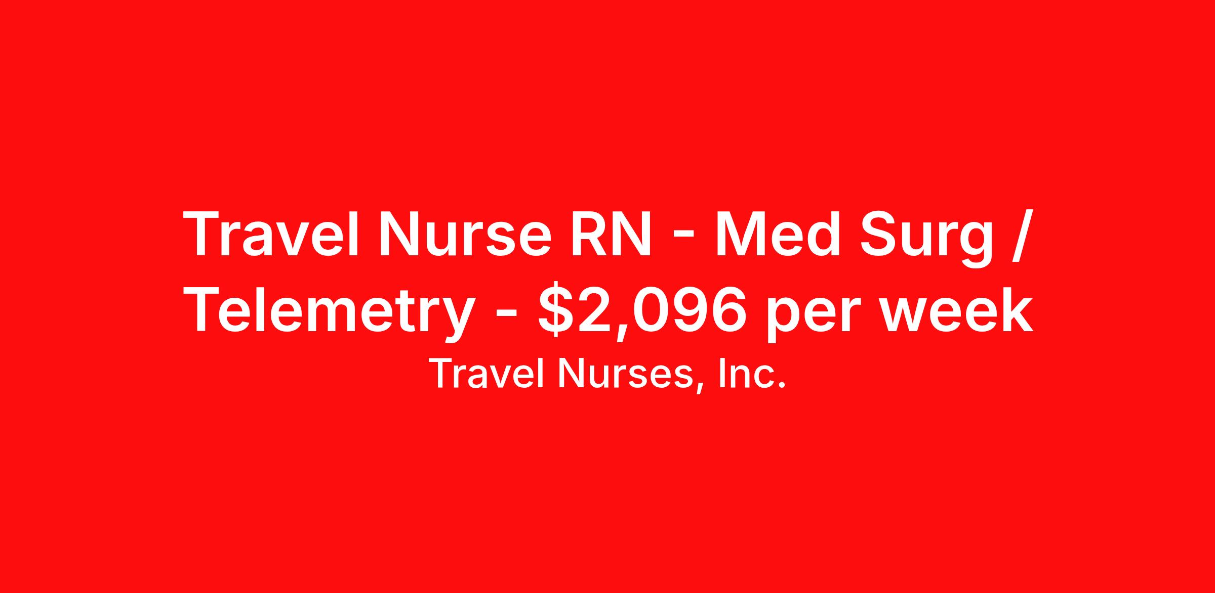 Travel Nurses, Inc. is seeking a travel nurse RN Med Surg / Telemetry for a travel nursing job in Princeton, Indiana. Job Description & Requirements Specialty: Med Surg / Telemetry Discipline: RN Start Date: ASAP Duration: 13 weeks 36 hours per week Shift: 12 hours Employment Type: Travel Travel Nurses, Inc. Job ID 272031. Pay package is based on 12 hour shifts and 36 hours per week (subject to confirmation) with tax-free stipend amount to be determined. Posted job title: Medical Surgical / Telemetry Registered Nurse Days - Deaconess Gibson Hospital, Princeton, IN About Travel Nurses, Inc. Travel Nurses, Inc. is a leading healthcare staffing agency that provides healthcare professionals with opportunities to work across the country. Founded by nurses in 1988, TNI has more than 30 years of experience in the industry. The agency initially focused on staffing operating room settings in the MidSouth. However, this quickly evolved to encompass all nursing specialties and allied health fields nationwide. At the heart of our mission is a profound respect for nurses, whom we consider the cornerstone of healthcare. This acknowledgment extends beyond the nursing profession alone. Travel Nurses, Inc. now proudly embraces a wide array of healthcare professionals, recognizing their crucial roles in our collective mission. Travel Nurses, Inc. is dedicated to providing comprehensive support and opportunities that will help facilitate complete career mobility in the healthcare field. Our commitment to transparency ensures that all professionals, not just nurses, can confidently accept any assignment without financial uncertainties. We prioritize our professionals’ well-being with comprehensive benefits packages, including day-one healthcare coverage, competitive salaries, bonuses and incentives. This underscores our unwavering commitment to offering the best possible rewards and support for all the professionals we serve. Benefits Weekly pay Continuing Education 401k retirement plan Wellness and fitness programs Mileage reimbursement Referral bonus Employee assistance programs Medical benefits Dental benefits Vision benefits Benefits start day 1 License and certification reimbursement Life insurance Retention bonus