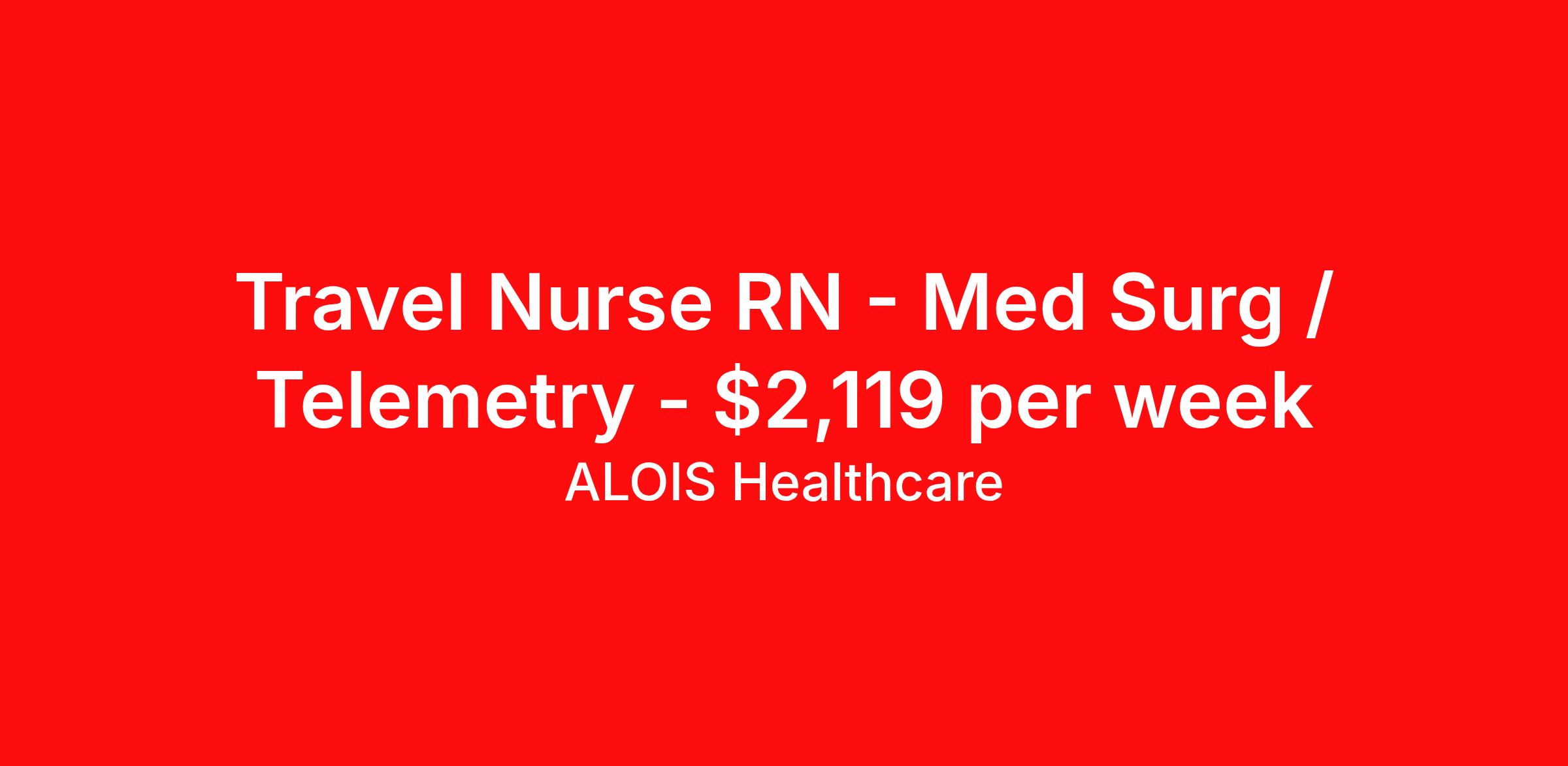 ALOIS Healthcare is seeking a travel nurse RN Med Surg / Telemetry for a travel nursing job in Lafayette, Louisiana. Job Description & Requirements Specialty: Med Surg / Telemetry Discipline: RN Start Date: 04/06/2026 Duration: 8 weeks 36 hours per week Shift: 12 hours, nights Employment Type: Travel ALOIS Healthcare Job ID 17744714. Pay package is based on 12 hour shifts and 36.0 hours per week (subject to confirmation) with tax-free stipend amount to be determined. Posted job title: RN MS/TELE About ALOIS Healthcare Why ALOIS Healthcare? ALOIS means “brave warrior” and that’s what you are- Warrior in Scrubs! Just as you advocate for your patients, we will advocate for you. The pay you deserve. The support you need. We’re in your corner for every battle – because you shouldn’t settle for anything less when it comes to your career. We offer: · Industry-leading pay Generous cost of living and housing stipends · Opportunities for referral, sign-on, and extension bonuses · Weekly health insurance or health insurance Marketplace weekly bonus · Continuing education credits We’re proud to be recognized globally as a certified minority-owned staffing supplier. At ALOIS Healthcare: · Everyone Matters · We are Performance Driven · We are Open, Honest and Direct · We are Transparent · We are Inclusive · We Do the Right Thing We care about you - and your success is our success.