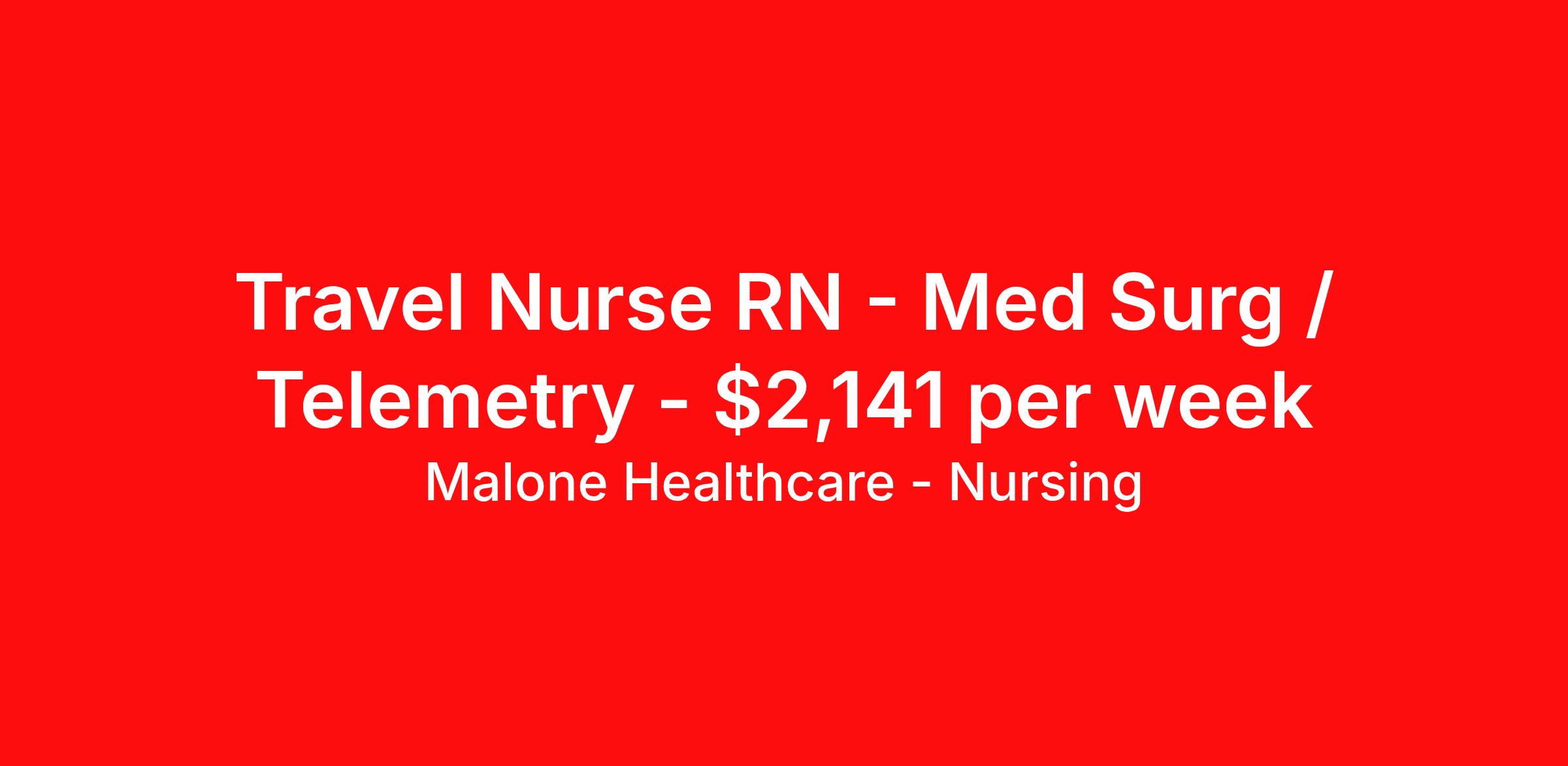Malone Healthcare - Nursing is seeking a travel nurse RN Med Surg / Telemetry for a travel nursing job in Prescott, Arizona. Job Description & Requirements Specialty: Med Surg / Telemetry Discipline: RN Start Date: 04/08/2026 Duration: 13 weeks 36 hours per week Shift: 12 hours, nights, flexible Employment Type: Travel About Malone Healthcare - Nursing With a commitment to providing a higher standard of service and experience in patient care, Malone Healthcare places expert nurses and allied health professionals in rewarding careers throughout the United States. As a leading healthcare staffing agency, Malone’s focus on compliance and integrity translates to a seamless experience for our team members and partner facilities. When you work with Malone Healthcare, you can rely on over 50 years of proven experience placing exceptional professionals in quality healthcare settings. Benefits Weekly pay Holiday Pay Guaranteed Hours Continuing Education 401k retirement plan Pet insurance Referral bonus Medical benefits Dental benefits Vision benefits License and certification reimbursement Life insurance