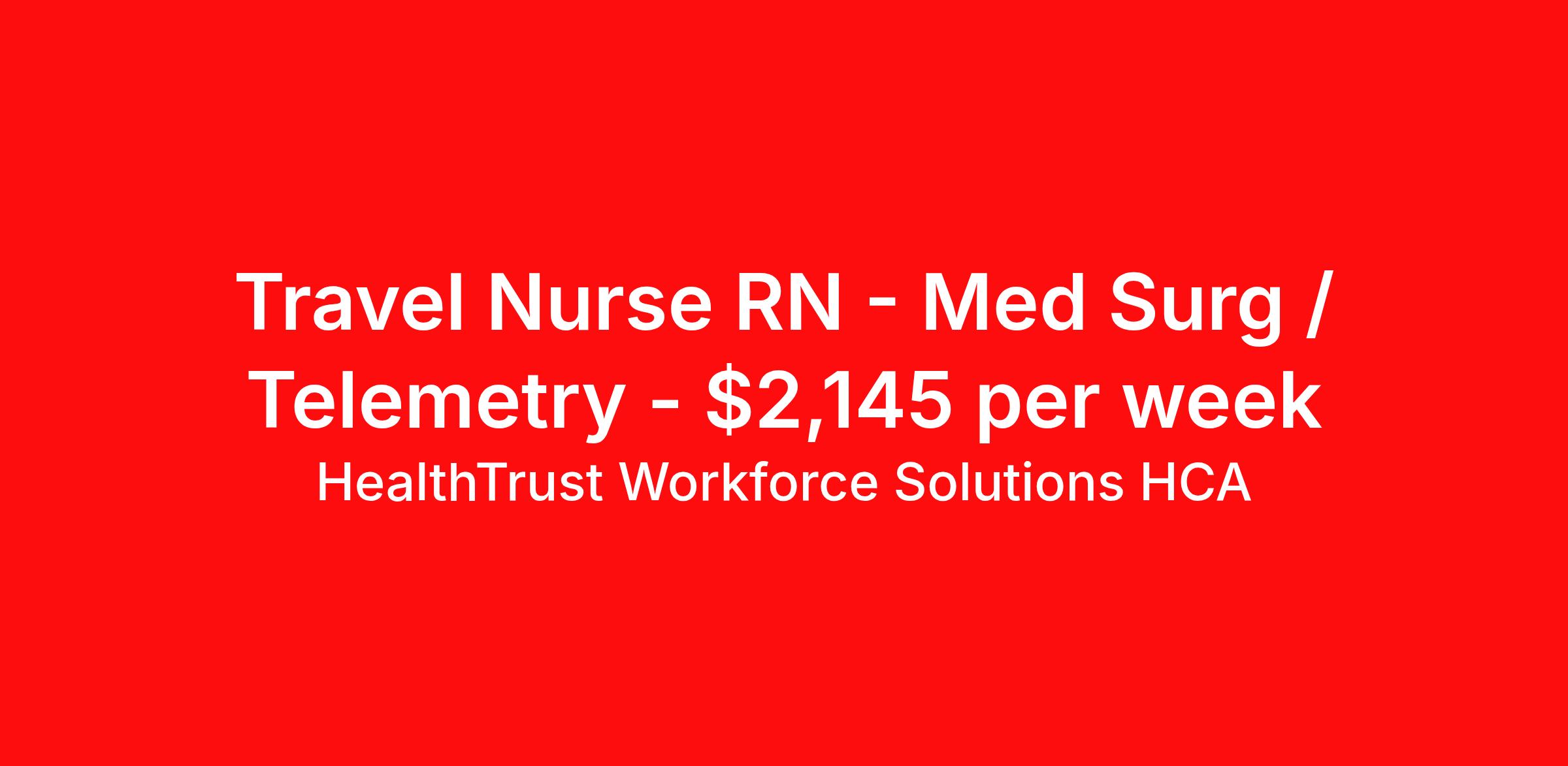 HealthTrust Workforce Solutions HCA is seeking a travel nurse RN Med Surg / Telemetry for a travel nursing job in Sierra Vista, Arizona. Job Description & Requirements Specialty: Med Surg / Telemetry Discipline: RN Start Date: 04/20/2026 Duration: 13 weeks 36 hours per week Shift: 12 hours, days, nights Employment Type: Travel About HealthTrust Workforce Solutions HCA At HealthTrust Workforce Solutions, healthcare is not just about the four walls of a facility but about the people who provide and receive care. Our focus is on empowering healthcare professionals to deliver exceptional patient experiences by providing them with the necessary skills, tools, and support. We partner with healthcare facilities nationwide to ensure that the right professionals are in the right roles. We prioritize our clinicians by giving them a voice and access to opportunities to fulfill their mission of improving lives by providing quality patient care. We are committed to our core values of Trust, Innovation, Adaptability, Courage, and Accountability. We are dedicated to positively impacting the healthcare industry by providing first-priority access to more than 200,000 jobs nationwide to our healthcare professionals. Join us and be part of the HealthTrust family, where you can make a difference every day. We embrace our changing environment, and we maintain a culture that has a rich tradition of transforming itself to meet the challenges of the future. MISSION STATEMENT While putting great people in the right roles is essential, our mission is far greater. We want our clinicians to be part of the HealthTrust family, where healthcare professionals have a voice and are empowered with the right tools and opportunities to fulfill their personal mission of improving lives. Plus, as a preferred partner to thousands of top-performing hospitals, we provide our healthcare professionals with first-priority access to more than 200,000 jobs nationwide. Benefits Dental benefits Vision benefits Referral bonus Continuing Education Life insurance
