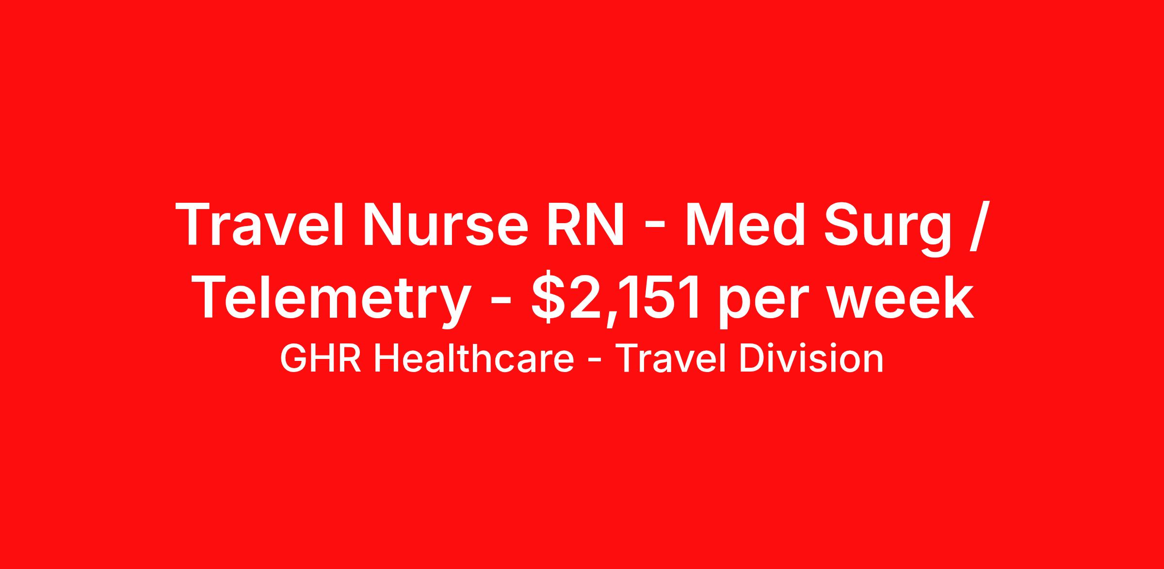 GHR Healthcare - Travel Division is seeking a travel nurse RN Med Surg / Telemetry for a travel nursing job in Columbus, Ohio. Job Description & Requirements Specialty: Med Surg / Telemetry Discipline: RN Start Date: 04/13/2026 Duration: 13 weeks 36 hours per week Shift: 12 hours, nights Employment Type: Travel About GHR Healthcare - Travel Division For over 30 years, GHR Healthcare has been the bridge between healthcare professionals and the facilities that need them nationwide. We're committed to uncovering your ideal fit, supported by GHR's dedication to competitive compensation, transparent communication, and a devoted team that genuinely cares about your career journey. You can trust us to stand by your side as your advocate, confidante, and partner in advancing your career. At GHR, care and consideration are at the heart of everything we do. Visit ghrhealthcare.com to learn more.