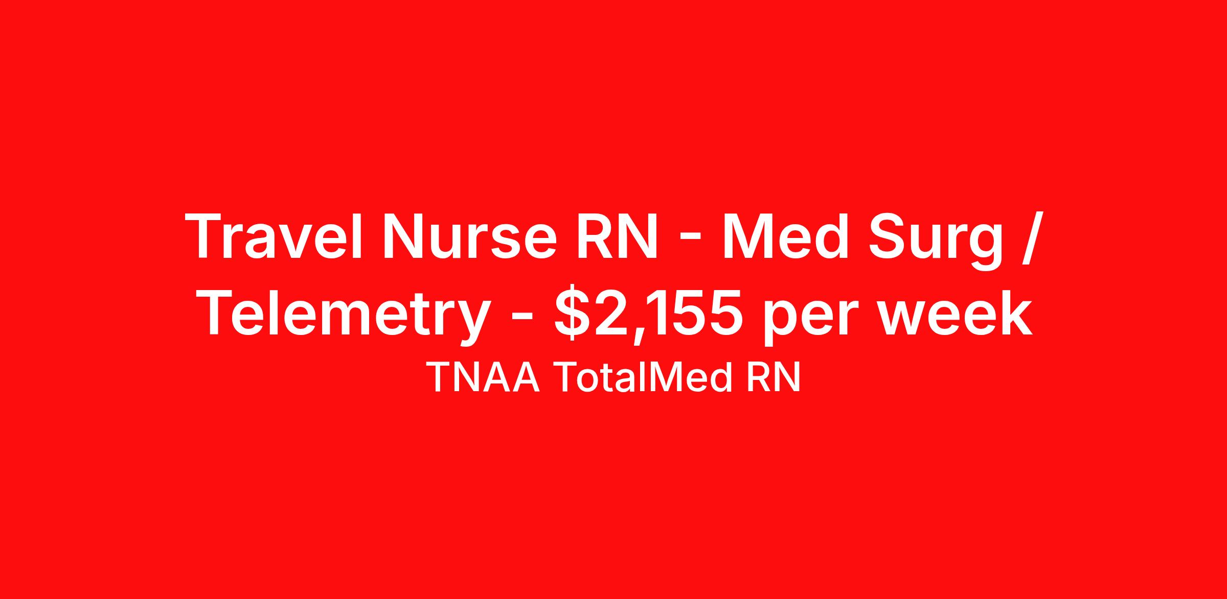 TNAA TotalMed RN is seeking a travel nurse RN Med Surg / Telemetry for a travel nursing job in Yakima, Washington. Job Description & Requirements Specialty: Med Surg / Telemetry Discipline: RN Start Date: 03/23/2026 Duration: 13 weeks 36 hours per week Shift: 12 hours, nights Employment Type: Travel About TNAA TotalMed RN TotalMed is a Top Ten, travel nursing and healthcare staffing agency with the mission of igniting purpose in healthcare. The organization staffs nurses, therapists, pharmacists, and other clinicians of all specialties in all 50 states. They offer local and travel jobs and match caregivers with the right organization to assist both facilities and patients. As an organization, they focus on putting highly-skilled staff into facilities to ensure adequate staffing for a better patient experience. TotalMed specializes in recruiting and placing healthcare professionals in travel, PRN, and permanent positions across the country in Nursing and Allied Health. Throughout 2020, the organization filled roles at even the most short-staffed facilities during the most challenging time in healthcare. By matching the right travel healthcare professional with the right organization, TotalMed continues to offer a lifeline to facilities and their patients. Benefits Weekly pay Guaranteed Hours Continuing Education 401k retirement plan Sick pay Wellness and fitness programs Referral bonus Employee assistance programs Medical benefits Dental benefits Vision benefits Benefits start day 1