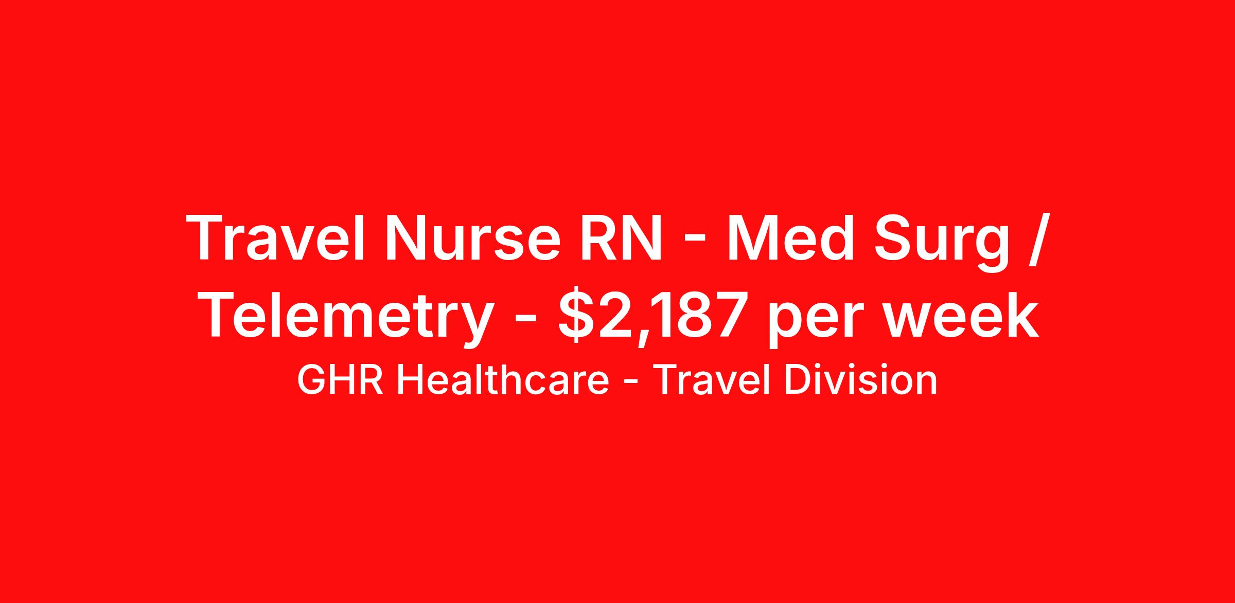GHR Healthcare - Travel Division is seeking a travel nurse RN Med Surg / Telemetry for a travel nursing job in Allentown, Pennsylvania. Job Description & Requirements Specialty: Med Surg / Telemetry Discipline: RN Start Date: 04/13/2026 Duration: 13 weeks 36 hours per week Shift: 12 hours, nights Employment Type: Travel About GHR Healthcare - Travel Division For over 30 years, GHR Healthcare has been the bridge between healthcare professionals and the facilities that need them nationwide. We're committed to uncovering your ideal fit, supported by GHR's dedication to competitive compensation, transparent communication, and a devoted team that genuinely cares about your career journey. You can trust us to stand by your side as your advocate, confidante, and partner in advancing your career. At GHR, care and consideration are at the heart of everything we do. Visit ghrhealthcare.com to learn more.