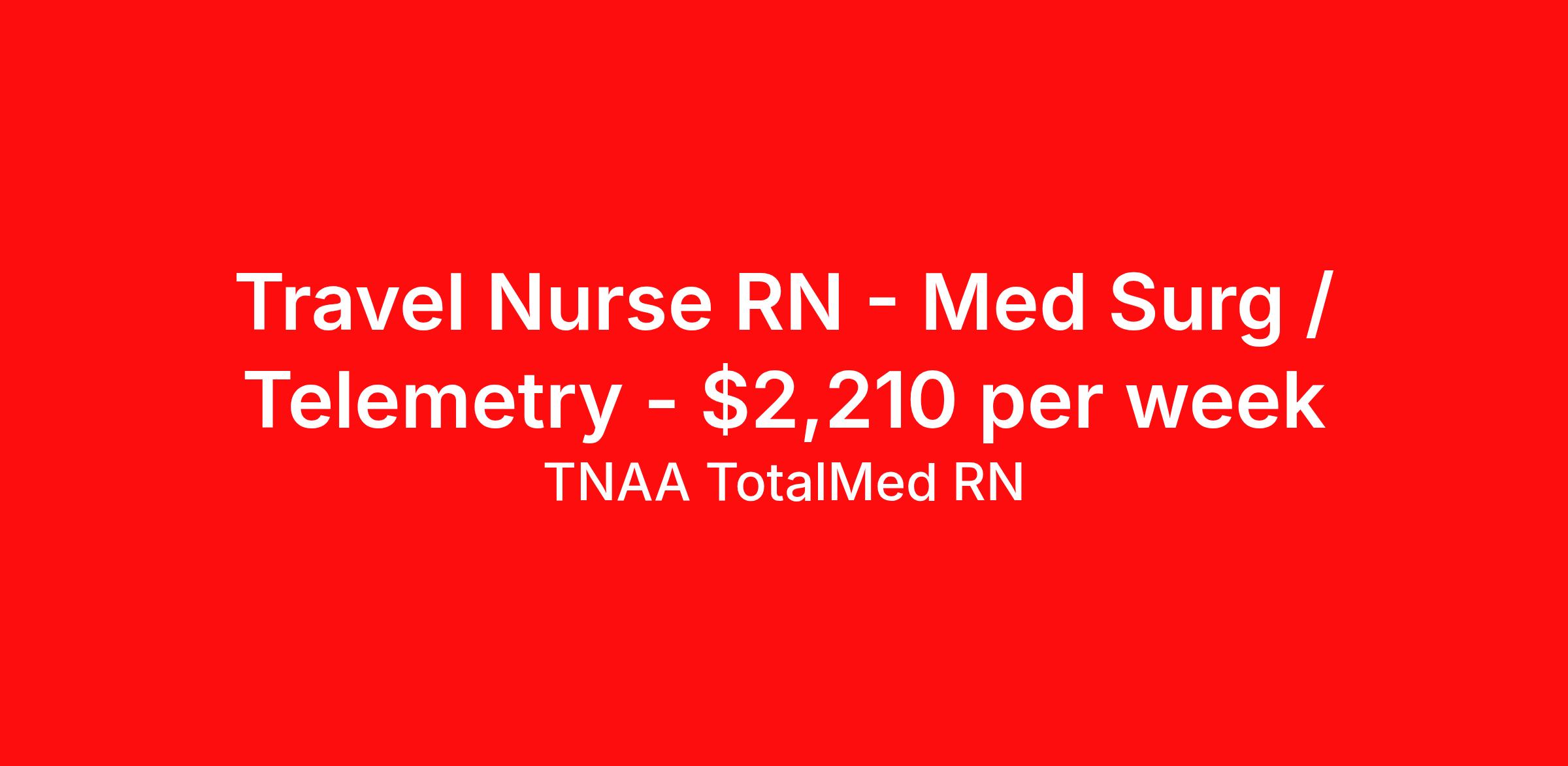 TNAA TotalMed RN is seeking a travel nurse RN Med Surg / Telemetry for a travel nursing job in Newburgh, Indiana. Job Description & Requirements Specialty: Med Surg / Telemetry Discipline: RN Start Date: 04/13/2026 Duration: 13 weeks 36 hours per week Shift: 12 hours, nights Employment Type: Travel This position is looking to interview quickly! If this isn’t what you’re looking for please let me know, we have openings nationwide. Or Send referrals! Each one is worth $1,000! If you’d like to reach out to me personally 9 2 0 7 5 0 7 6 2 2 This position is looking to interview quickly! If this isn’t what you’re looking for please let me know, we have openings nationwide. Or Send referrals! Each one is worth $1,000! If you’d like to reach out to me personally 9 2 0 7 5 0 7 6 2 2 About TNAA TotalMed RN TotalMed is a Top Ten, travel nursing and healthcare staffing agency with the mission of igniting purpose in healthcare. The organization staffs nurses, therapists, pharmacists, and other clinicians of all specialties in all 50 states. They offer local and travel jobs and match caregivers with the right organization to assist both facilities and patients. As an organization, they focus on putting highly-skilled staff into facilities to ensure adequate staffing for a better patient experience. TotalMed specializes in recruiting and placing healthcare professionals in travel, PRN, and permanent positions across the country in Nursing and Allied Health. Throughout 2020, the organization filled roles at even the most short-staffed facilities during the most challenging time in healthcare. By matching the right travel healthcare professional with the right organization, TotalMed continues to offer a lifeline to facilities and their patients. Benefits Weekly pay Guaranteed Hours Continuing Education 401k retirement plan Sick pay Wellness and fitness programs Referral bonus Employee assistance programs Medical benefits Dental benefits Vision benefits Benefits start day 1