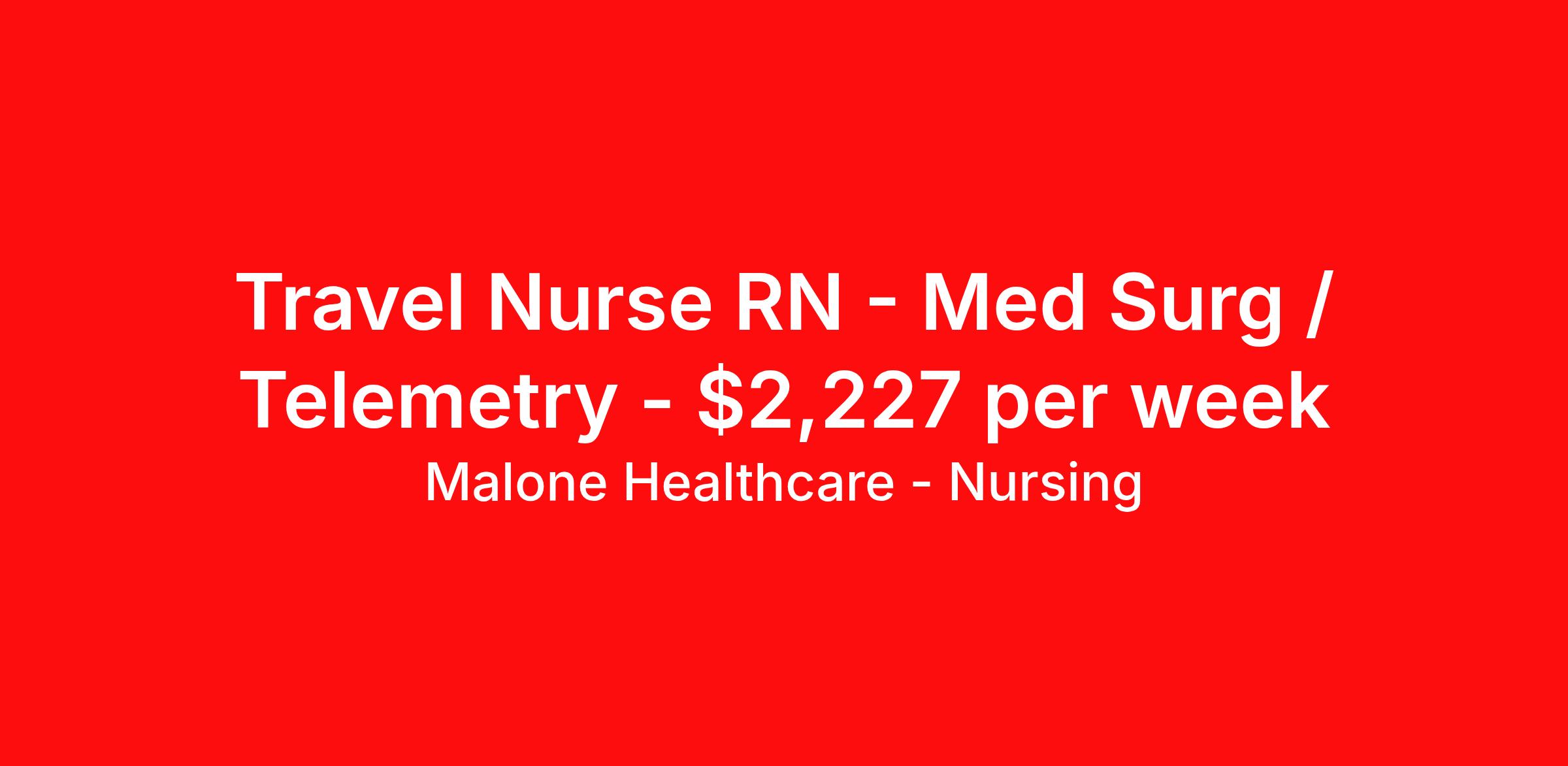 Malone Healthcare - Nursing is seeking a travel nurse RN Med Surg / Telemetry for a travel nursing job in Sioux City, Iowa. Job Description & Requirements Specialty: Med Surg / Telemetry Discipline: RN Start Date: 03/25/2026 Duration: 13 weeks 36 hours per week Shift: 12 hours, nights Employment Type: Travel About Malone Healthcare - Nursing With a commitment to providing a higher standard of service and experience in patient care, Malone Healthcare places expert nurses and allied health professionals in rewarding careers throughout the United States. As a leading healthcare staffing agency, Malone’s focus on compliance and integrity translates to a seamless experience for our team members and partner facilities. When you work with Malone Healthcare, you can rely on over 50 years of proven experience placing exceptional professionals in quality healthcare settings. Benefits Weekly pay Holiday Pay Guaranteed Hours Continuing Education 401k retirement plan Pet insurance Referral bonus Medical benefits Dental benefits Vision benefits License and certification reimbursement Life insurance