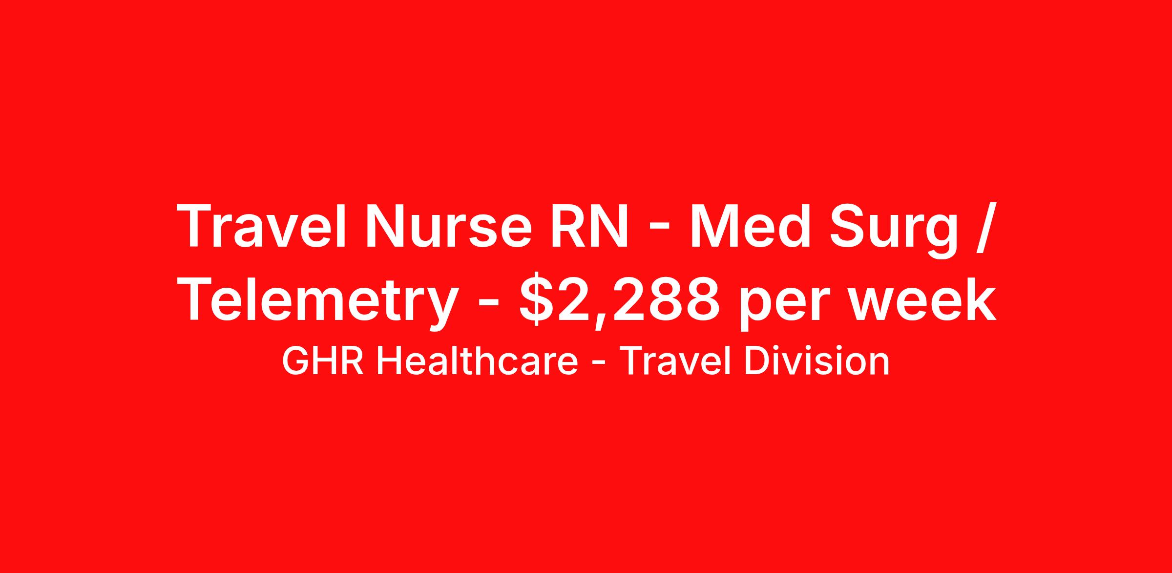 GHR Healthcare - Travel Division is seeking a travel nurse RN Med Surg / Telemetry for a travel nursing job in Pennington, New Jersey. Job Description & Requirements Specialty: Med Surg / Telemetry Discipline: RN Start Date: 03/31/2026 Duration: 9 weeks 36 hours per week Shift: 12 hours, nights Employment Type: Travel About GHR Healthcare - Travel Division For over 30 years, GHR Healthcare has been the bridge between healthcare professionals and the facilities that need them nationwide. We're committed to uncovering your ideal fit, supported by GHR's dedication to competitive compensation, transparent communication, and a devoted team that genuinely cares about your career journey. You can trust us to stand by your side as your advocate, confidante, and partner in advancing your career. At GHR, care and consideration are at the heart of everything we do. Visit ghrhealthcare.com to learn more.
