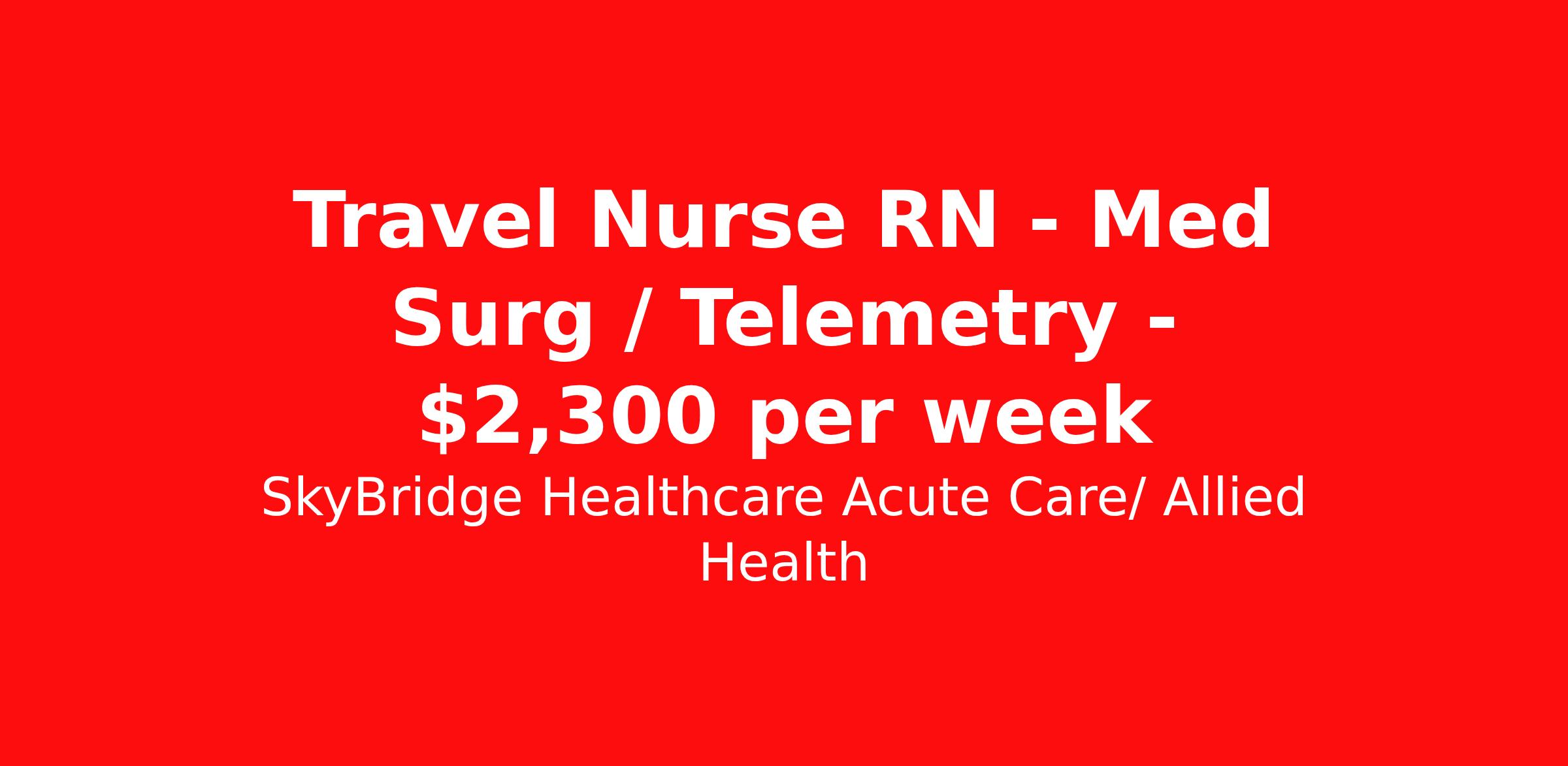 SkyBridge Healthcare Acute Care/ Allied Health is seeking a travel nurse RN Med Surg / Telemetry for a travel nursing job in Olathe, Kansas. Job Description & Requirements Specialty: Med Surg / Telemetry Discipline: RN Duration: 13 weeks 36 hours per week Shift: 12 hours, nights Employment Type: Travel SkyBridge Healthcare Acute Care/ Allied Health Job ID NV38121536. Pay package is based on 12 hour shifts and 36 hours per week (subject to confirmation) with tax-free stipend amount to be determined. About SkyBridge Healthcare Acute Care/ Allied Health It is our mission at SkyBridge Healthcare to connect professionals within the healthcare community through both genuine relationships and quality work. We understand the demands of healthcare positions which is why we want to give back to Healthcare Professionals who give so much to their communities. We’re partnered with some of the greatest facilities in the nation, therefore we ensure our Healthcare Professionals will receive top-notch treatment every step of the way. Our specialties include Nursing, Allied Health, Laboratory, Therapy, Healthcare Information Technology, and Revenue Cycle. Follow us on social media to stay in the know of our latest company updates and job postings. Benefits Weekly pay Holiday Pay Guaranteed Hours Vision benefits 401k retirement plan License and certification reimbursement Mileage reimbursement Referral bonus Employee assistance programs Medical benefits Life insurance Dental benefits